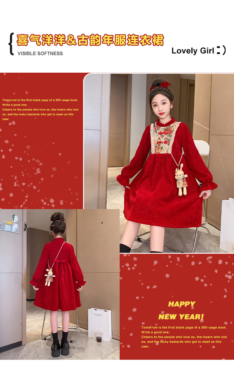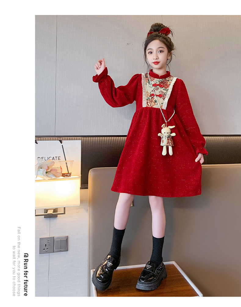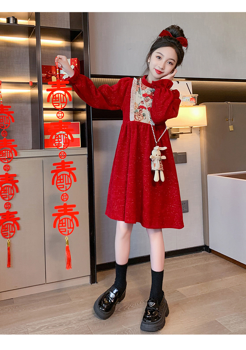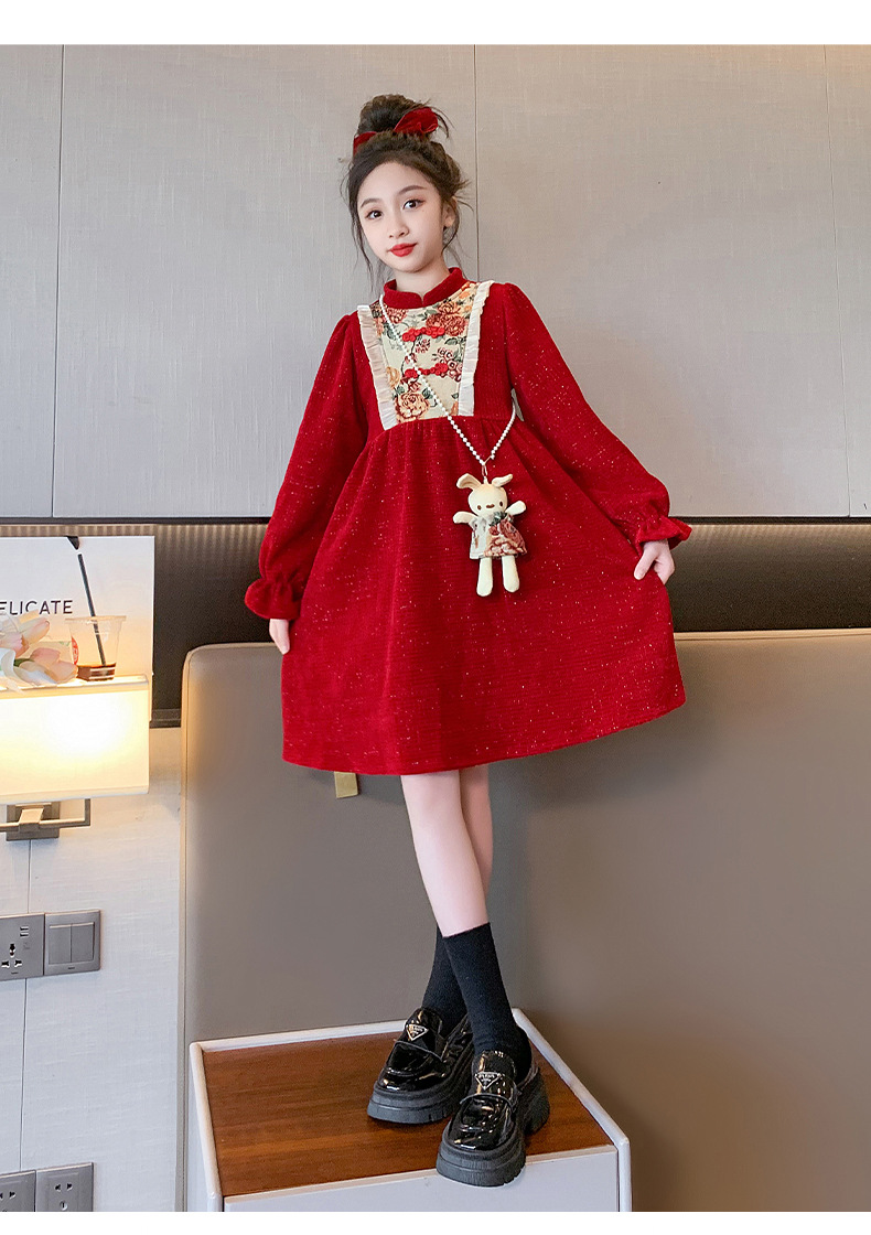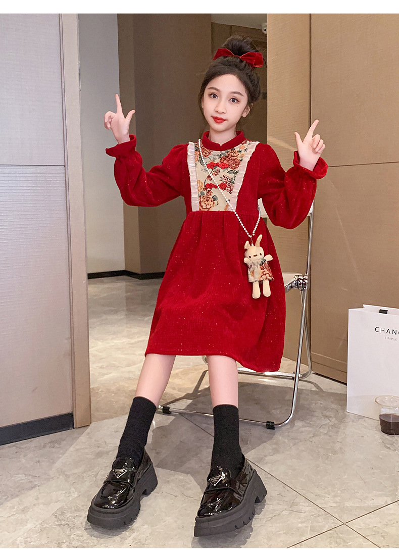 女童秋冬加绒连衣裙儿童拜年服新年装红色公主裙大童礼服裙丝绒裙