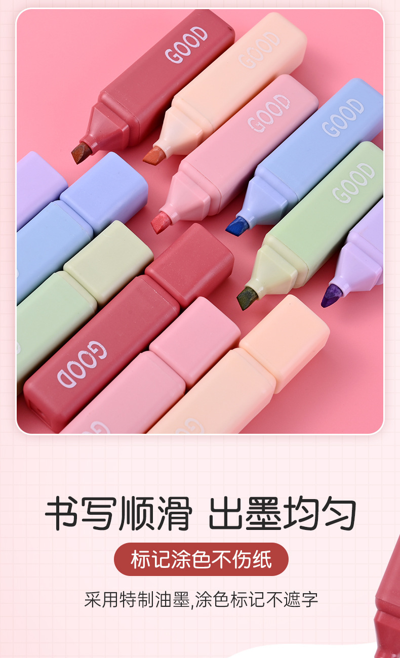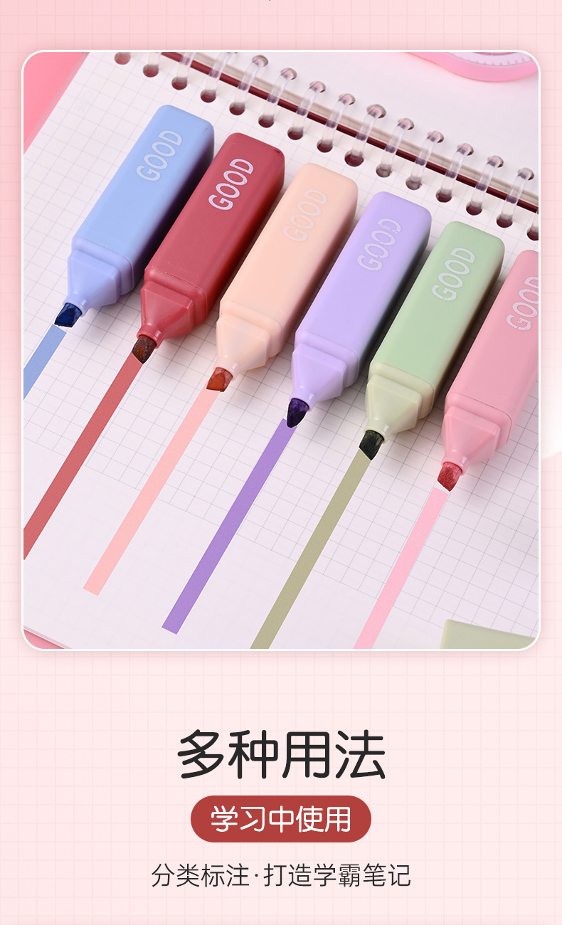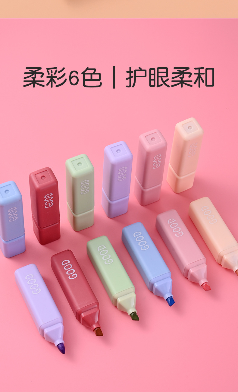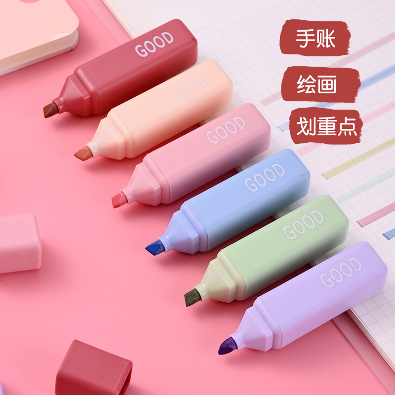 跨境6色荧光笔彩色笔学生标记笔重点淡色护眼莫兰迪手账荧光笔