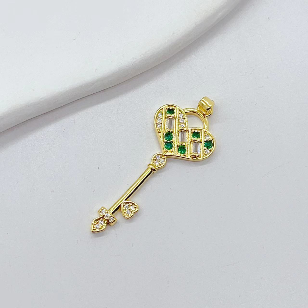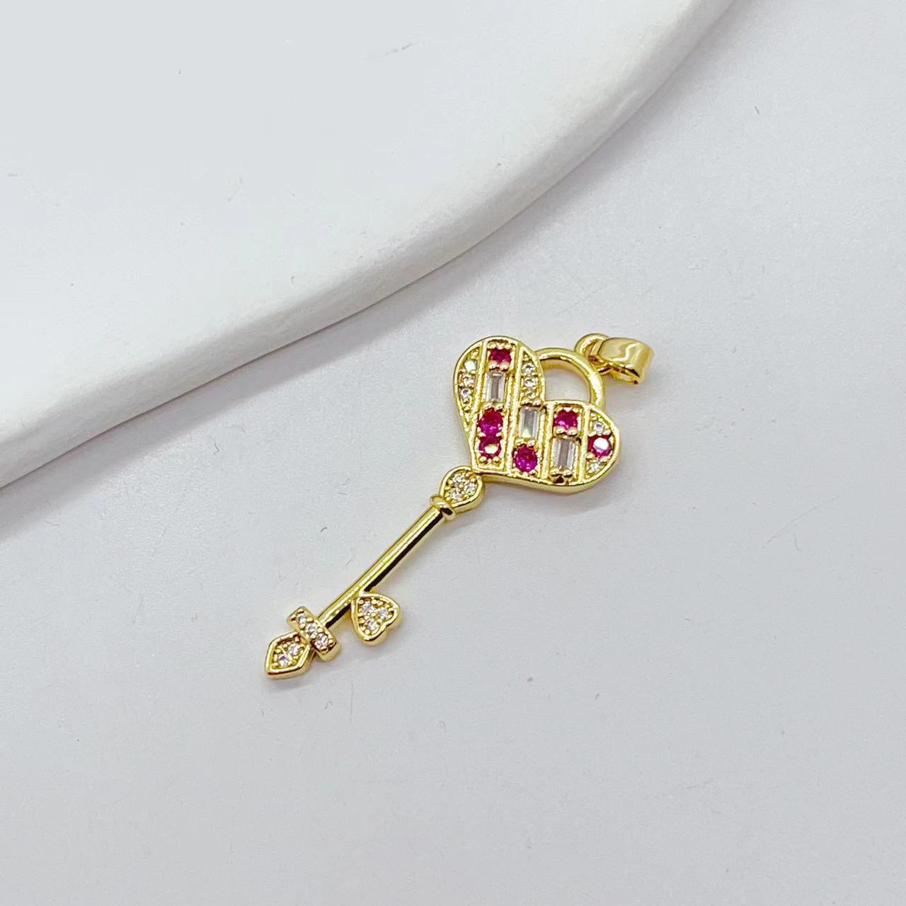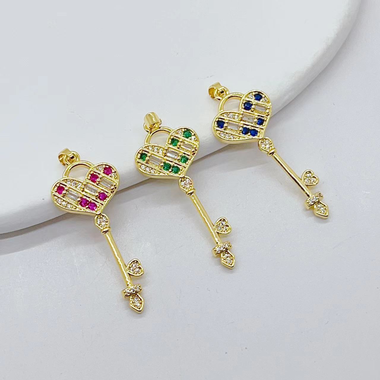 欧美新款铜镀真金桃心爱心钥匙彩色锆石手链项链吊坠DIY挂件