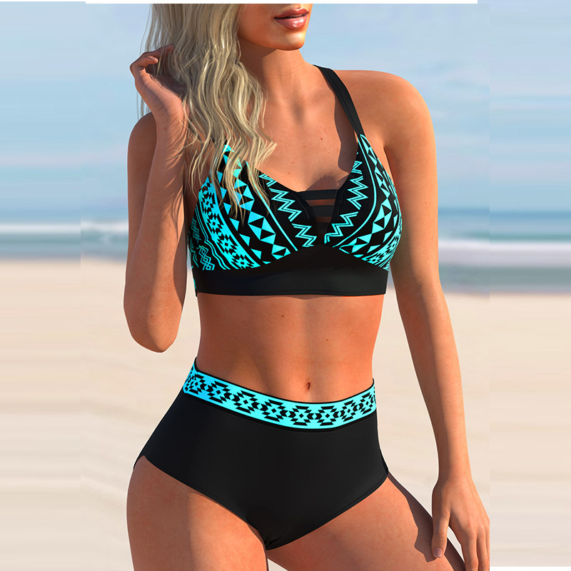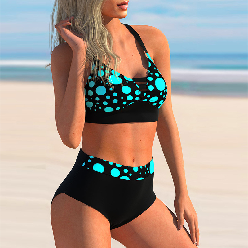 2022欧美比基尼 分体大码泳衣 高腰泳装复古波点交叉女士吊带泳衣