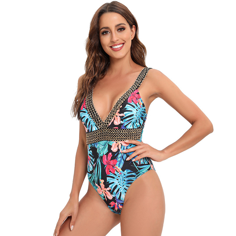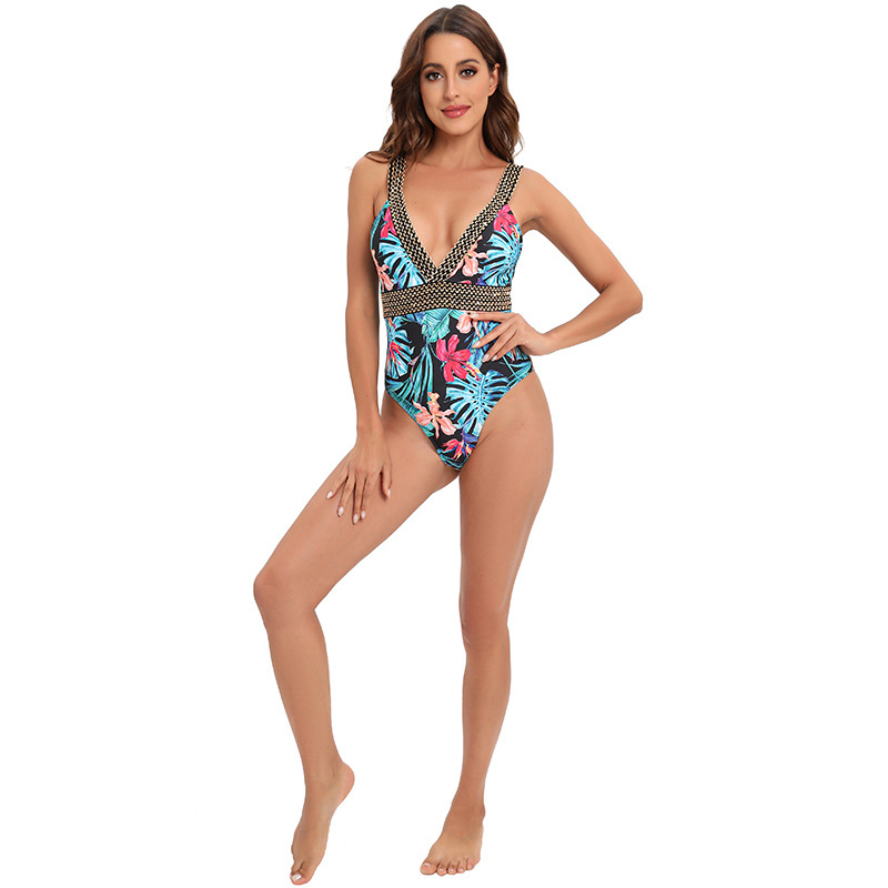新款2023欧美连体泳衣女印花性感大深V比基尼三角亚马逊连体泳装