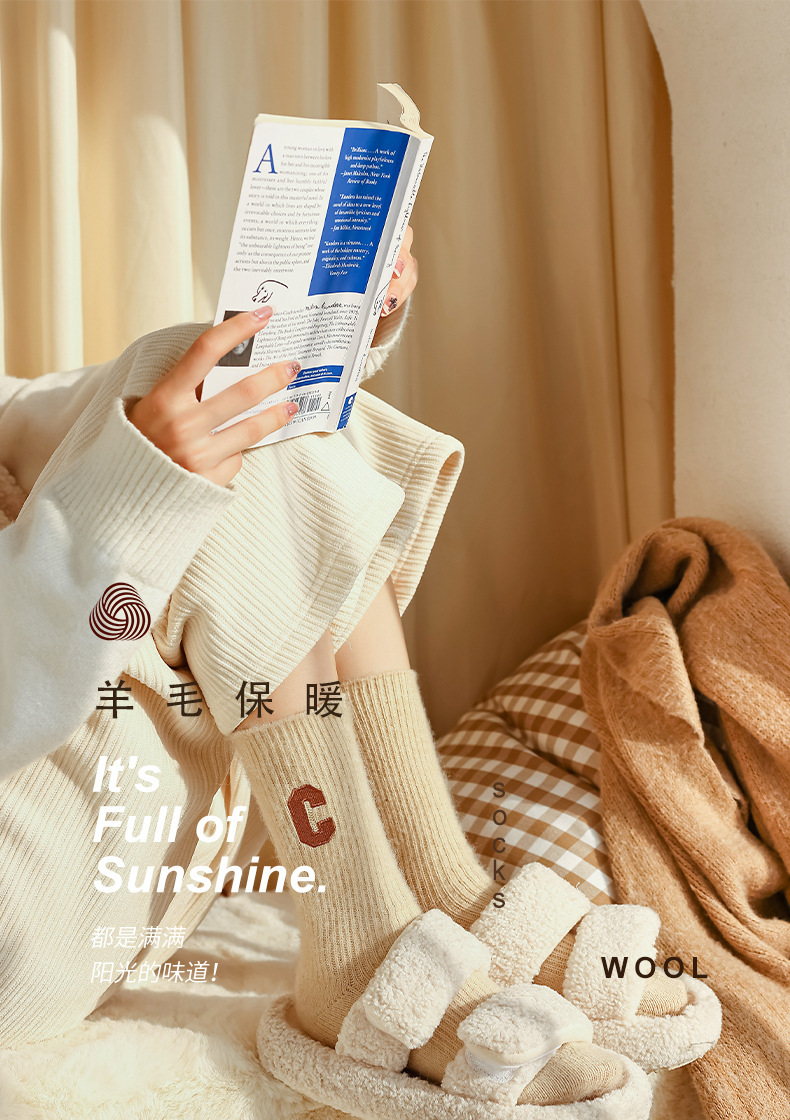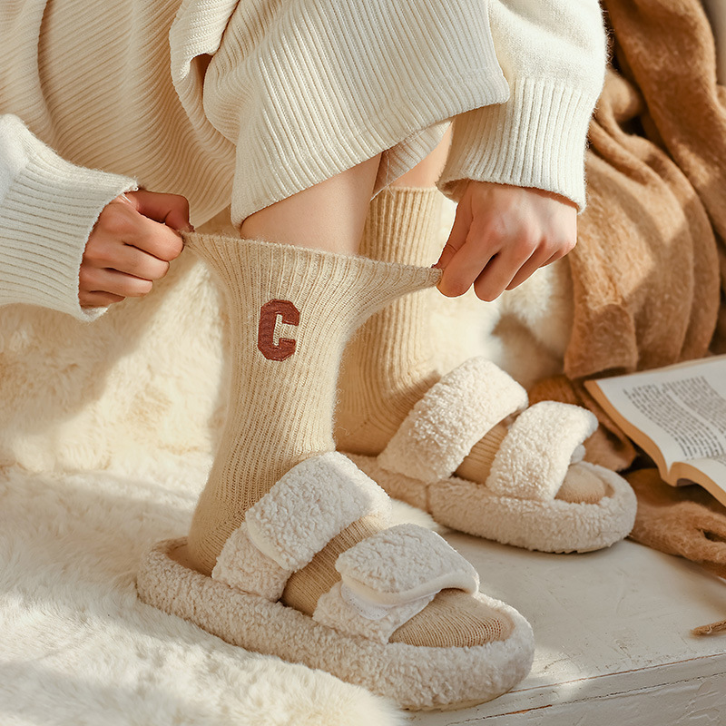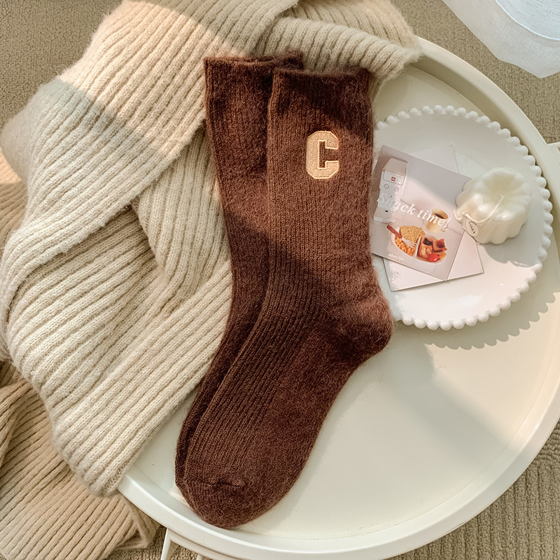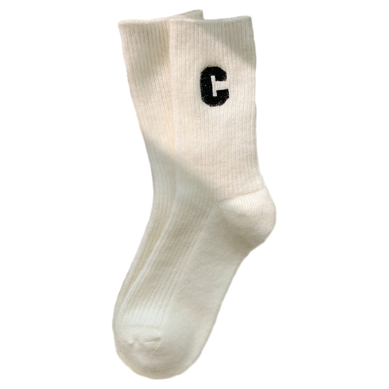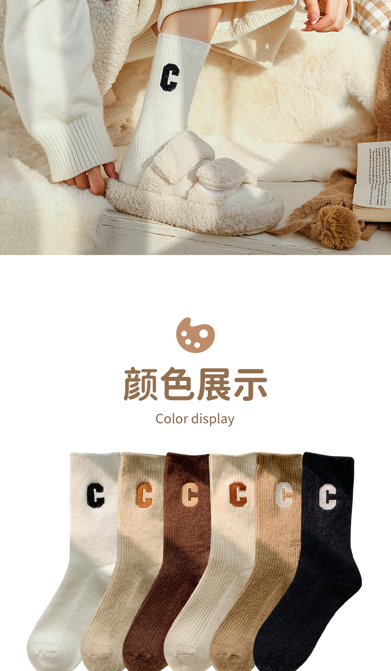 羊毛袜子女堆堆袜秋冬季加绒加厚保暖中筒袜外穿网红字母C长筒袜