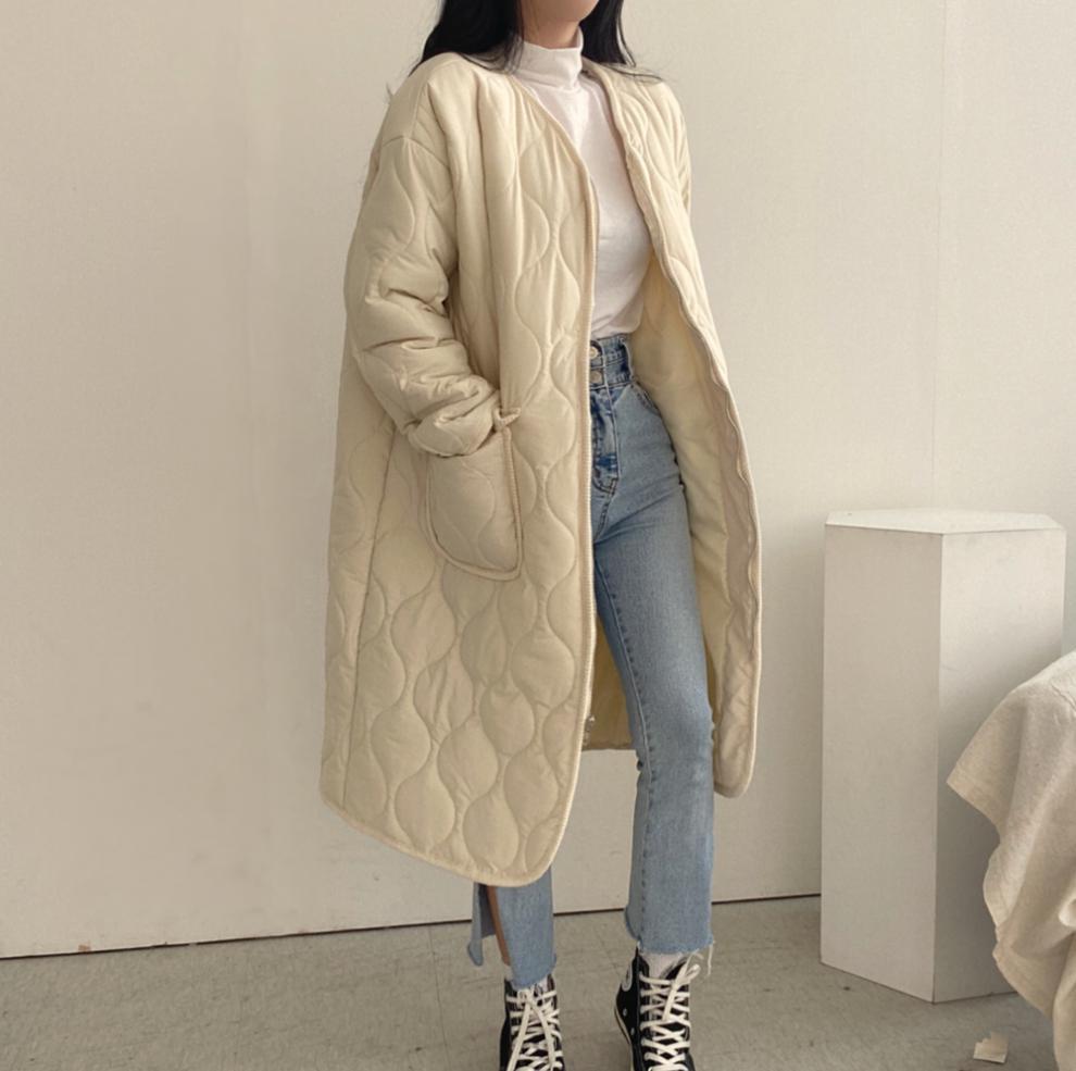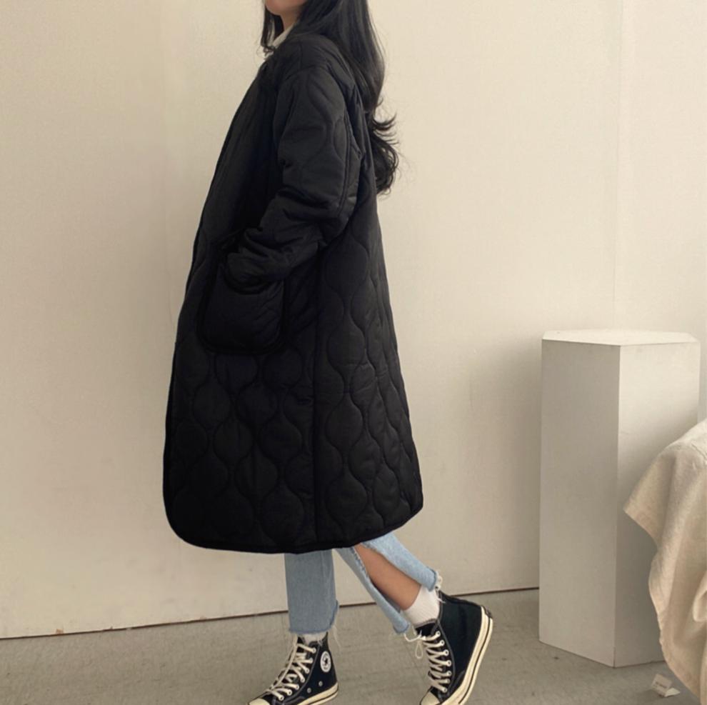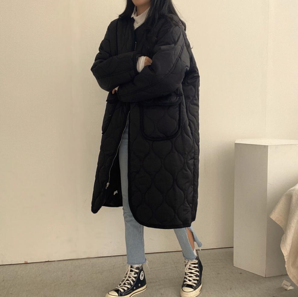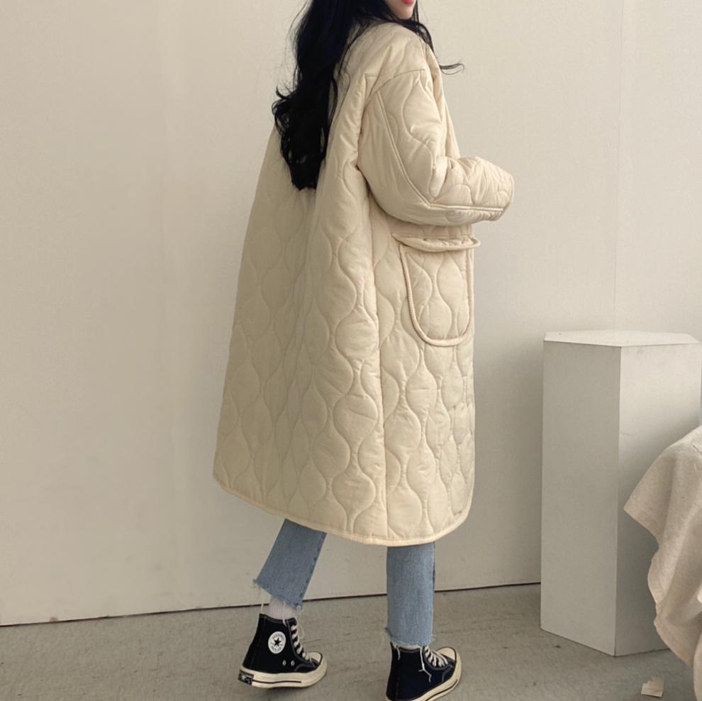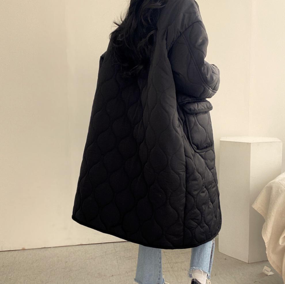韩国chic秋冬复古慵懒风圆领菱格压纹设计拉链式大口袋棉衣外套女