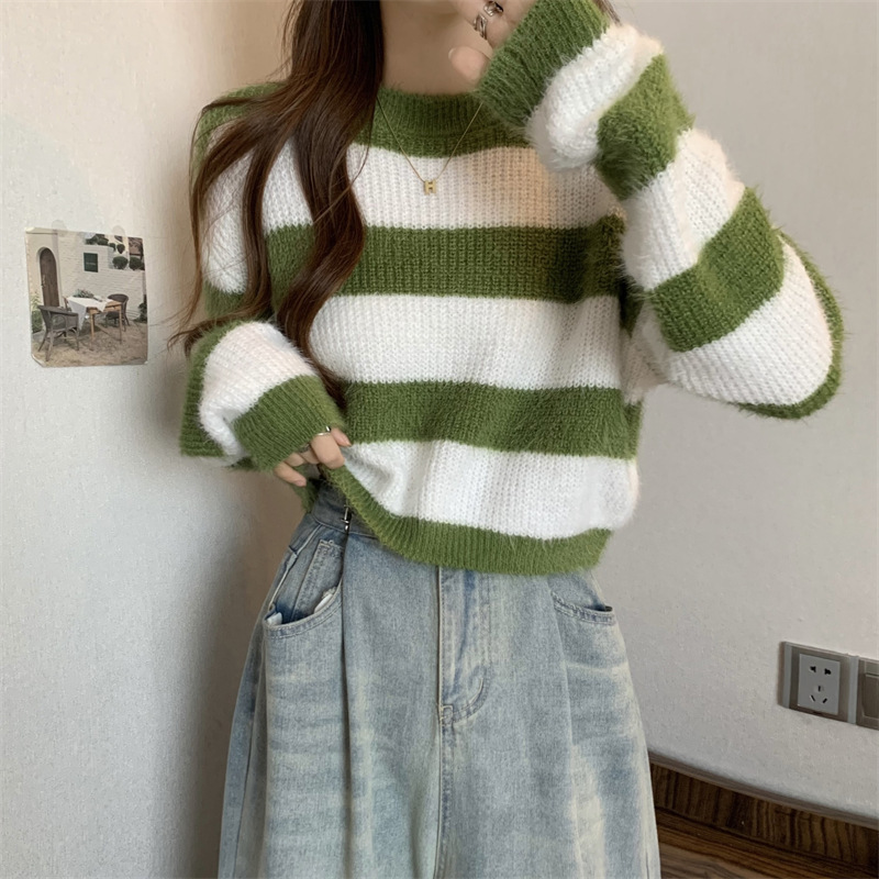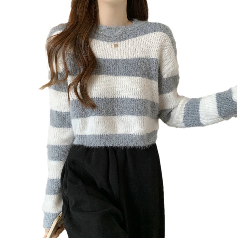 条纹水貂绒毛衣女秋冬宽松长袖慵懒风软糯小个子外穿针织衫上衣潮