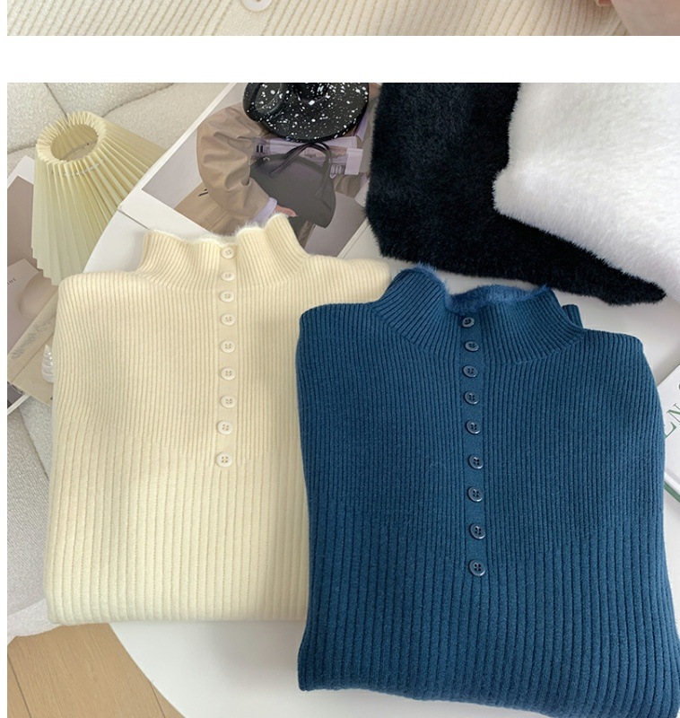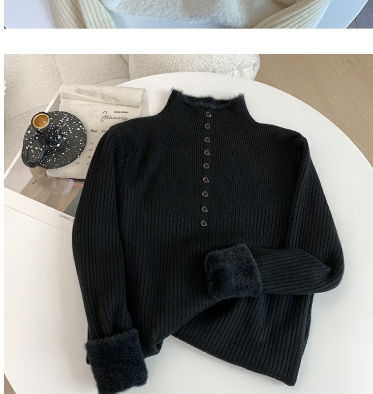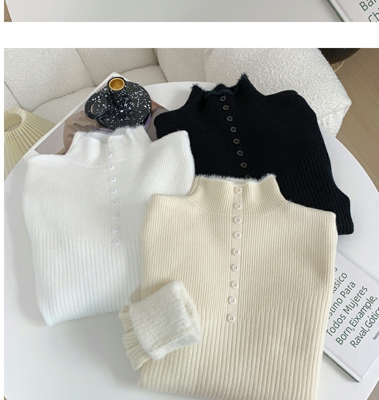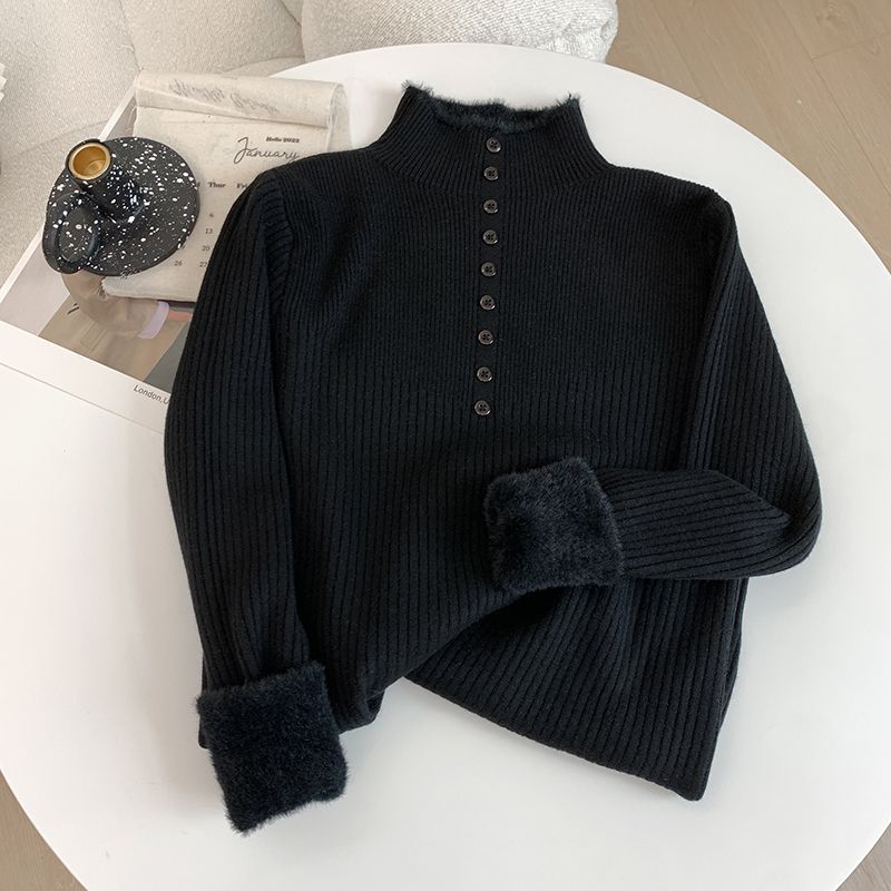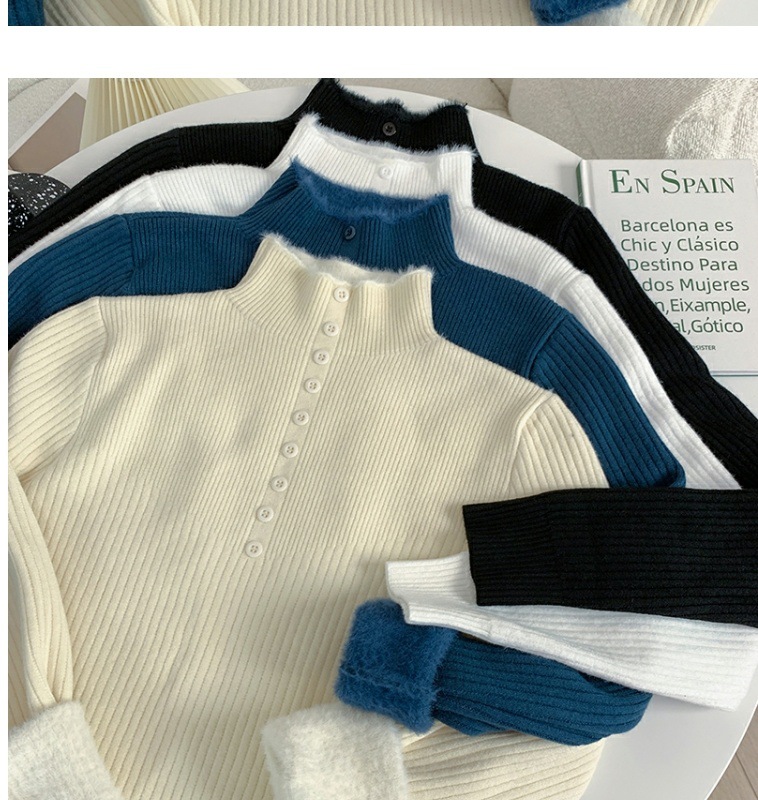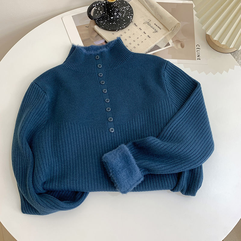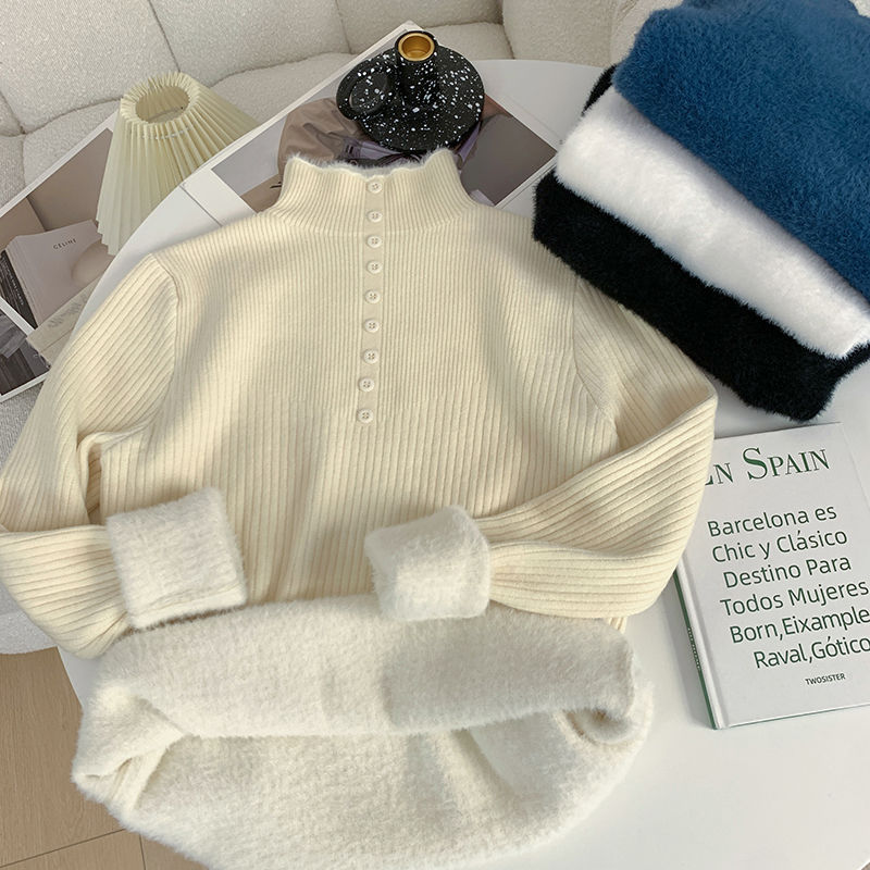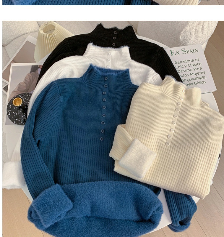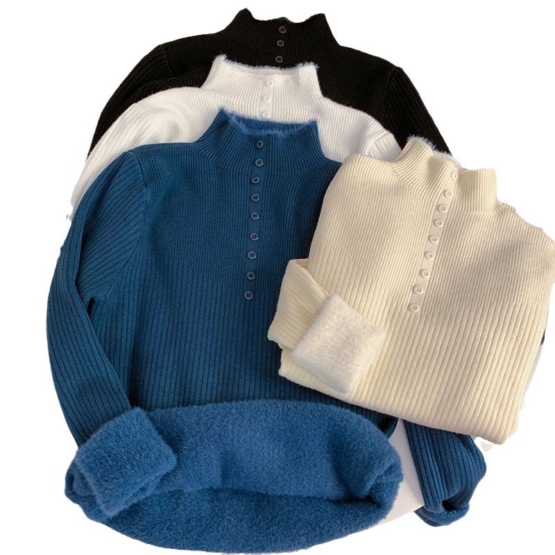 一体绒半高领长袖针织衫毛衣女秋冬季新款韩版加绒加厚打底衫上衣