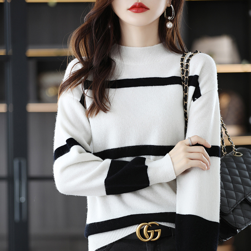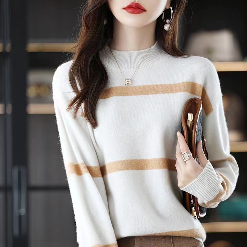 半高领条纹简约针织打底衫女装2023秋冬季新款韩版宽松内搭毛衣女