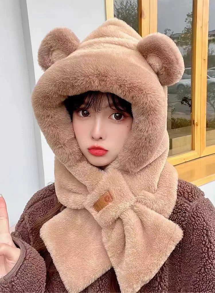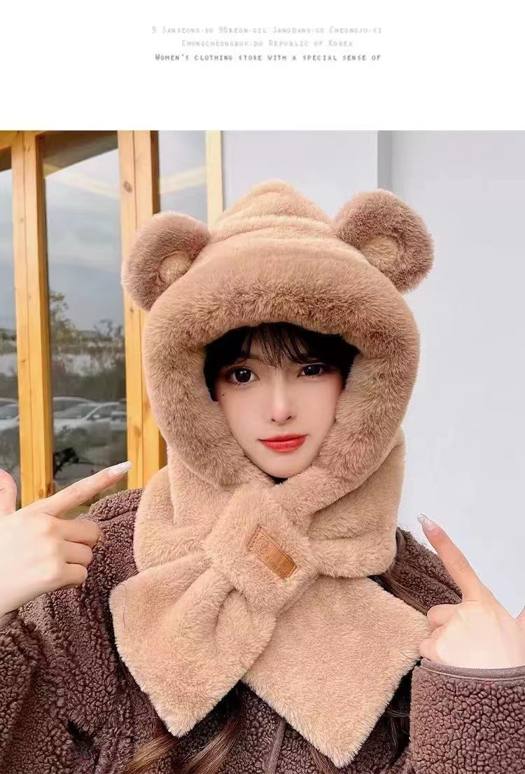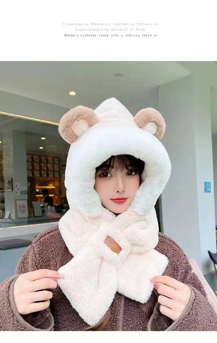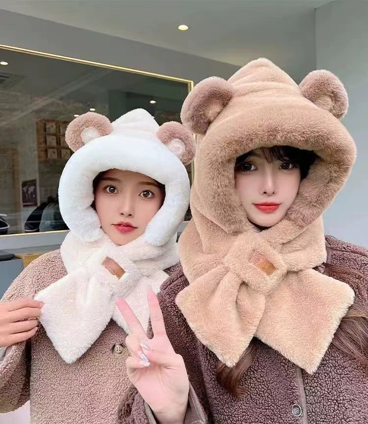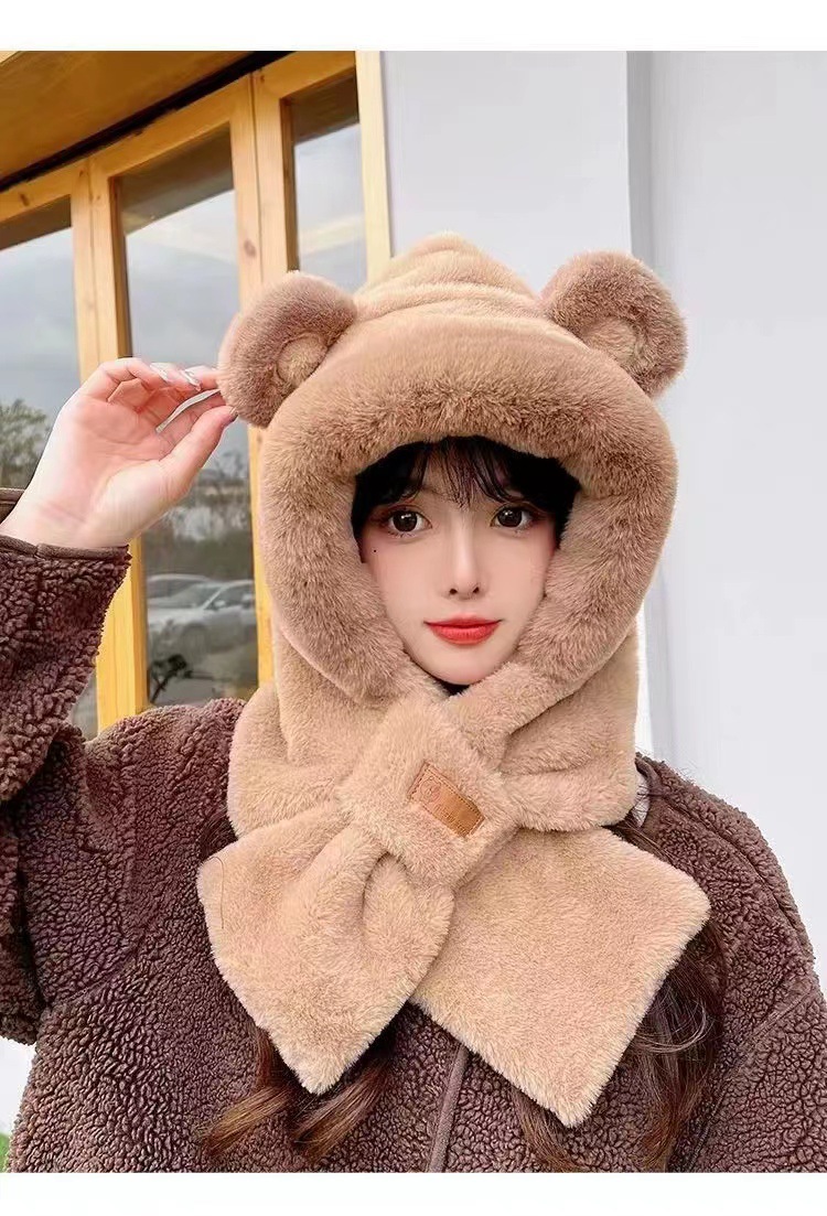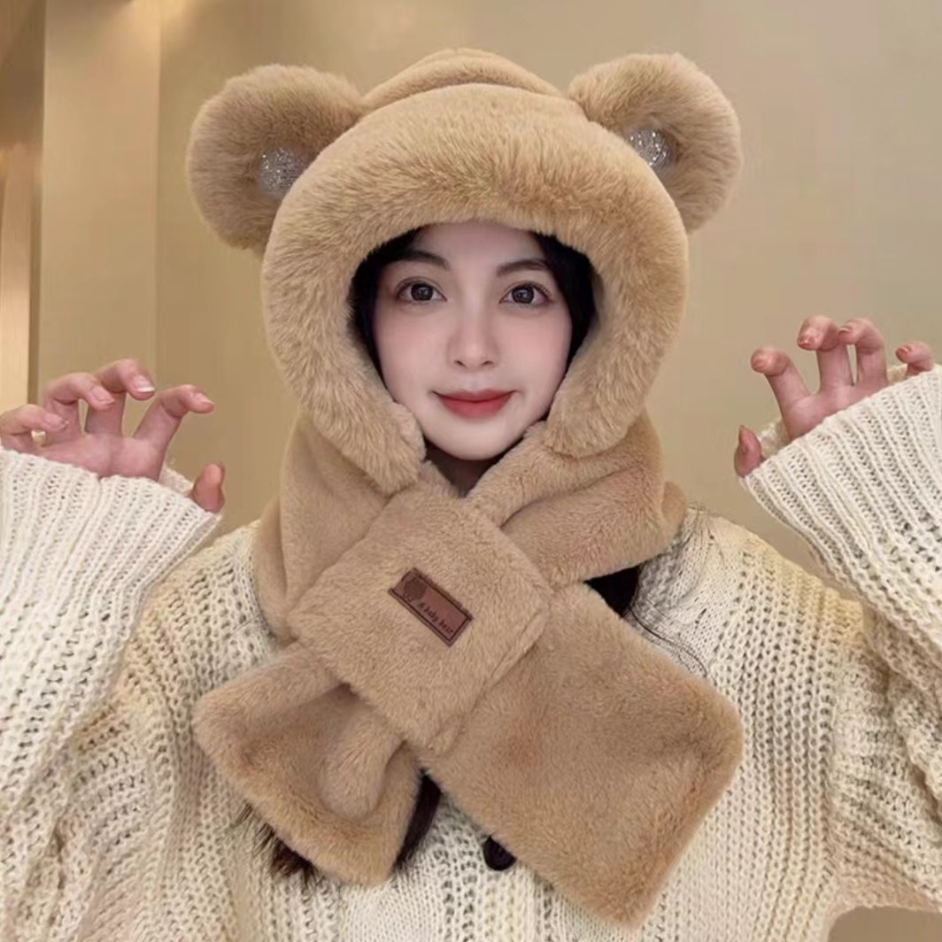 冬季小熊帽子围巾套装女韩版百搭可爱加厚保暖骑行电动车护耳围脖
