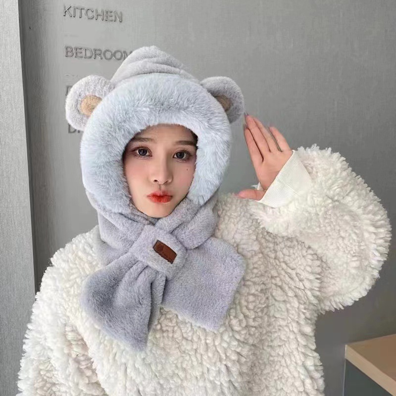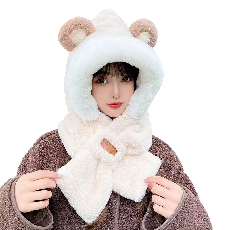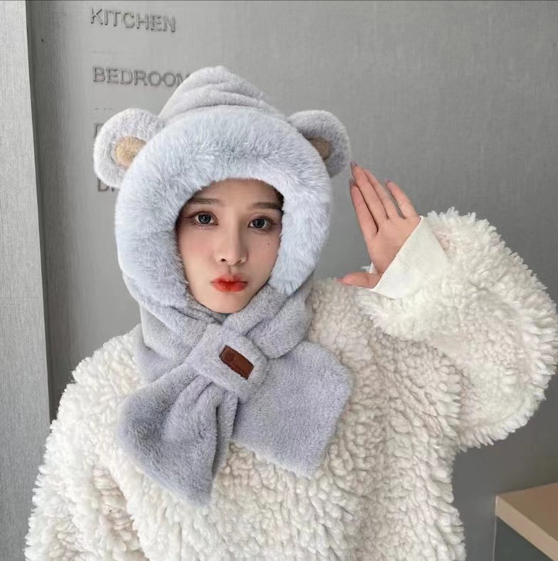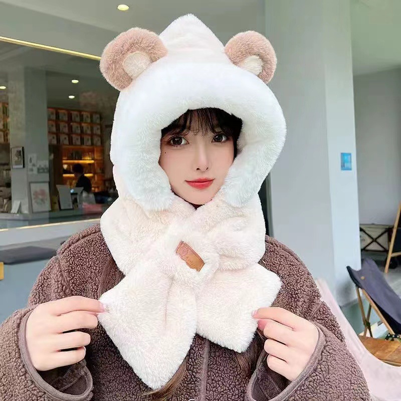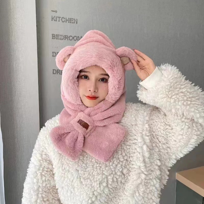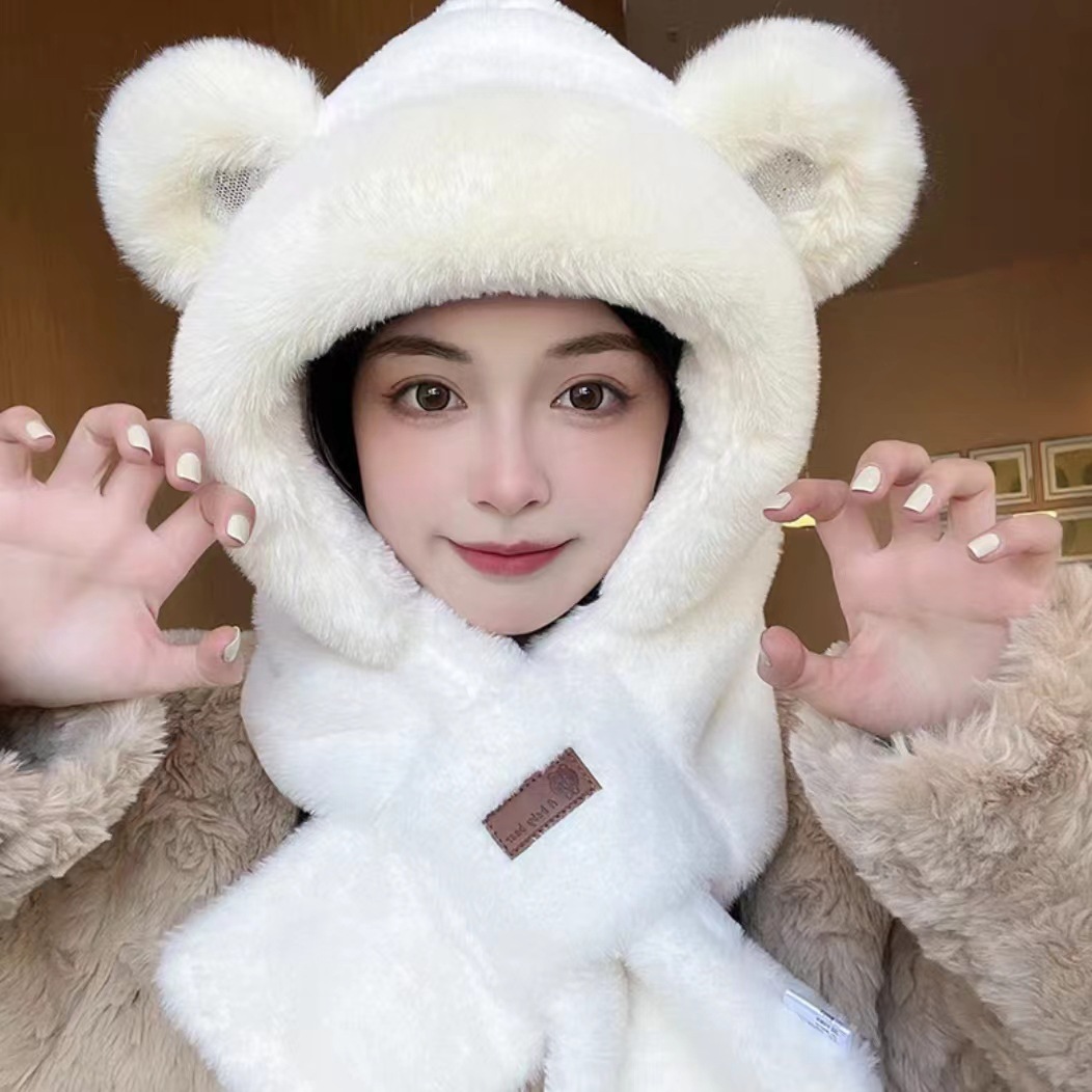 冬季小熊帽子围巾套装女韩版百搭可爱加厚保暖骑行电动车护耳围脖