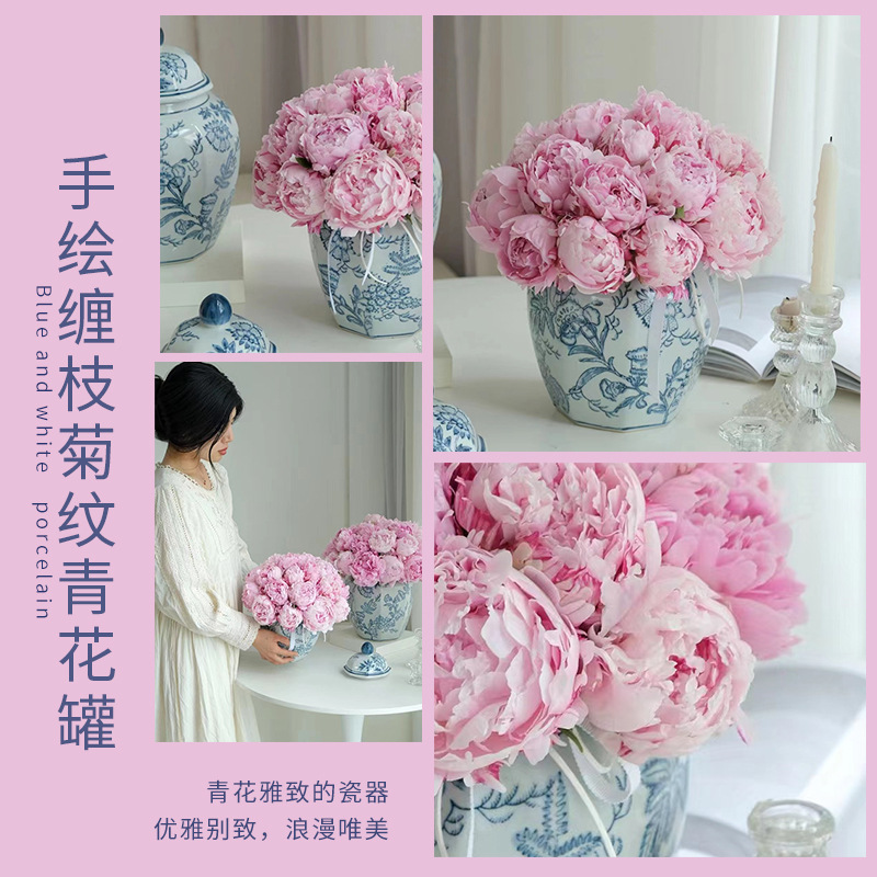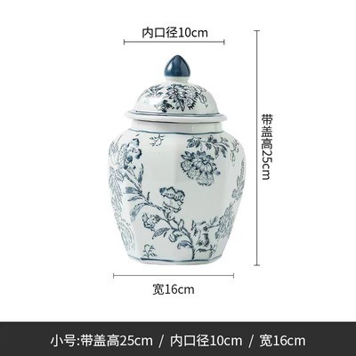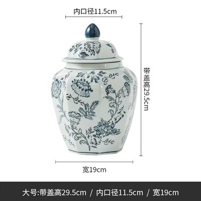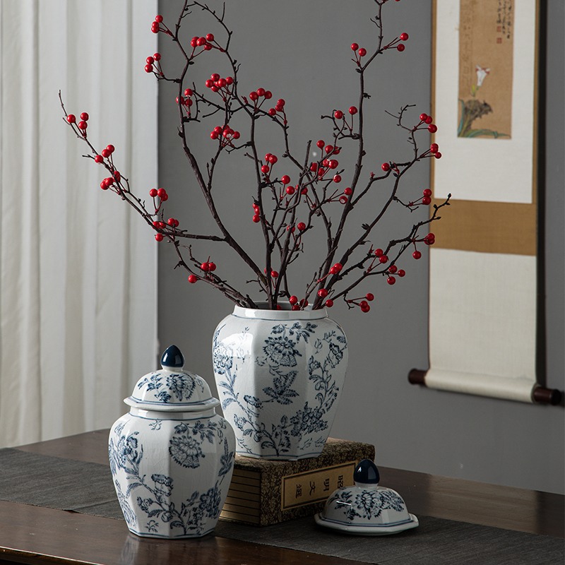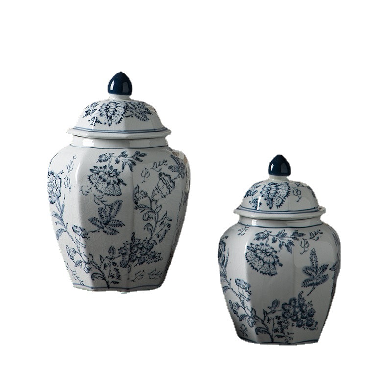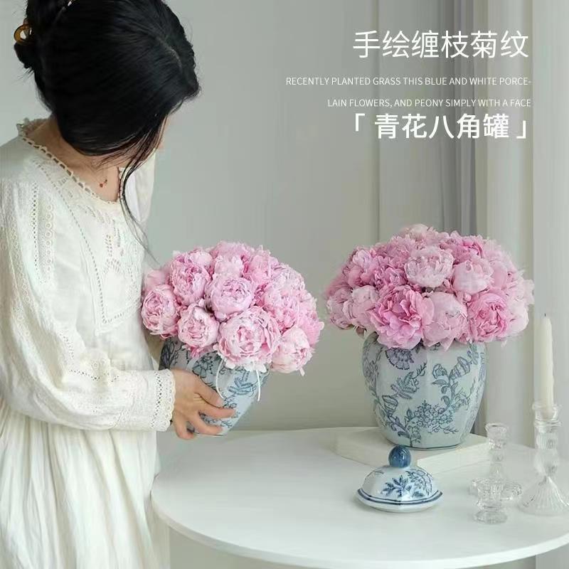 陶瓷花瓶景德镇青花瓷手绘缠枝花纹八角将军罐客厅仿古陶瓷摆件