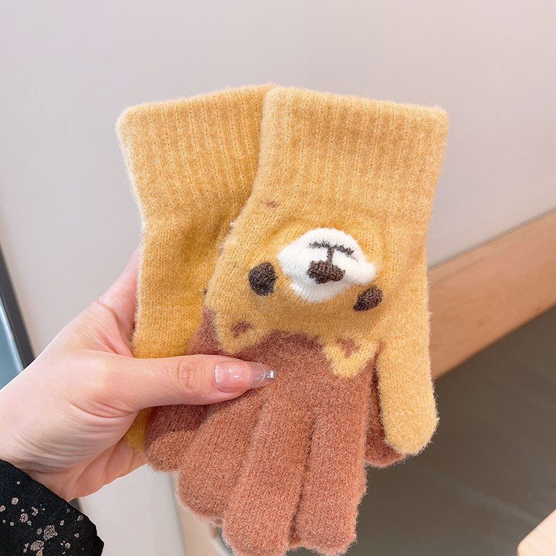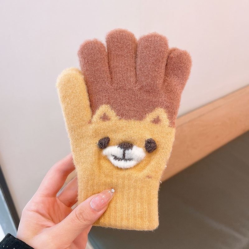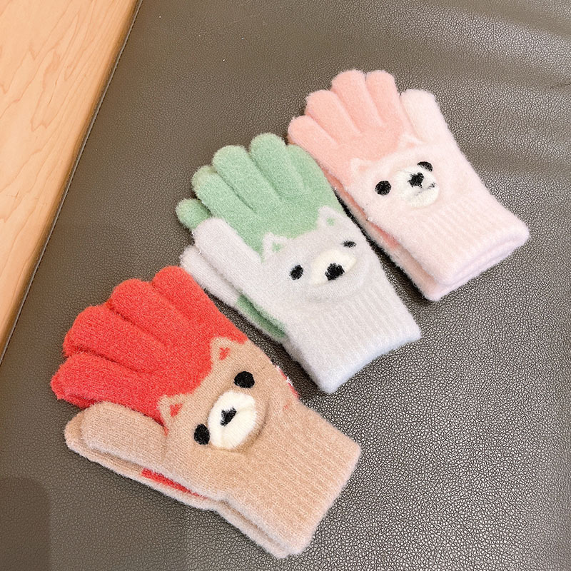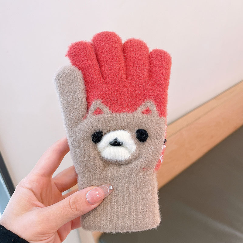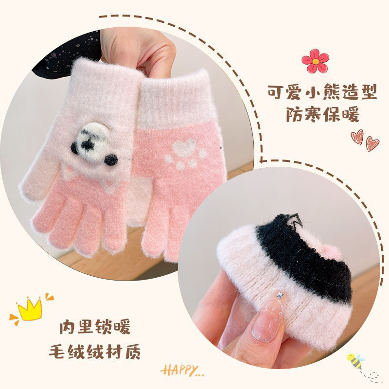 秋冬儿童卡通小熊针织手套男女学生外出保暖五指加绒加厚大童手套