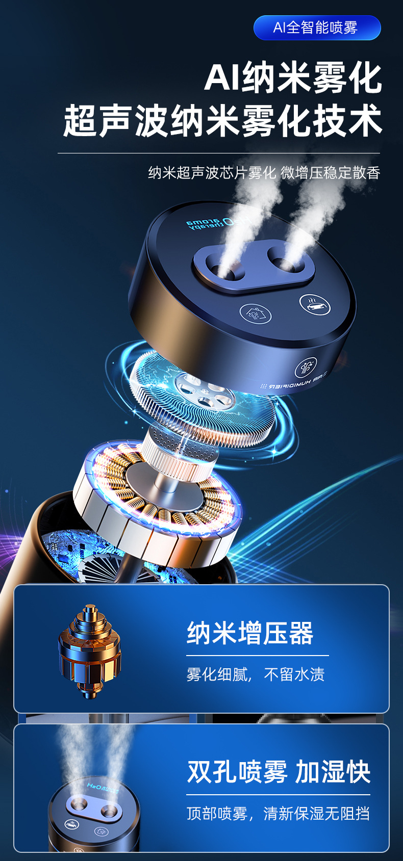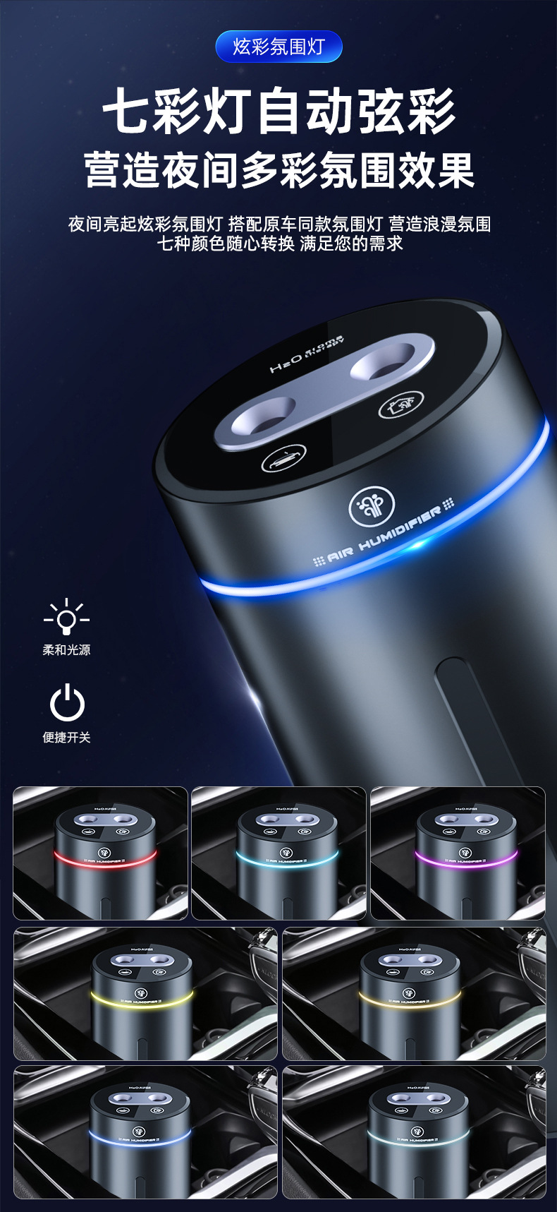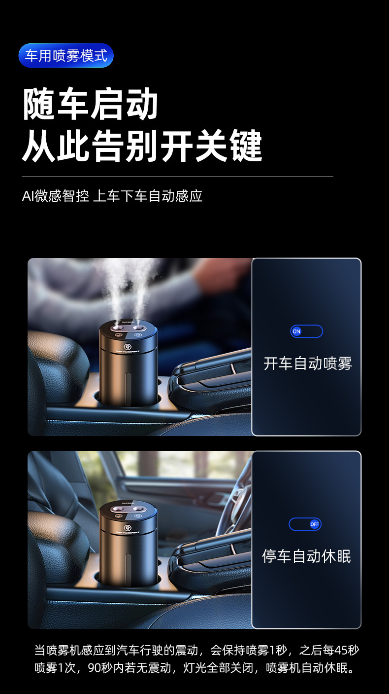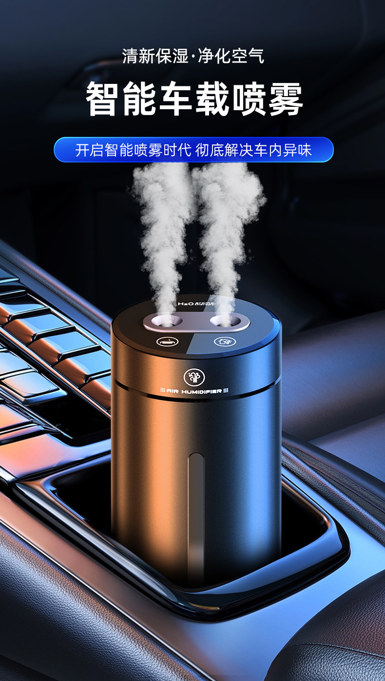 新款智能车载加湿器 双喷口出雾随车启动内置电池喷雾香薰机跨境