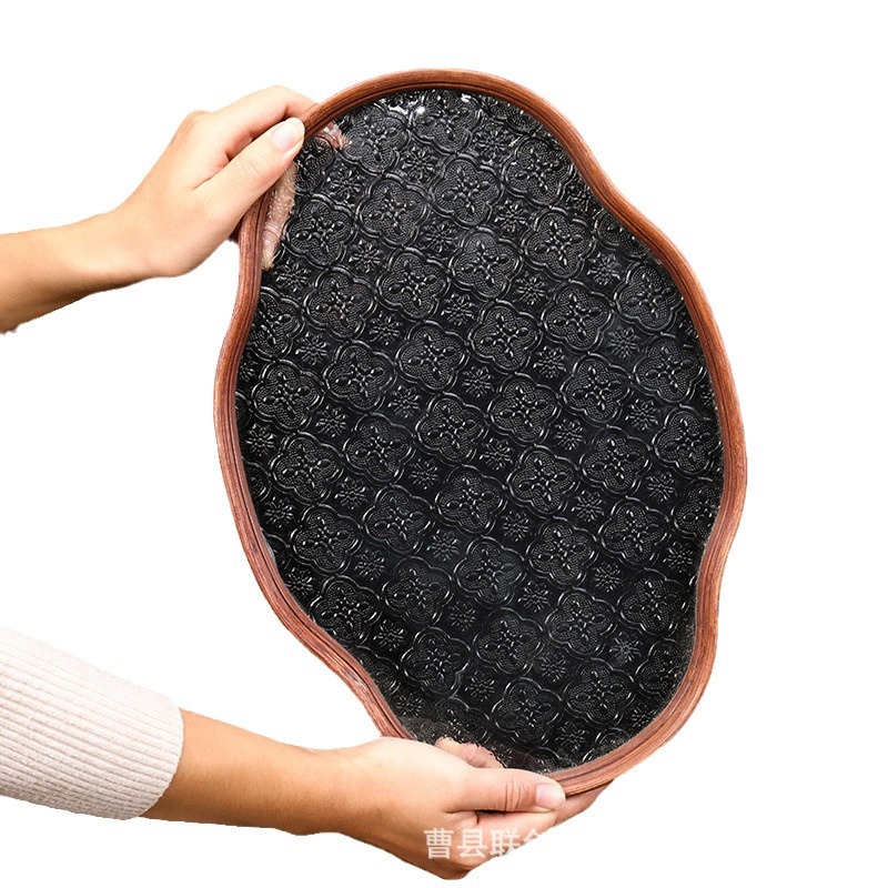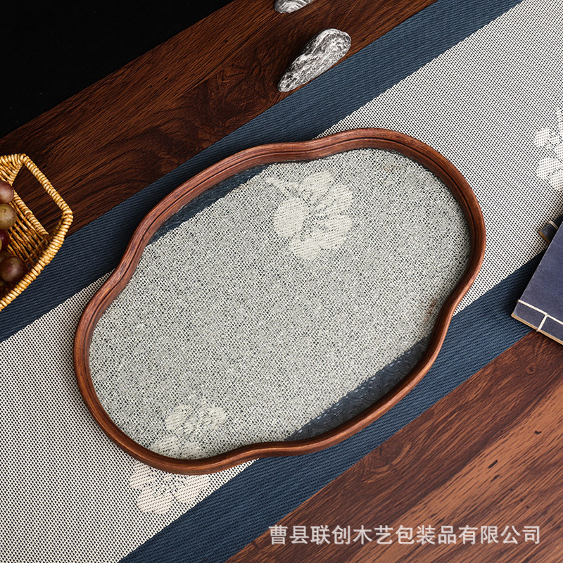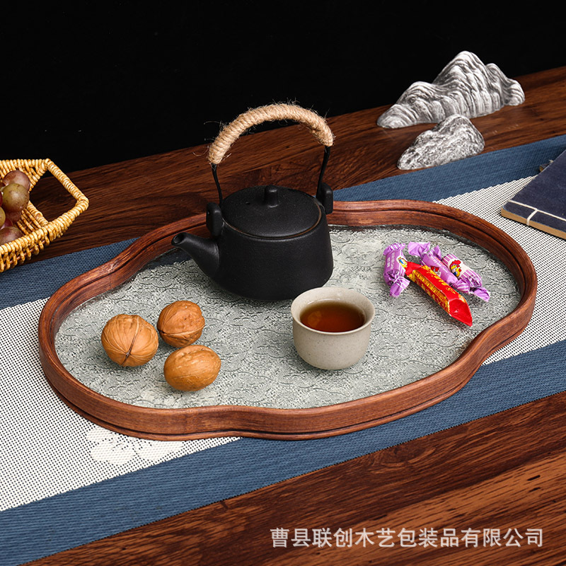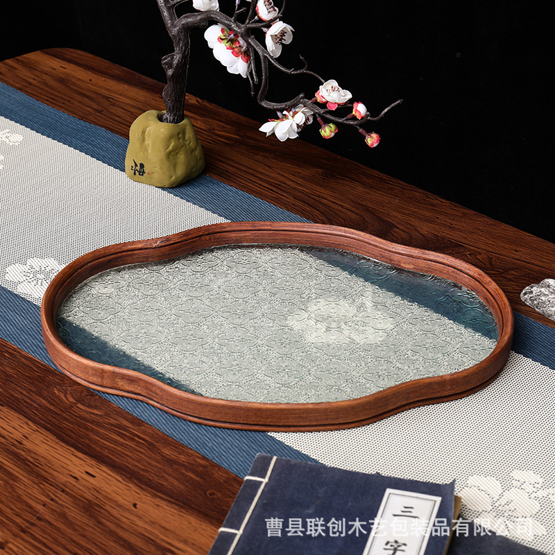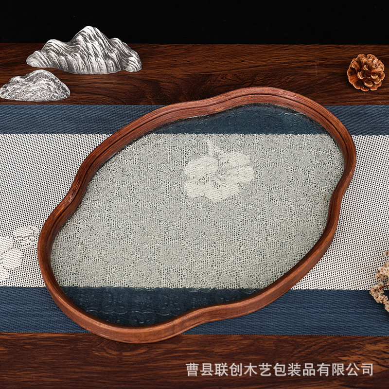 日式海棠花木质托盘玻璃茶盘家用客厅点心盘茶水杯子托盘玻璃盘