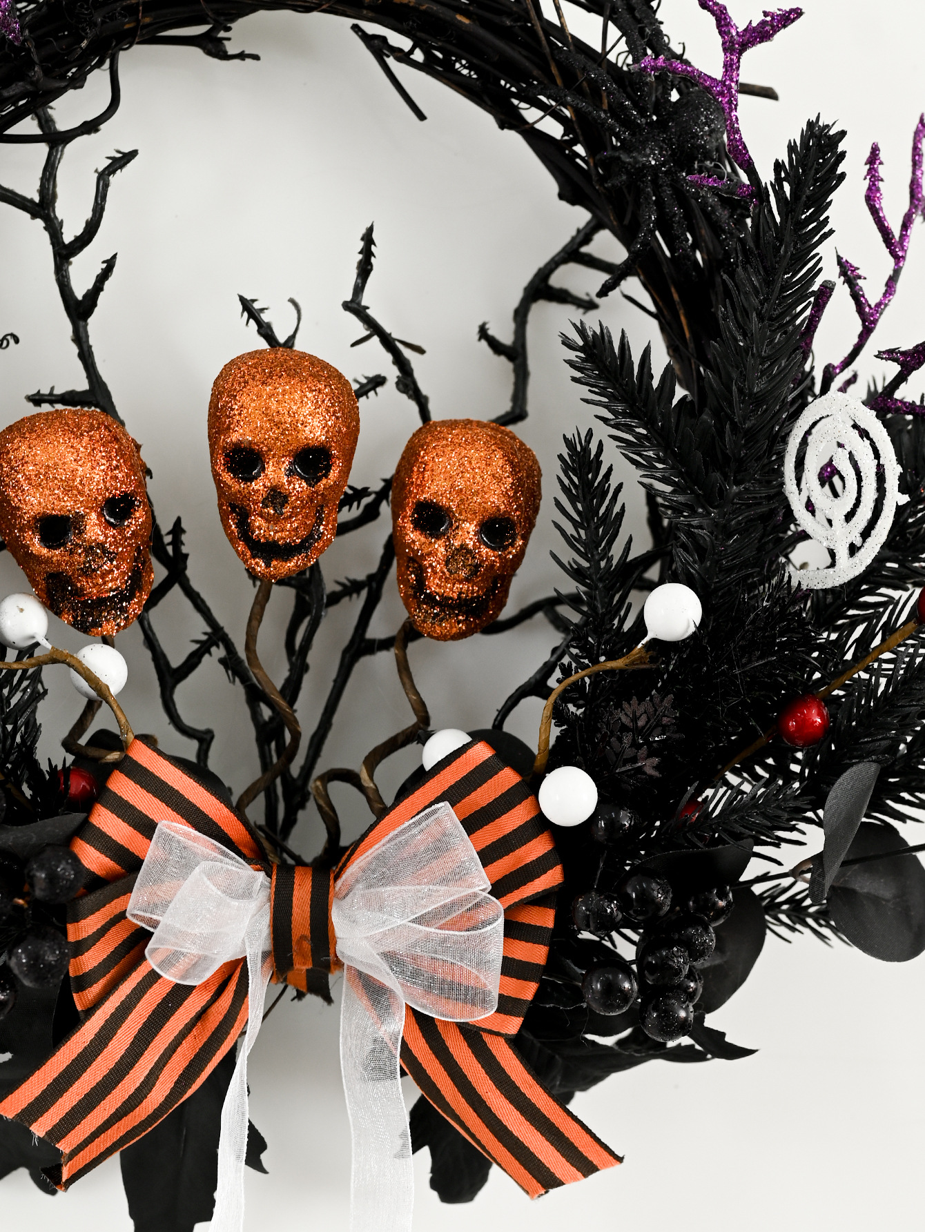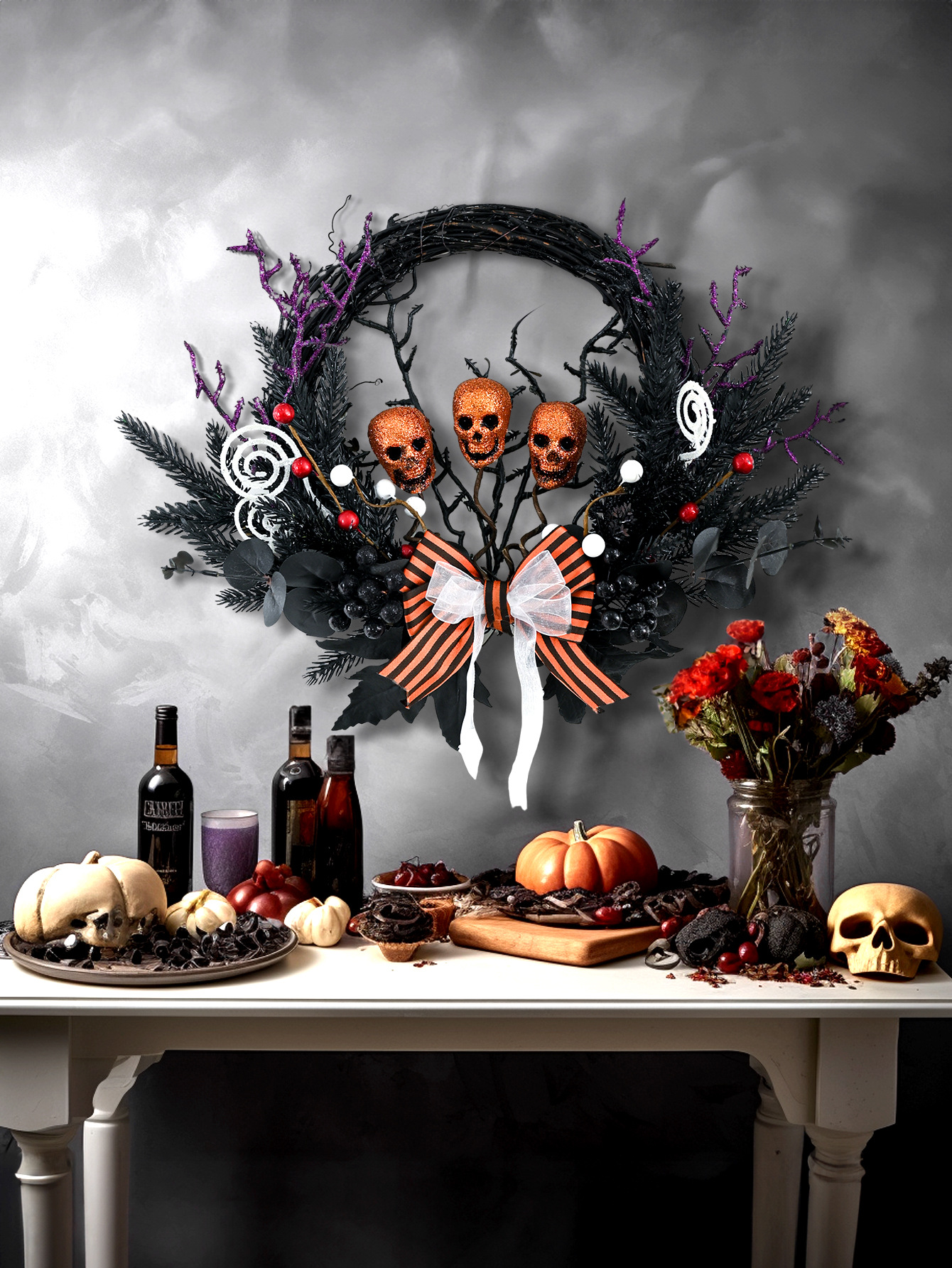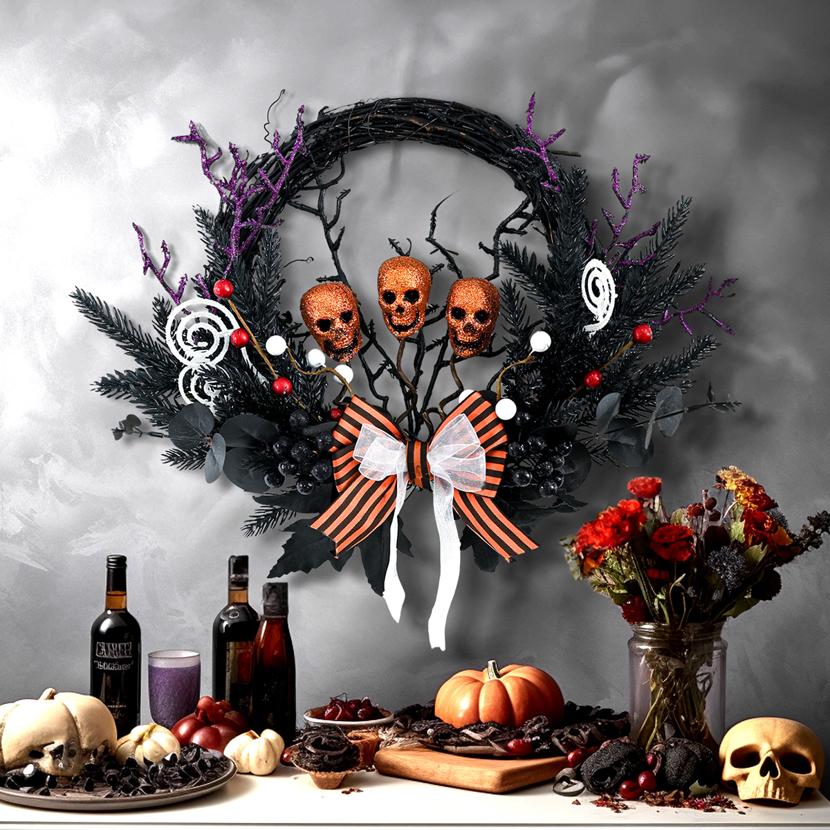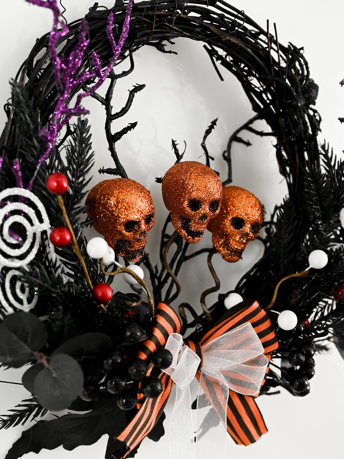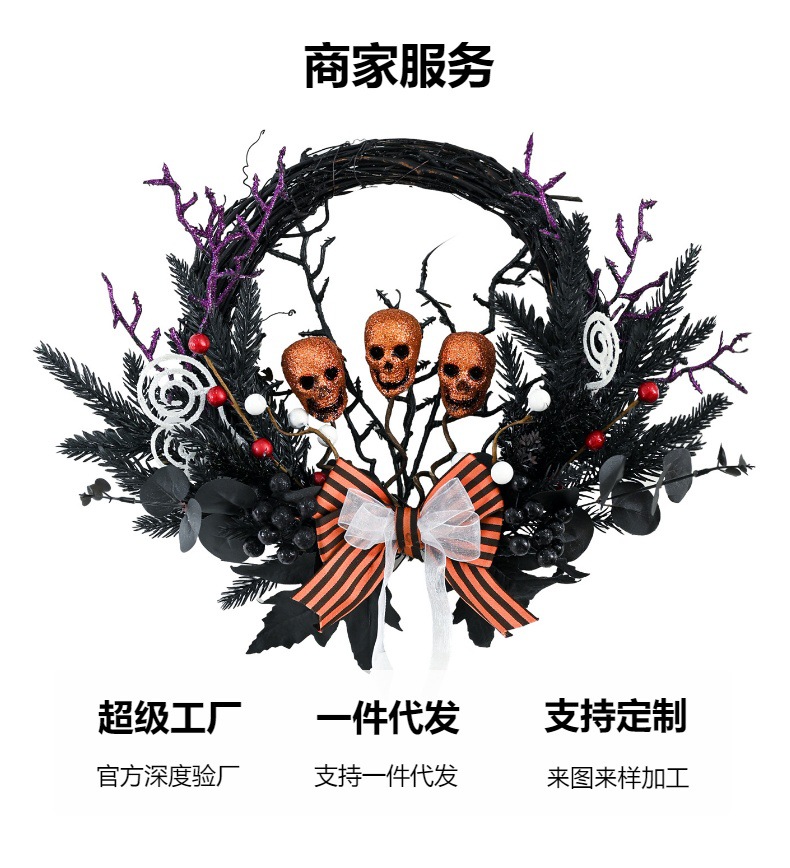 鬼节装饰藤圈骷髅松针蝴蝶结花圈节日派对恐怖道具挂件万圣节花环