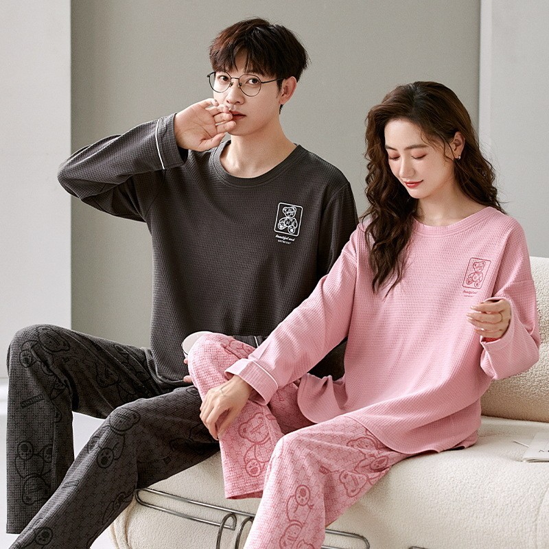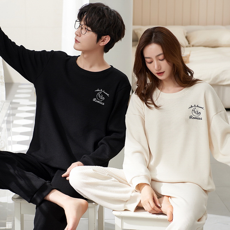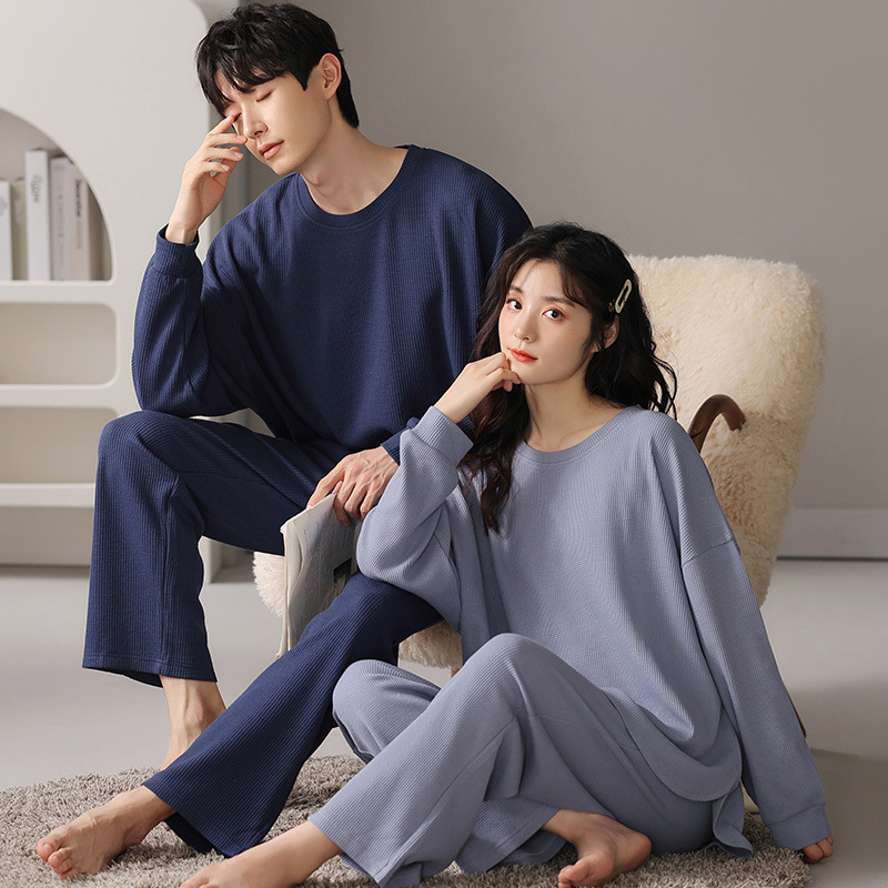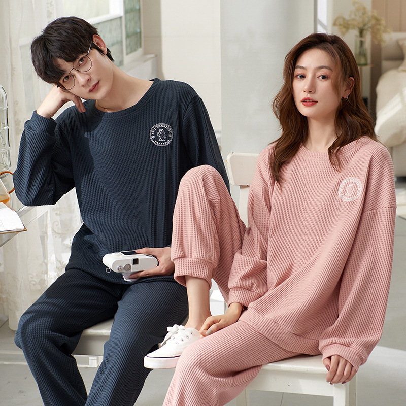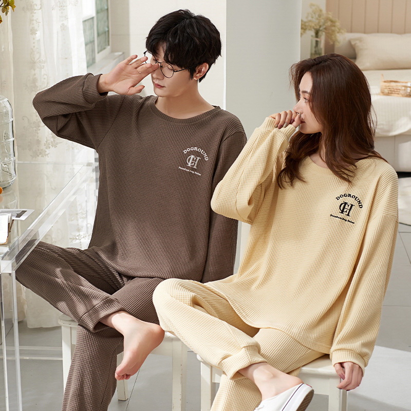2023年秋冬季情侣睡衣套头长袖透气棉质男女士华夫格春秋季家居服
