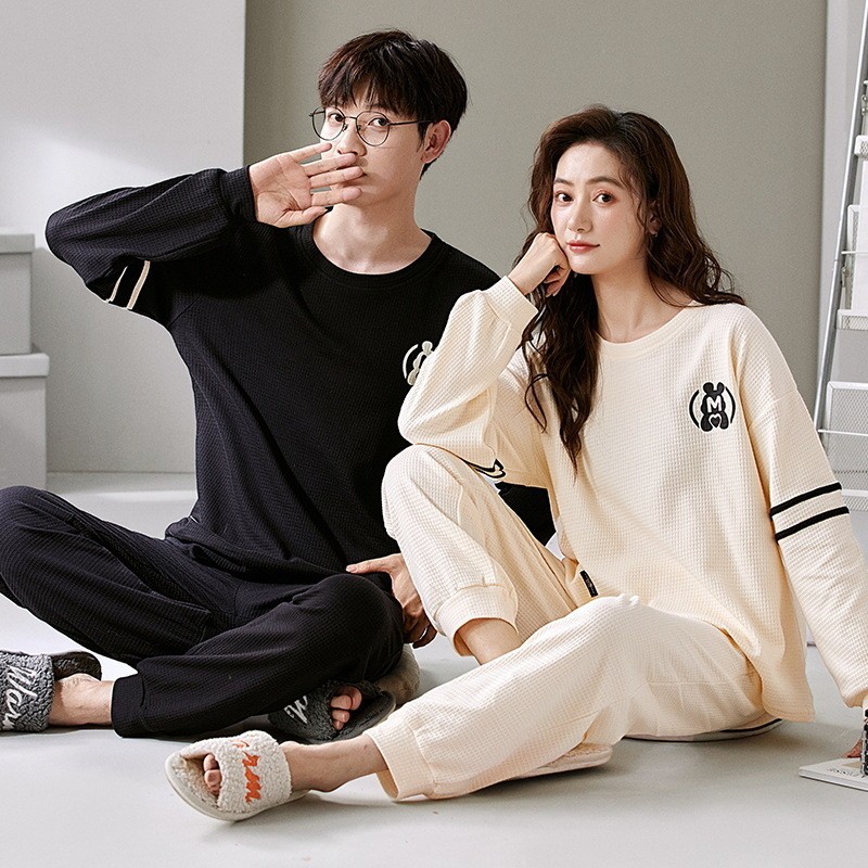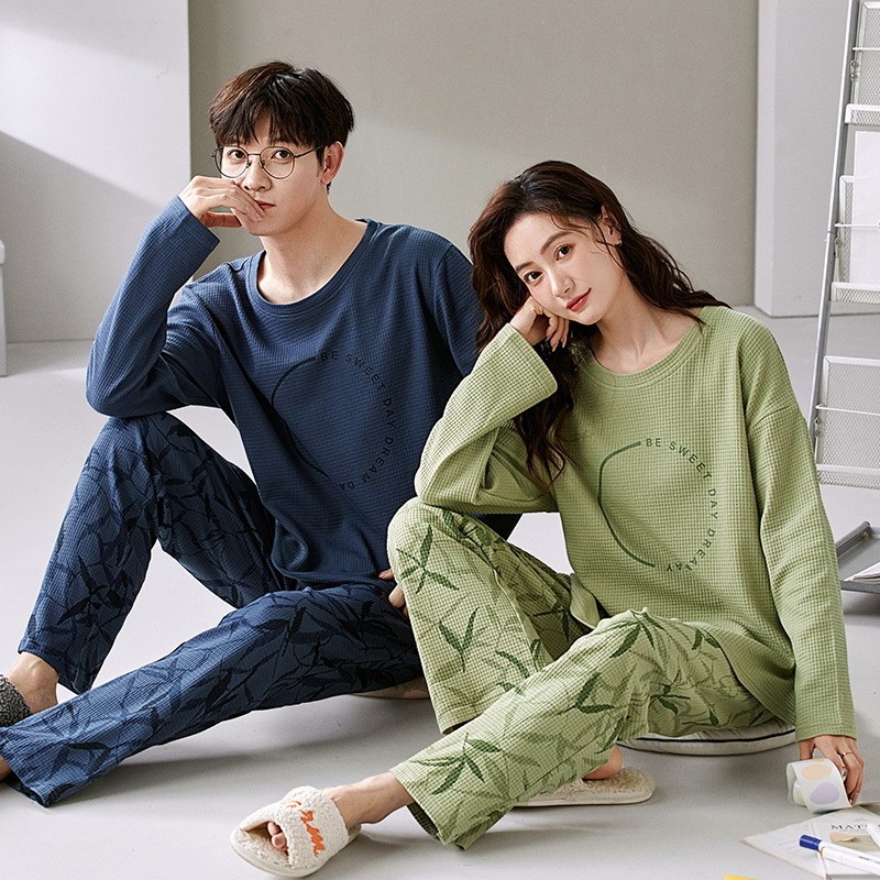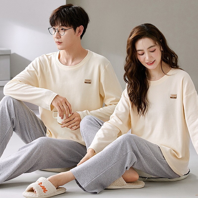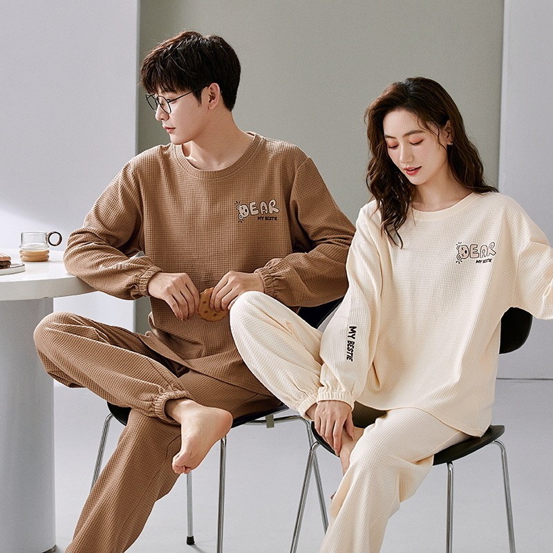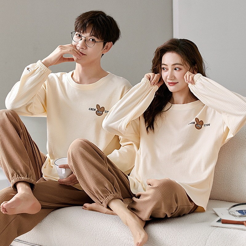 2023年秋冬季情侣睡衣套头长袖透气棉质男女士华夫格春秋季家居服