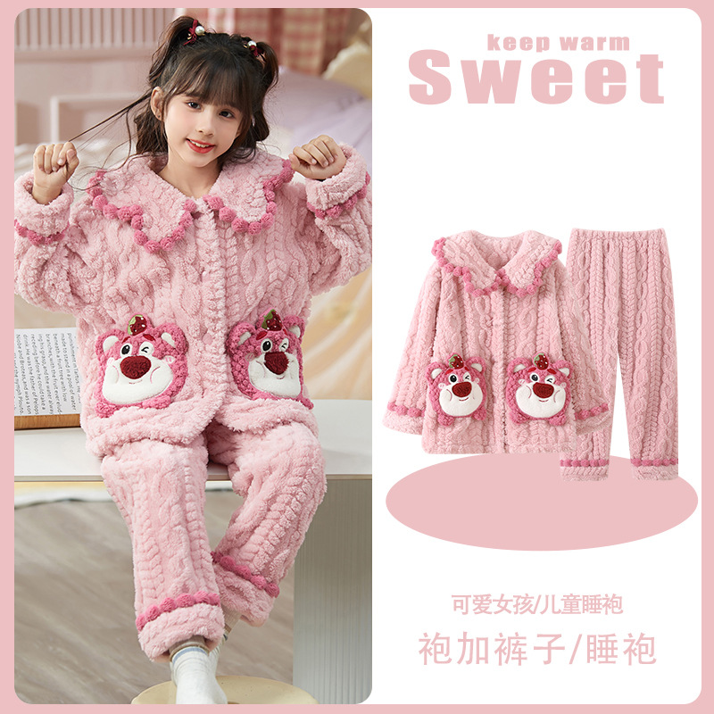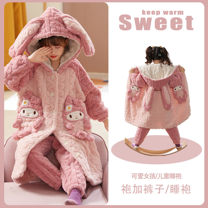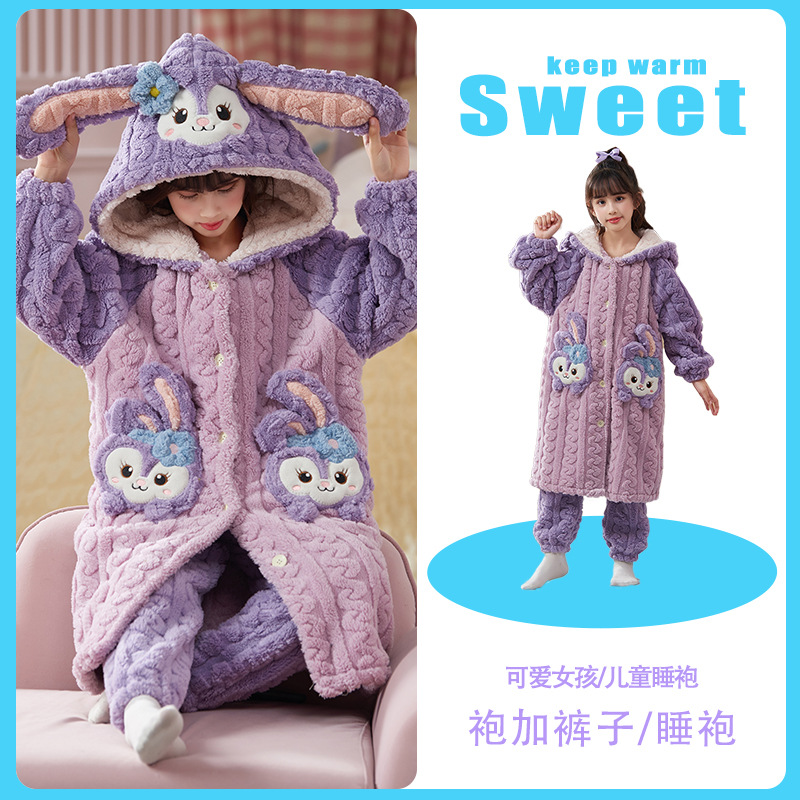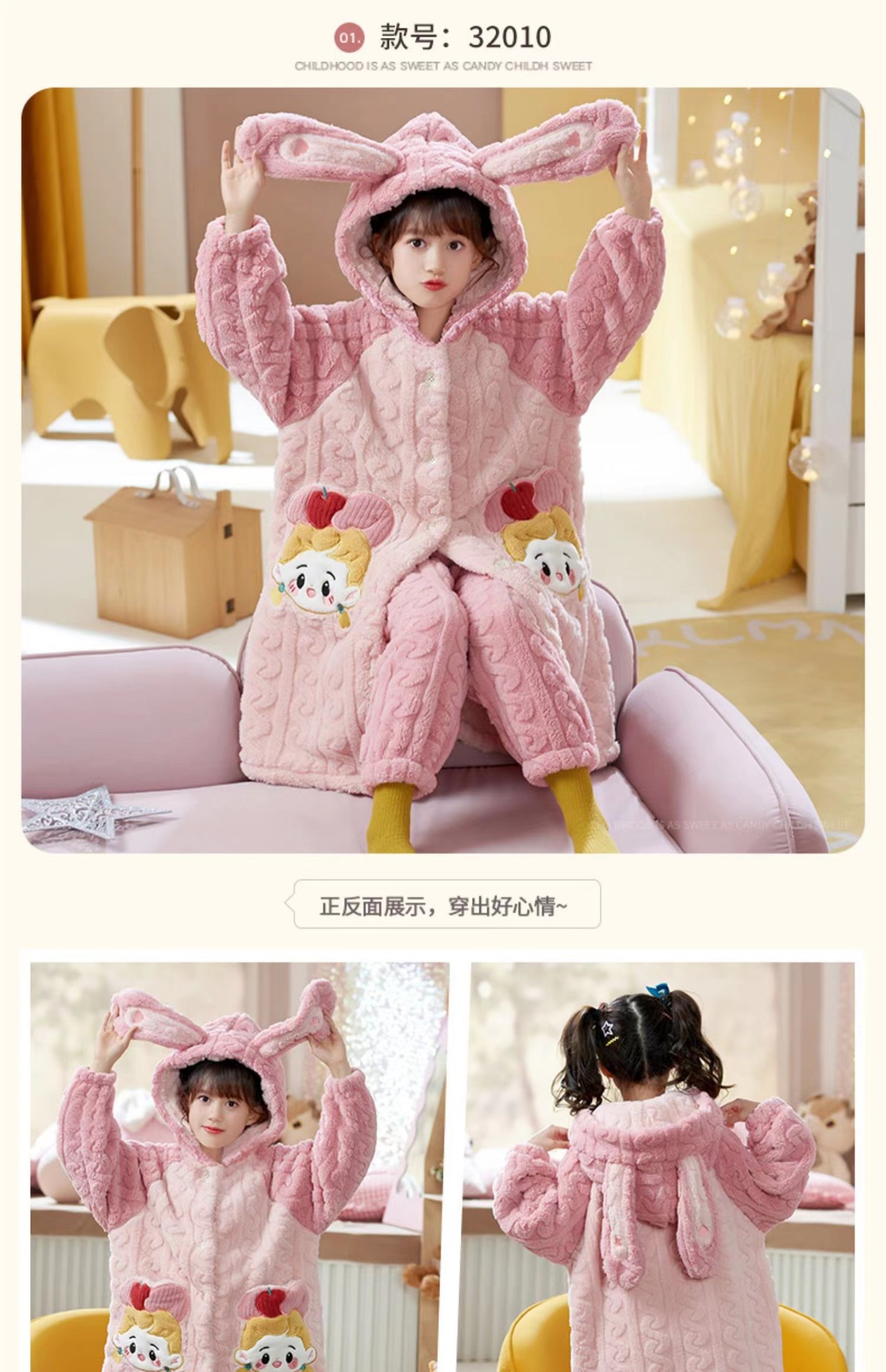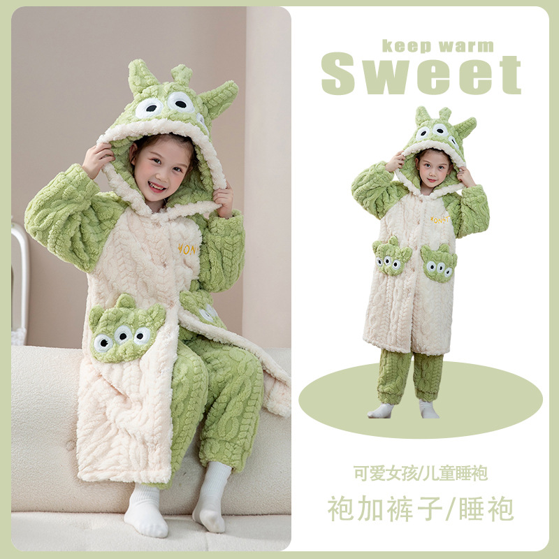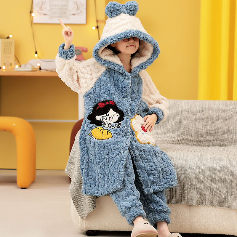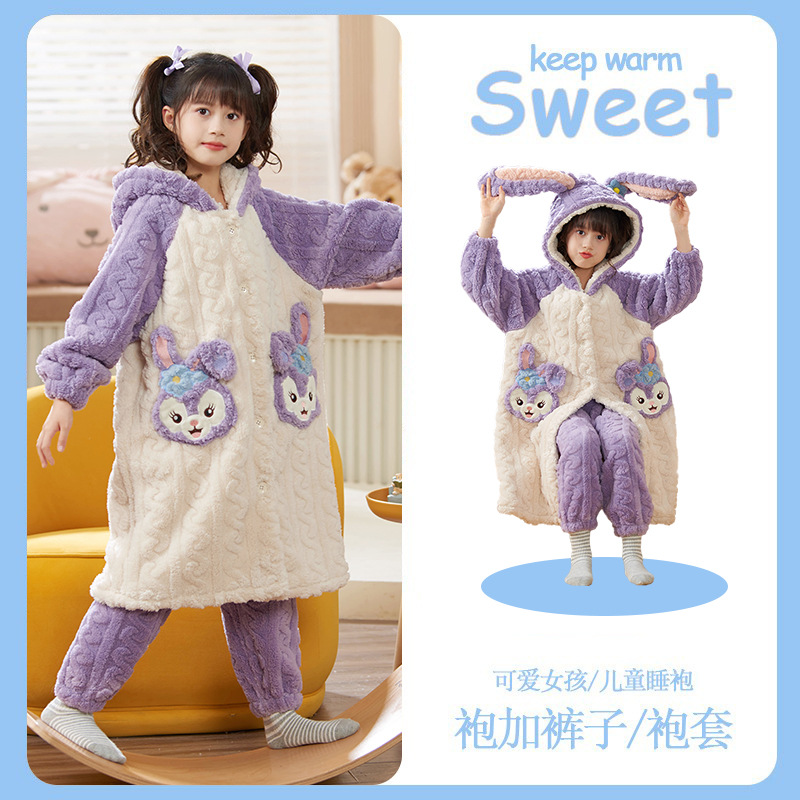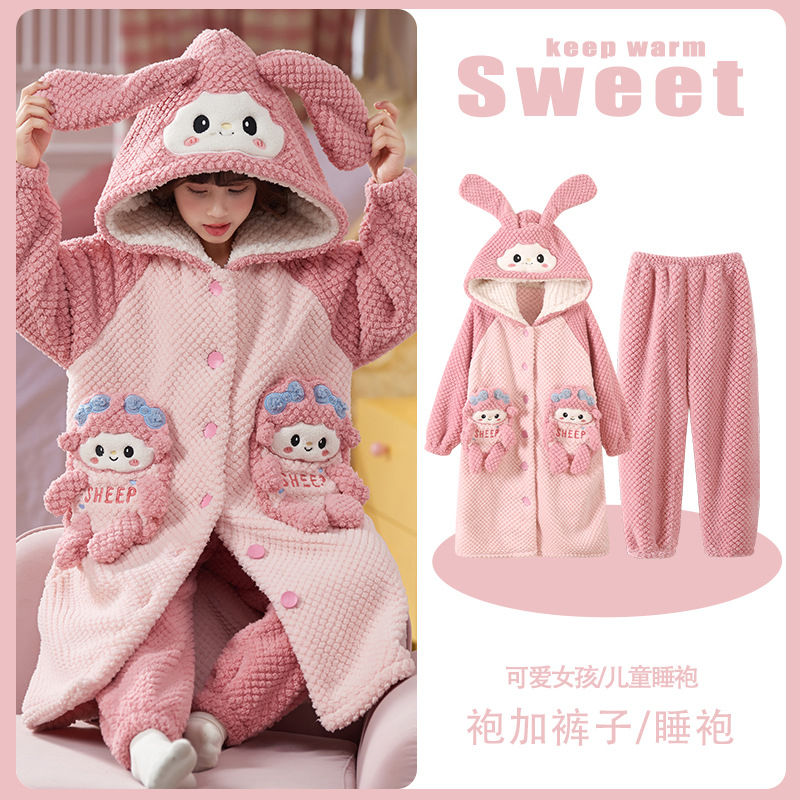 儿童睡衣女童睡袍秋冬季珊瑚绒法兰绒加厚套装女孩大童浴袍家居服