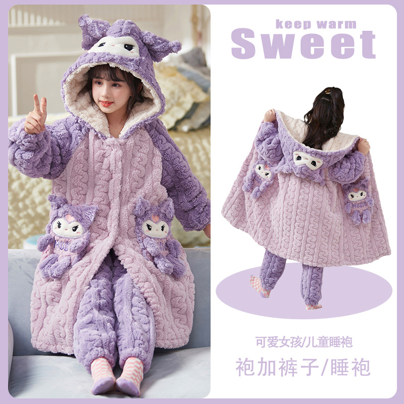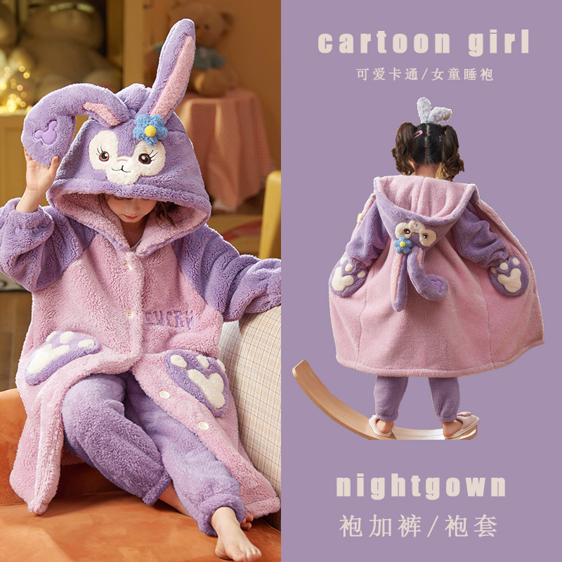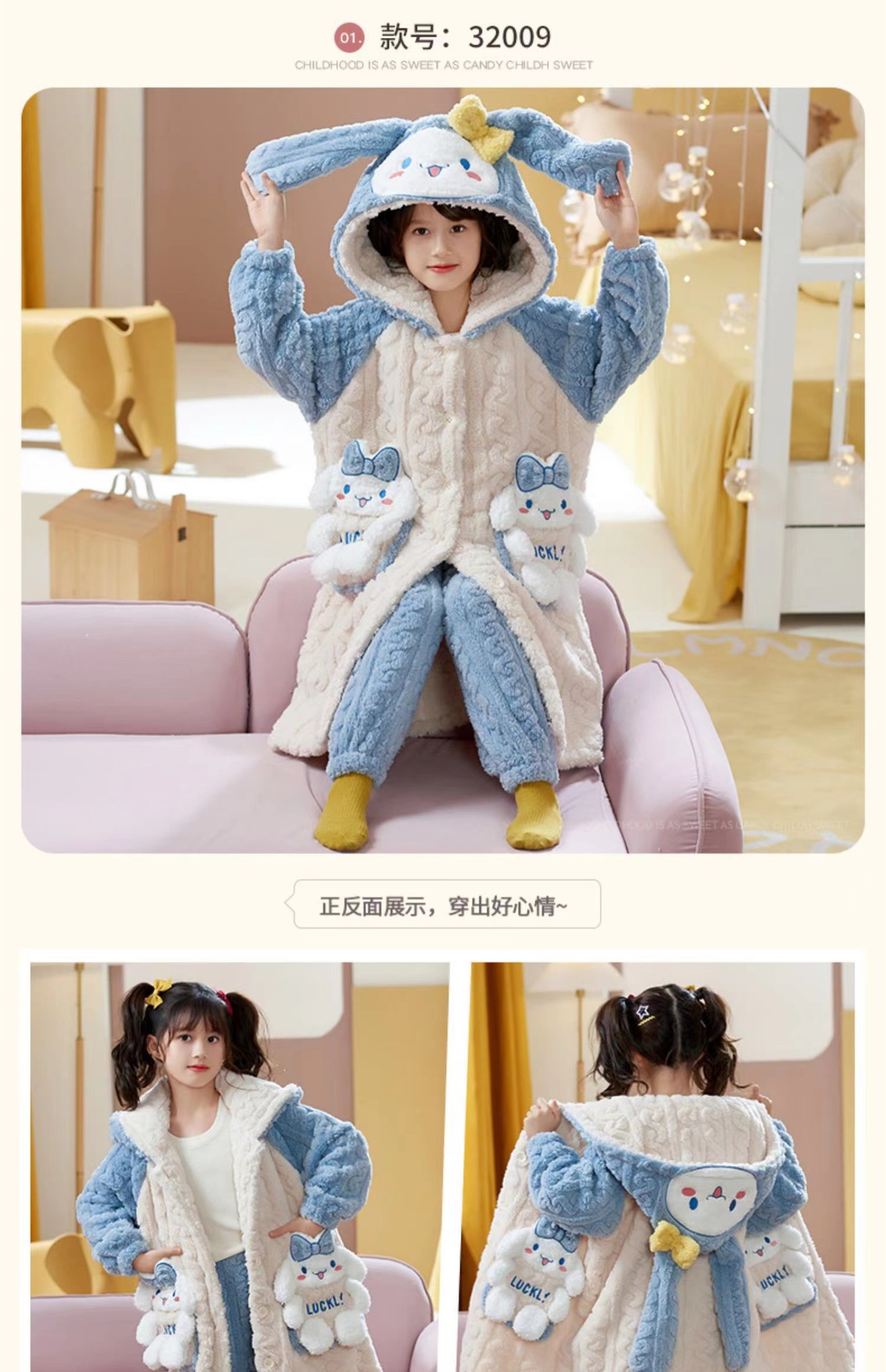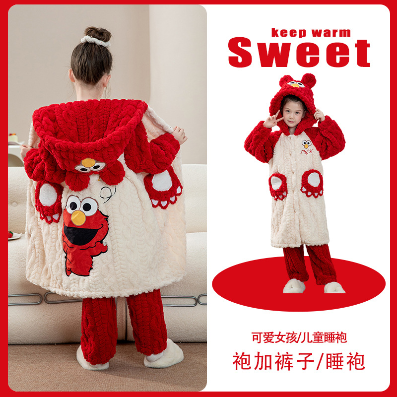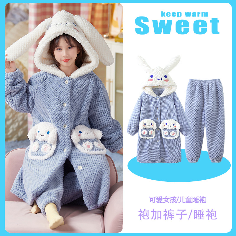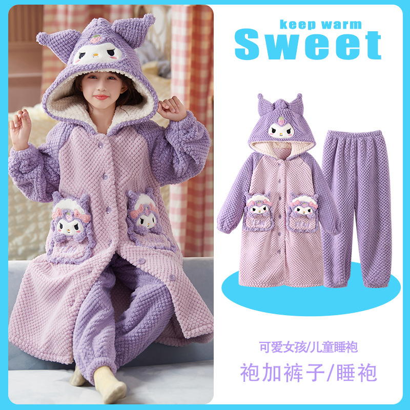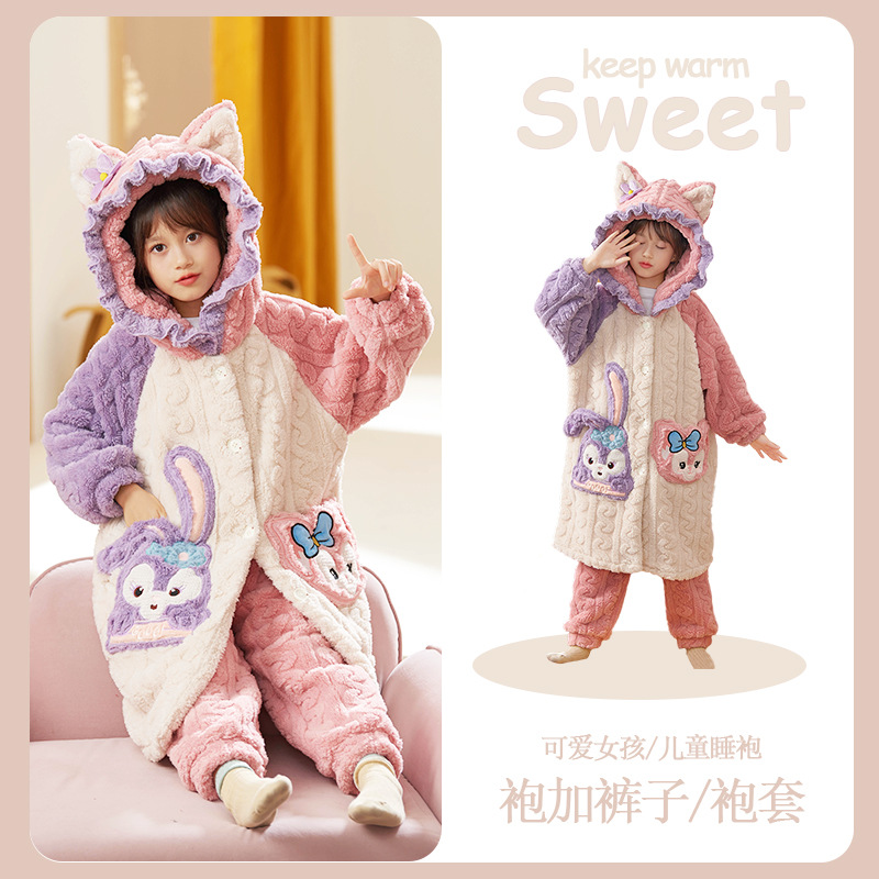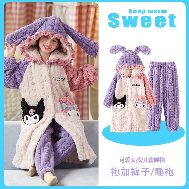 儿童睡衣女童睡袍秋冬季珊瑚绒法兰绒加厚套装女孩大童浴袍家居服