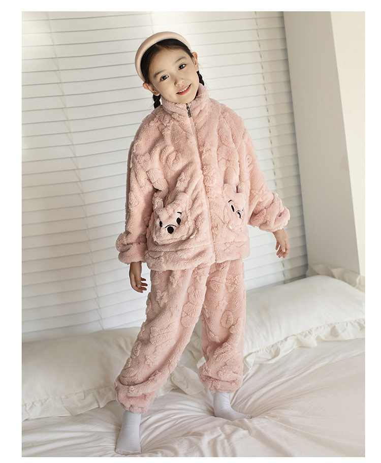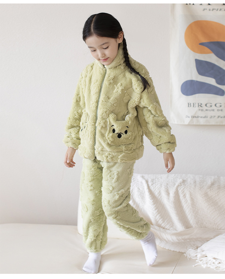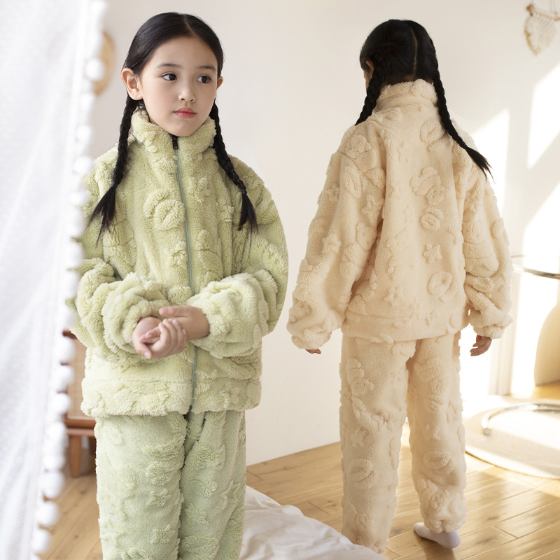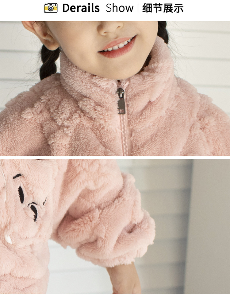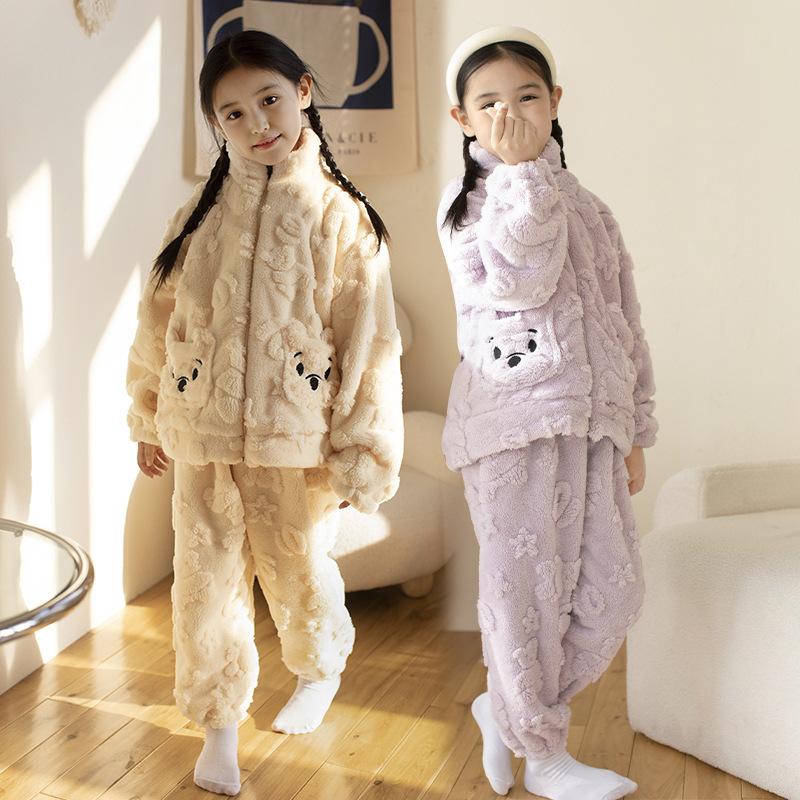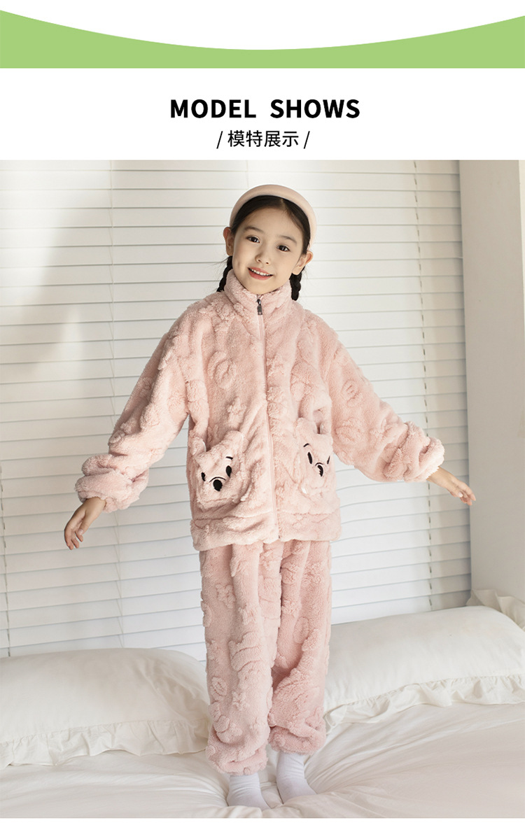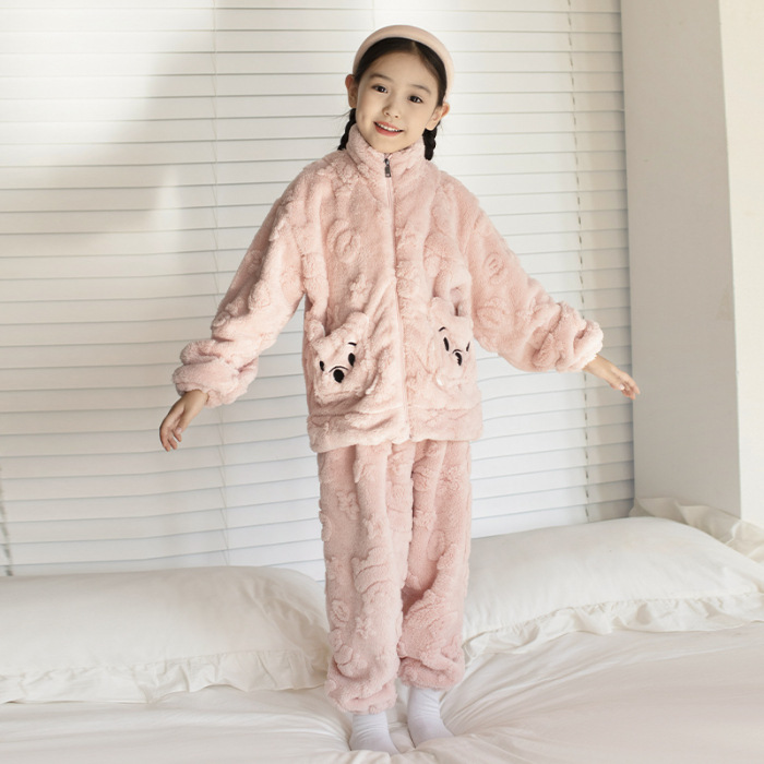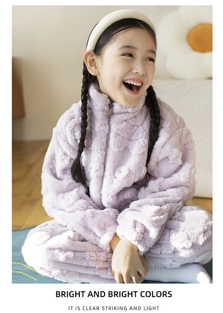 儿童睡衣秋冬季珊瑚绒女童可爱卡通拉链立领法兰绒中小大童家居服