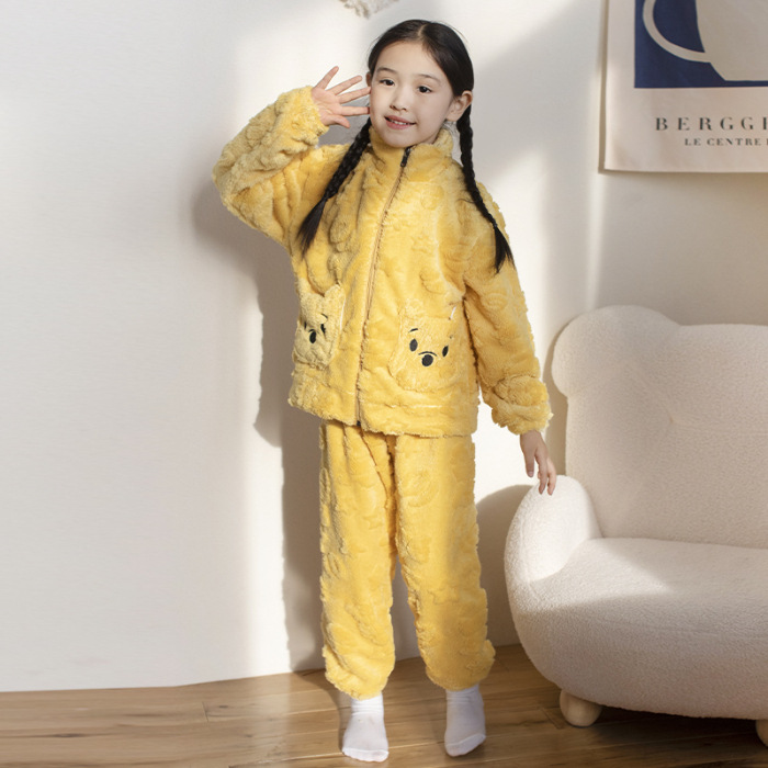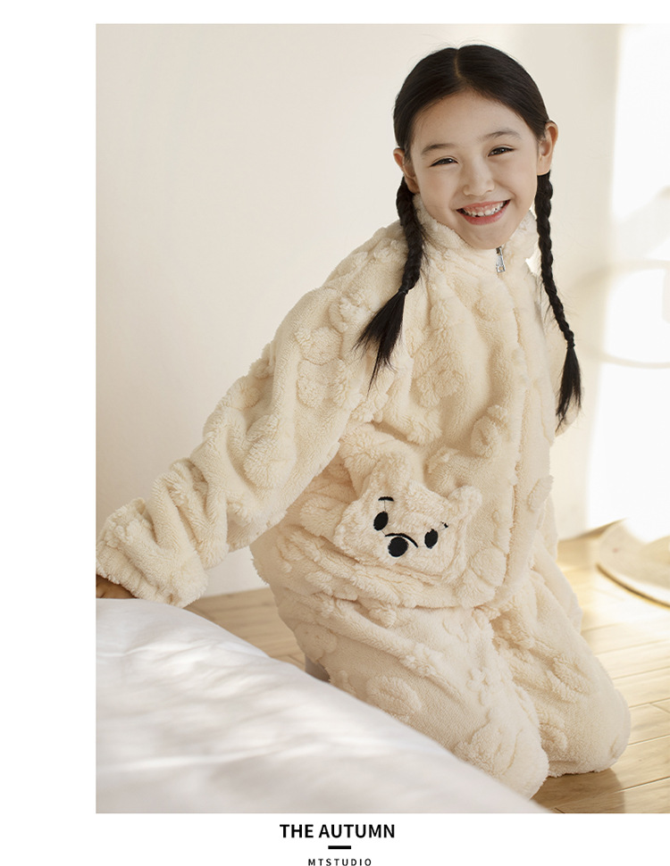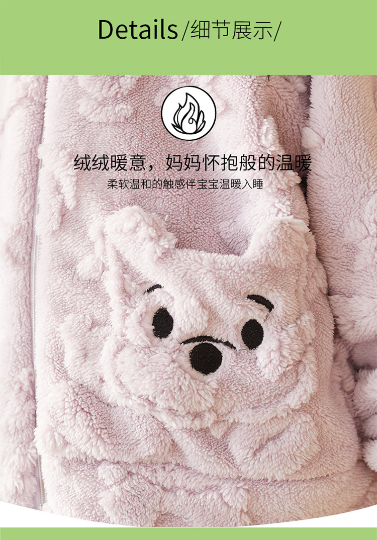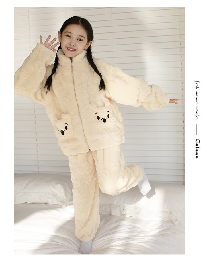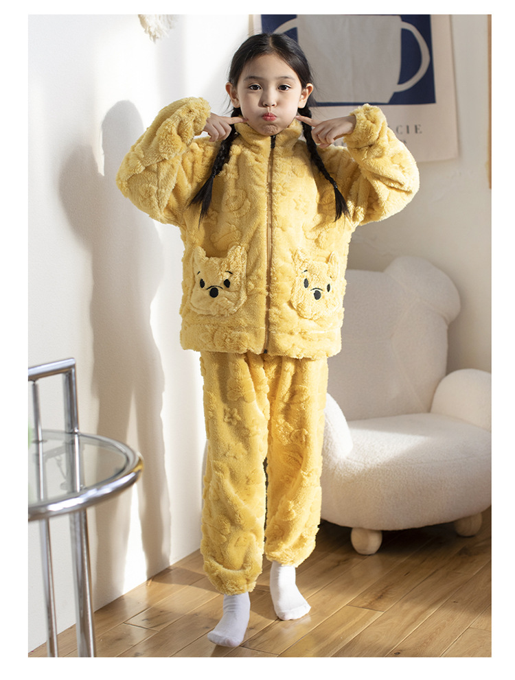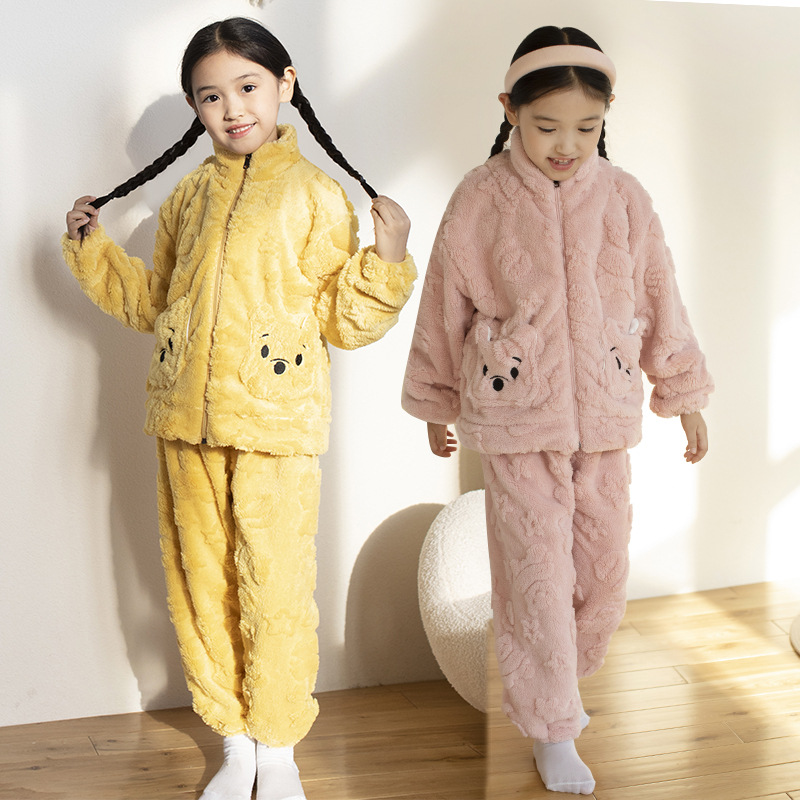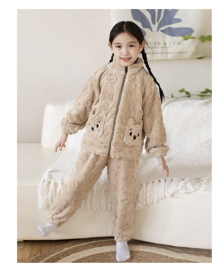 儿童睡衣秋冬季珊瑚绒女童可爱卡通拉链立领法兰绒中小大童家居服