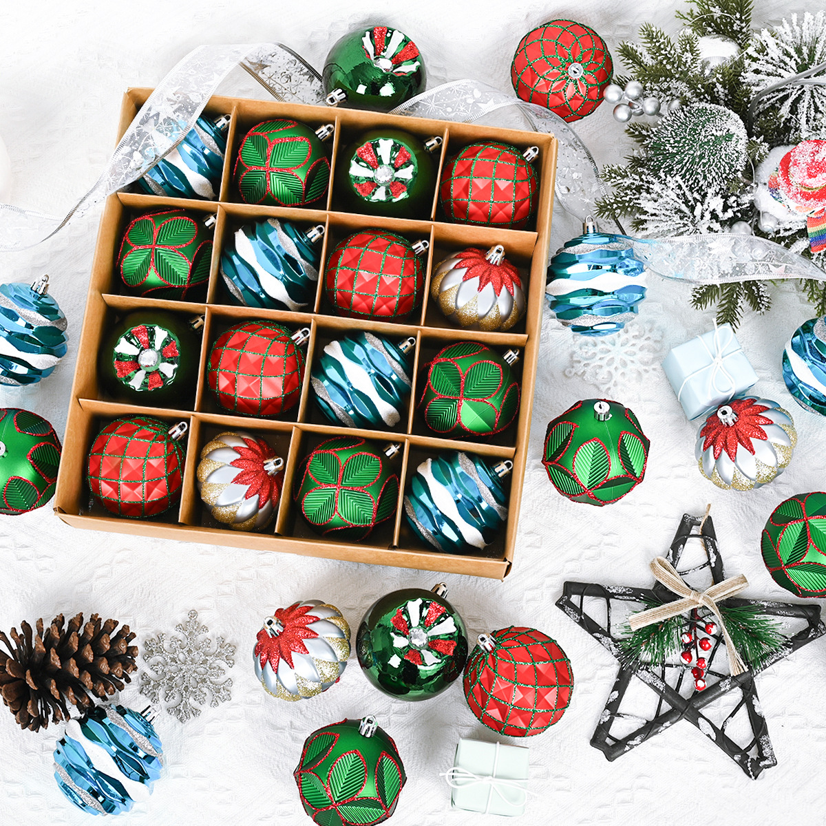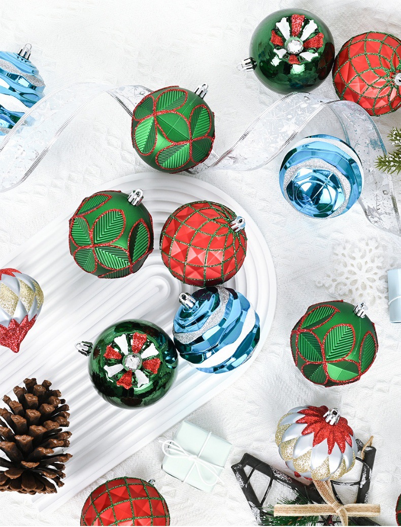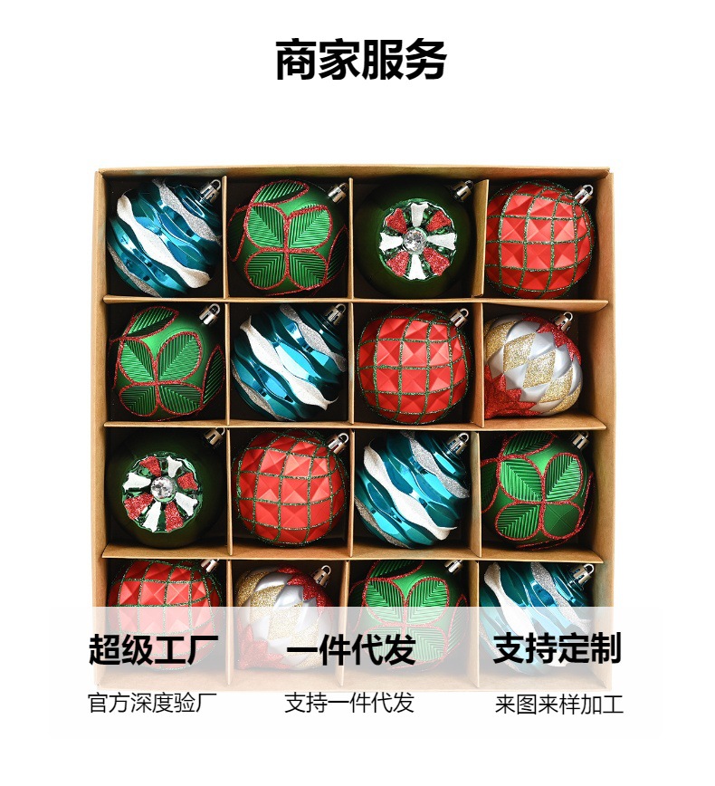跨境圣诞节装饰品8CM异形纹理彩绘塑料球16PK节日布置挂件圣诞球