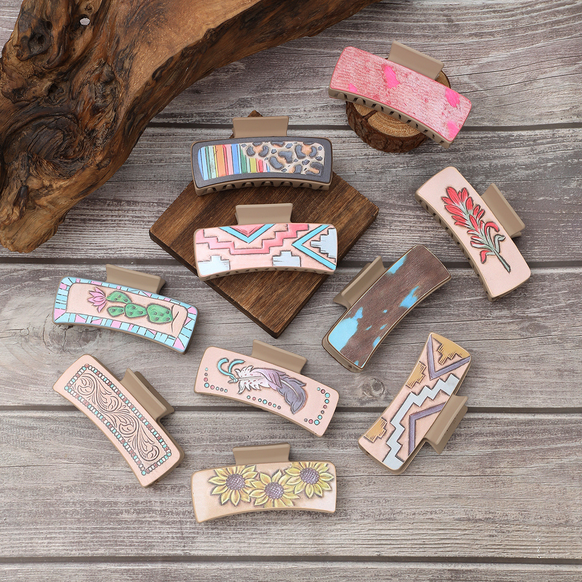 跨境西部风仙人掌羽毛向日葵皮革鲨鱼夹抓夹女士发夹亚马逊
