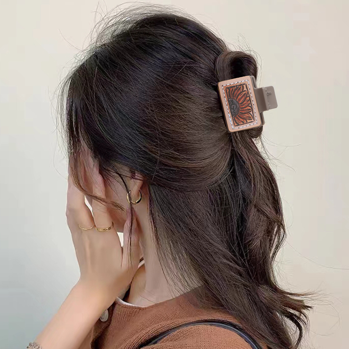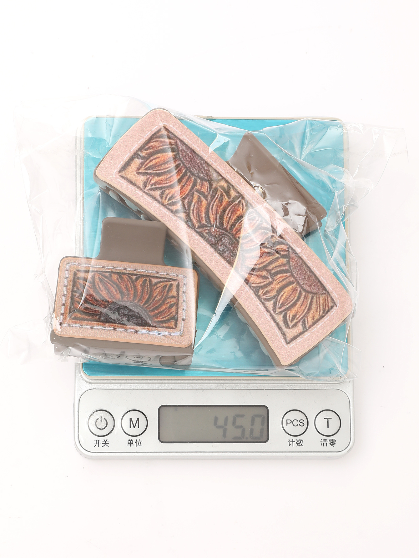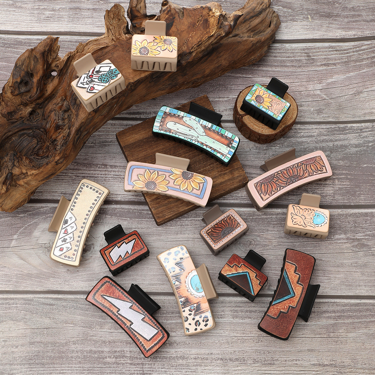 跨境西部风向日葵仙人掌扑克图案皮革发夹抓夹组合套装女士鲨鱼夹