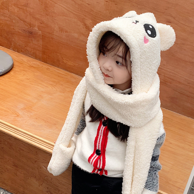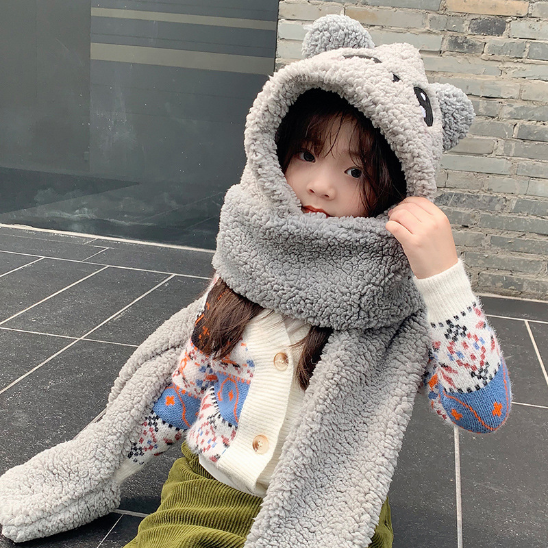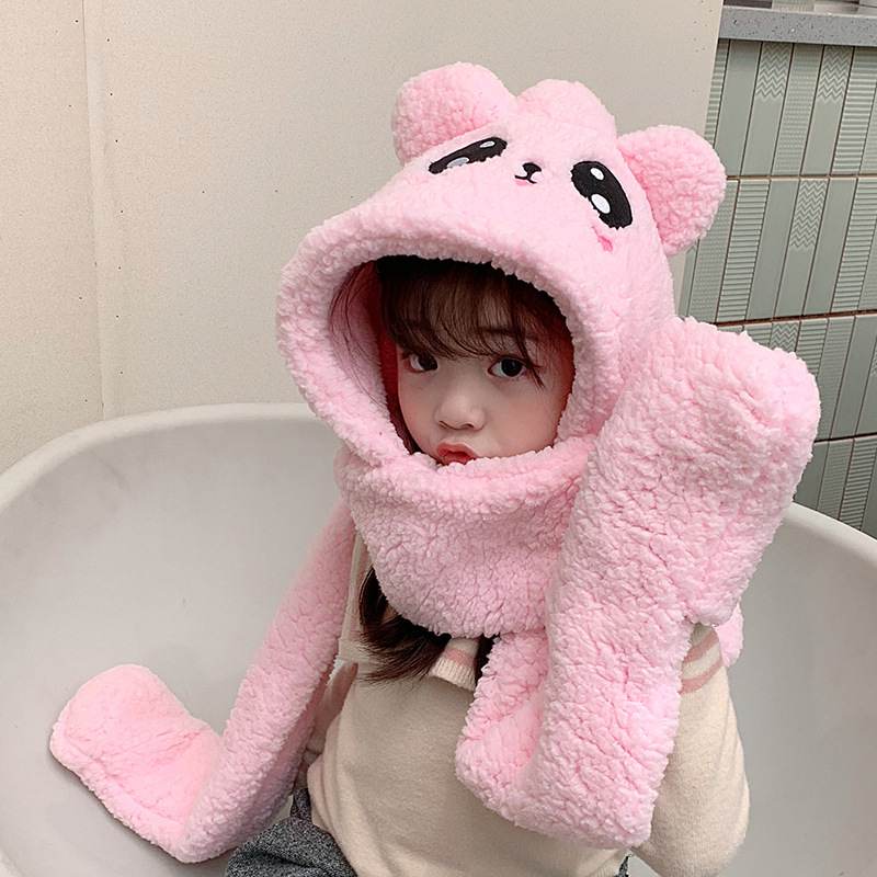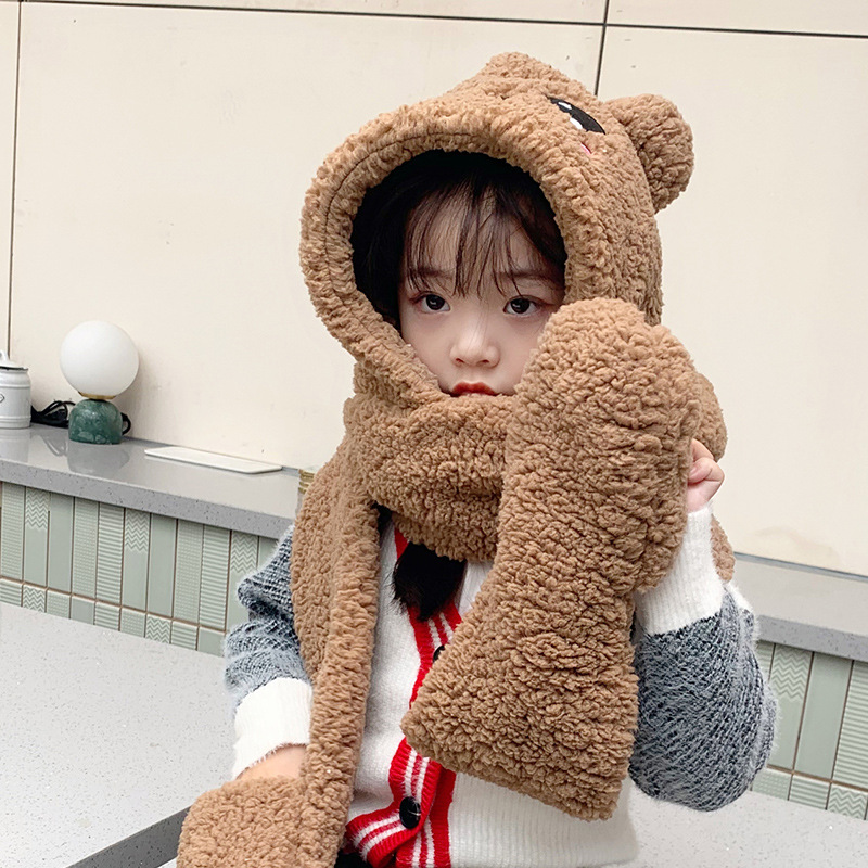 小熊帽子女秋冬季可爱百搭潮保暖毛绒帽手套连帽围脖围巾一体防寒