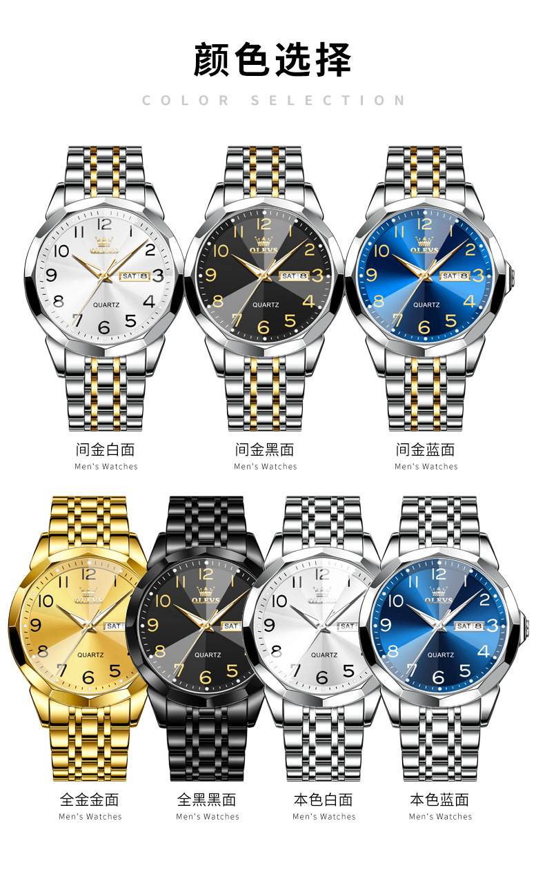 一件代欧利时品牌手表时尚双历石英表新款数字面防水男士手表男表