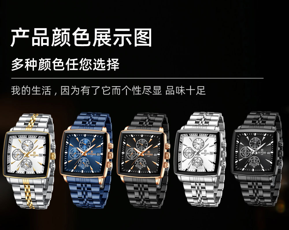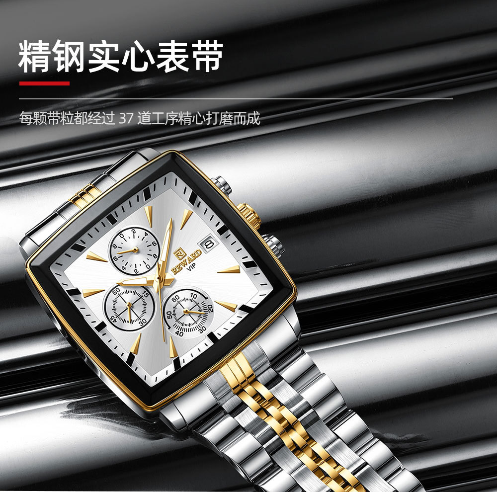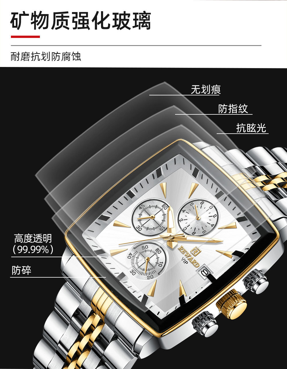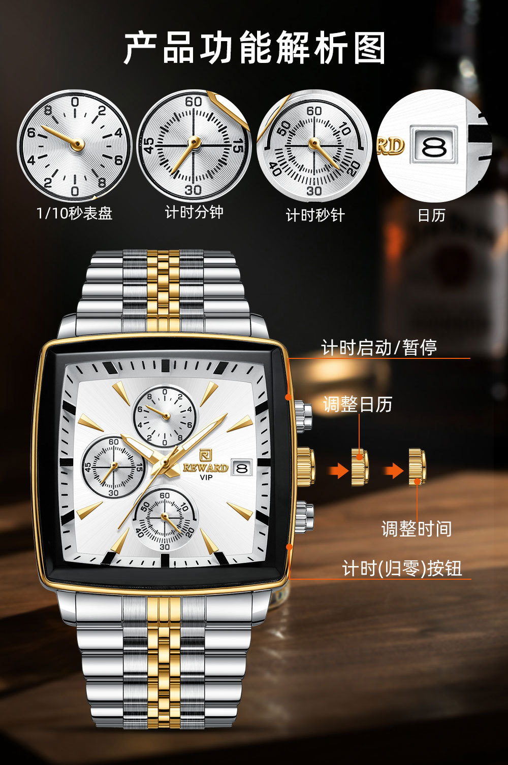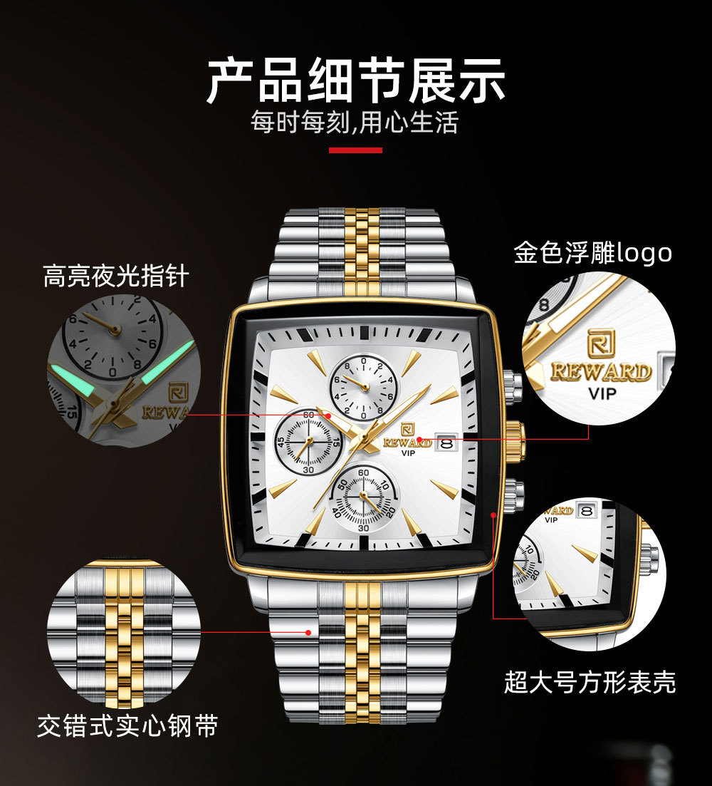 Reward高档智能男士手表多功计时能商务男表防水夜光日历实心钢带