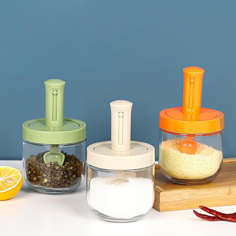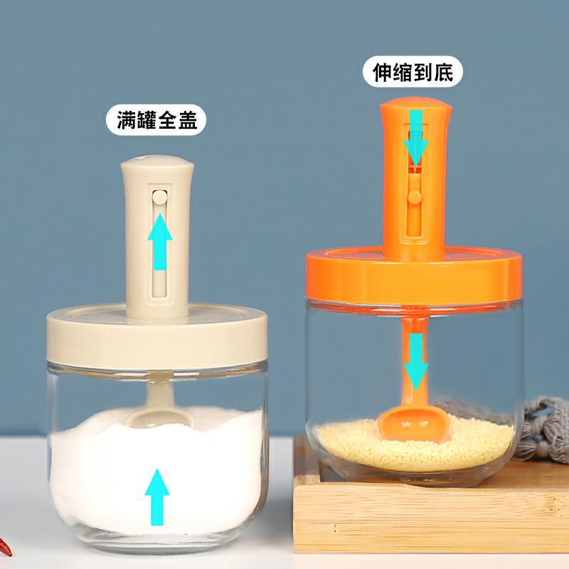 新款家用厨房用品 可伸缩玻璃调味罐密封防潮调料盒勺盖一体盐罐