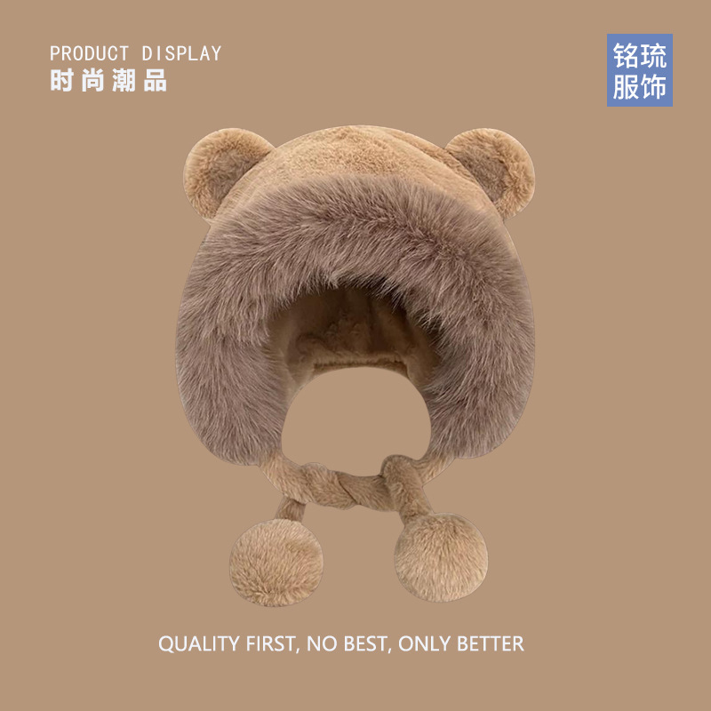 小熊帽子女秋冬毛绒帽大头围冬天雷锋帽防寒帽毛绒帽子护耳帽冬帽