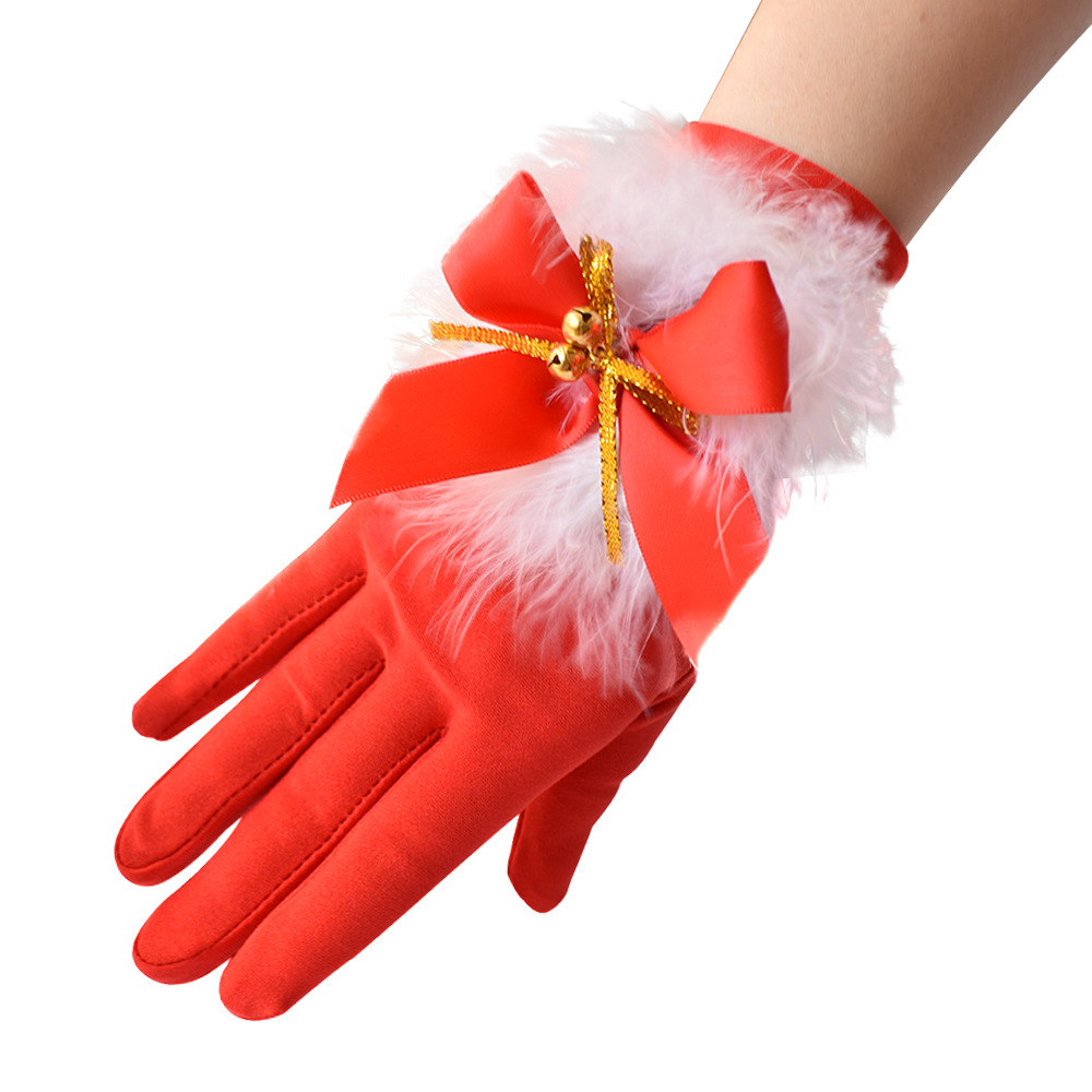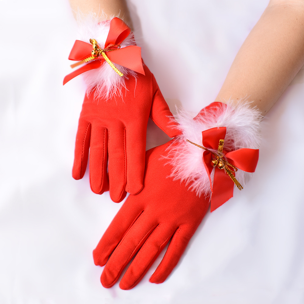 女士圣诞节手套 可爱羽毛铃铛圣诞节套装搭配手套 弹力牛奶丝手套