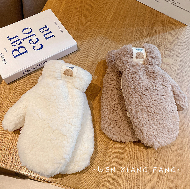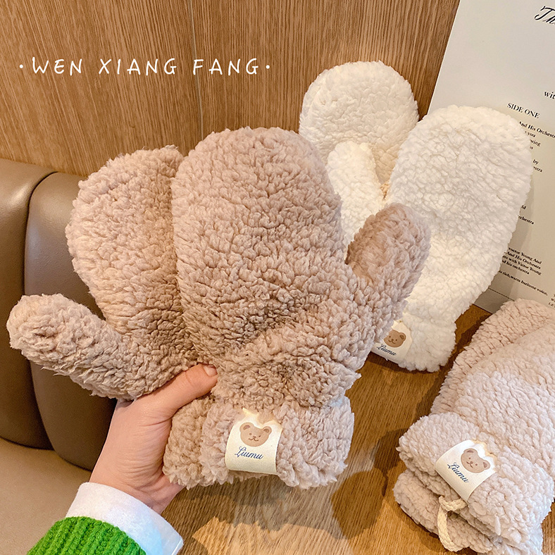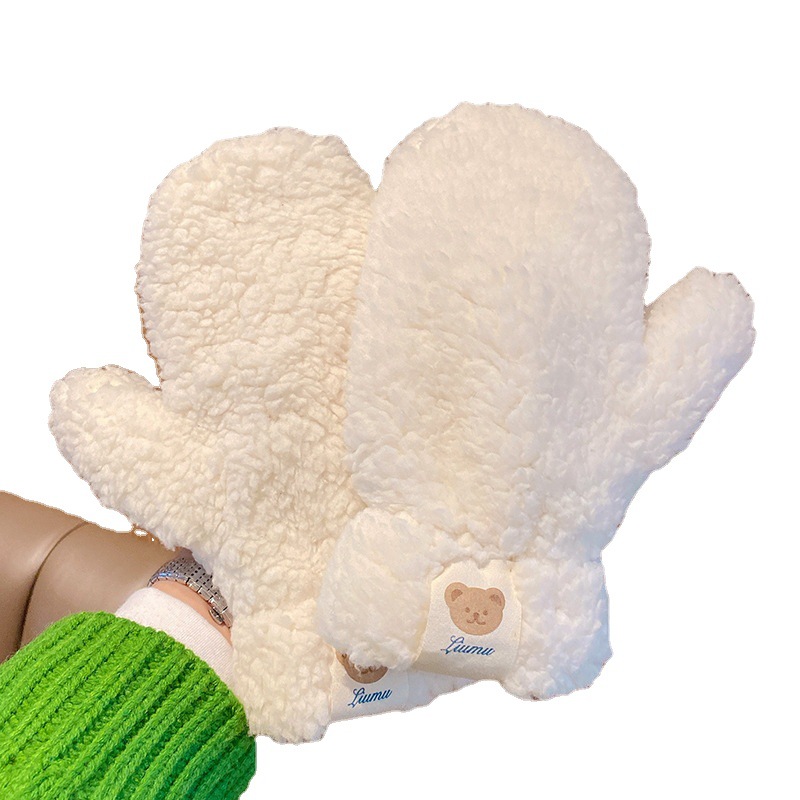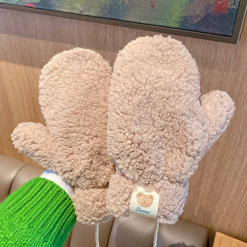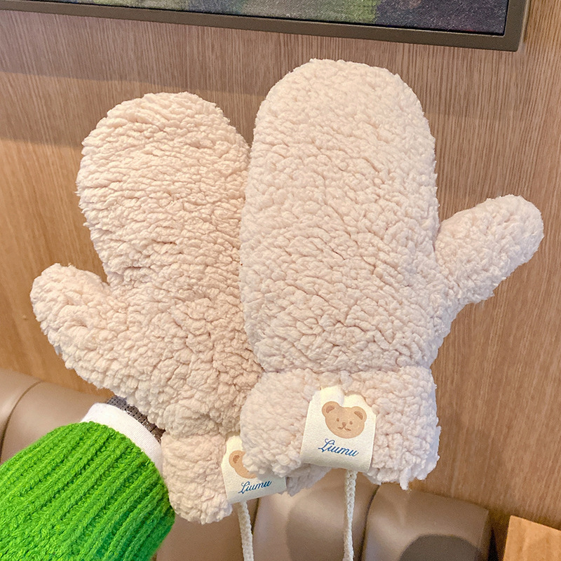 手套女冬季羊羔绒小熊贴标挂脖可爱学生冬天骑行加绒加厚保暖防寒