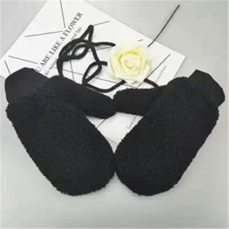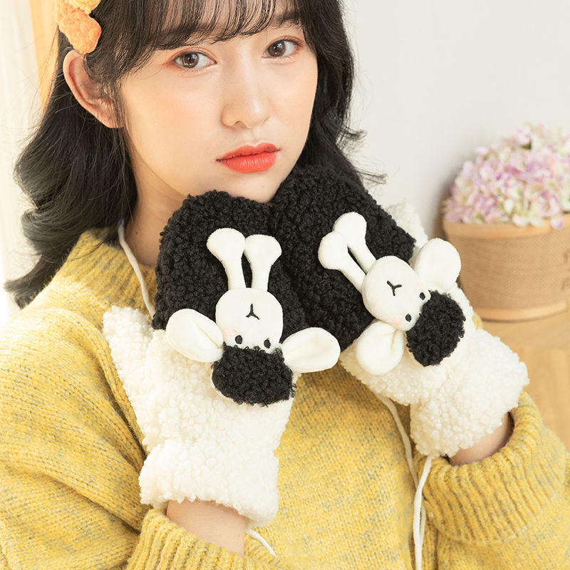 冬季可爱小羊手套内衬毛绒女生手套可爱萌趣可挂脖连指毛绒手套