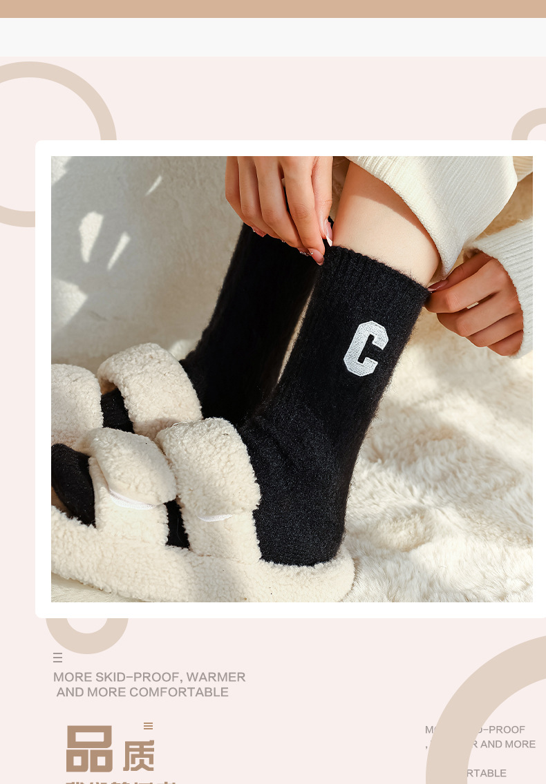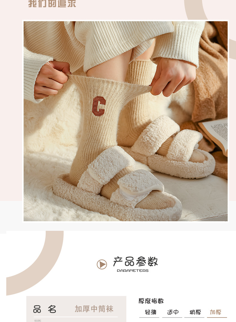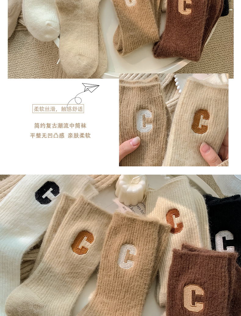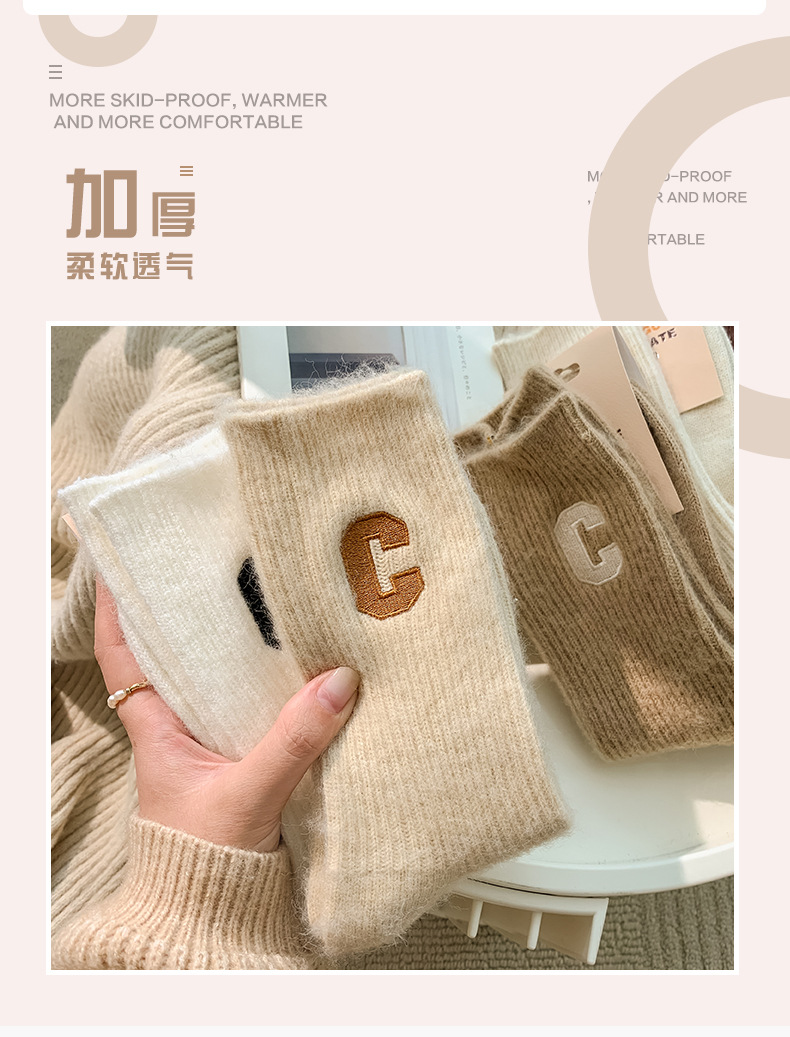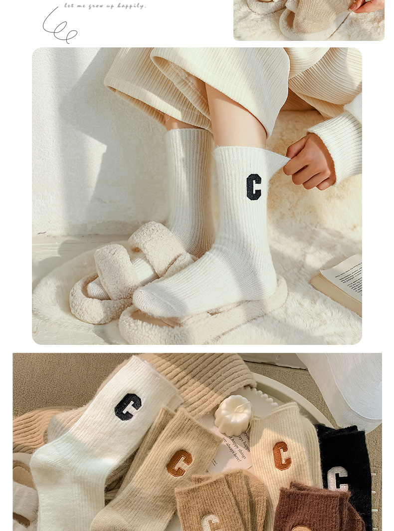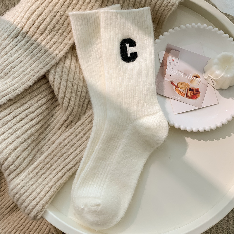 韩国袜子女秋冬中筒袜加绒加厚保暖刺绣字母C潮外穿保暖袜毛毛袜