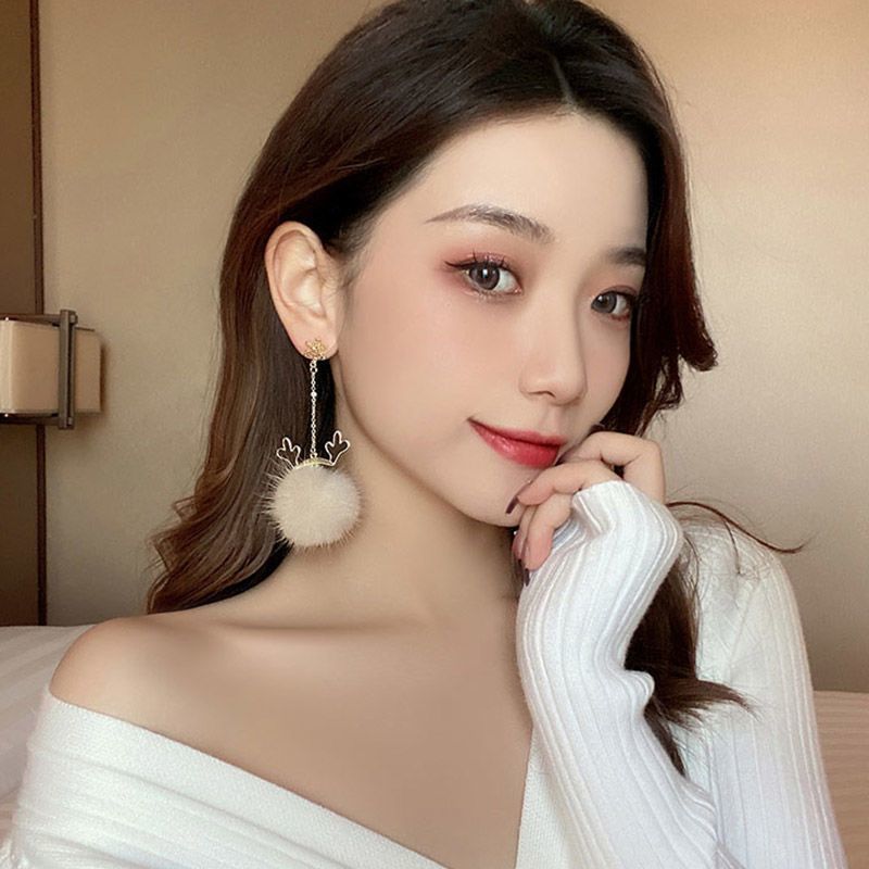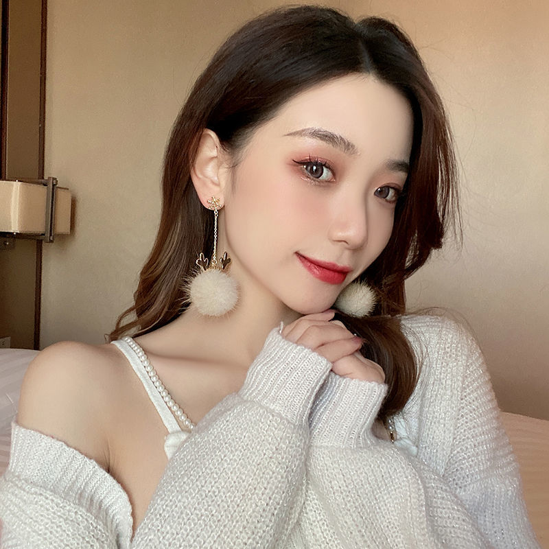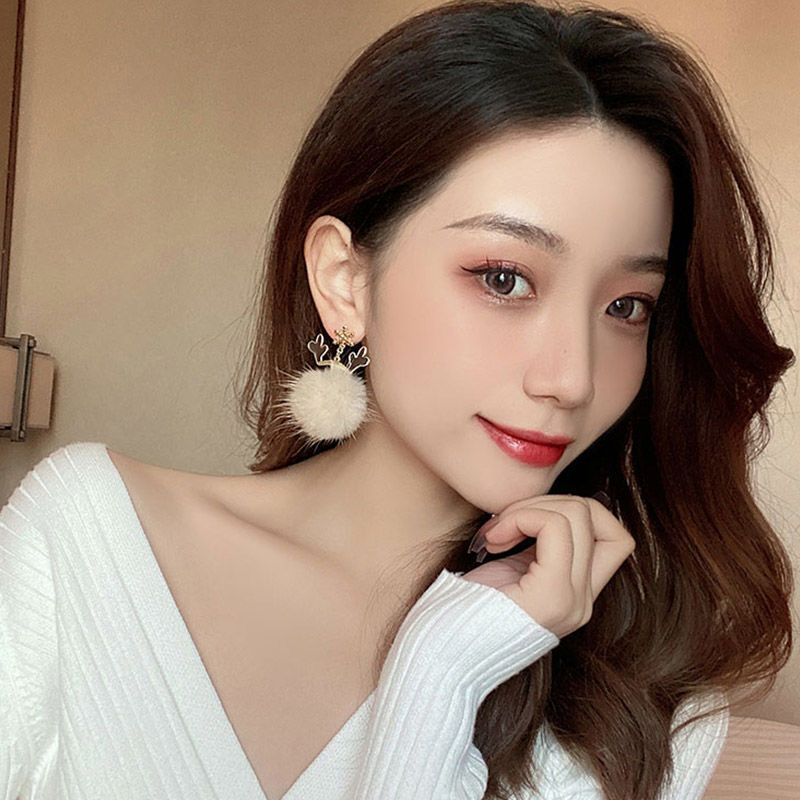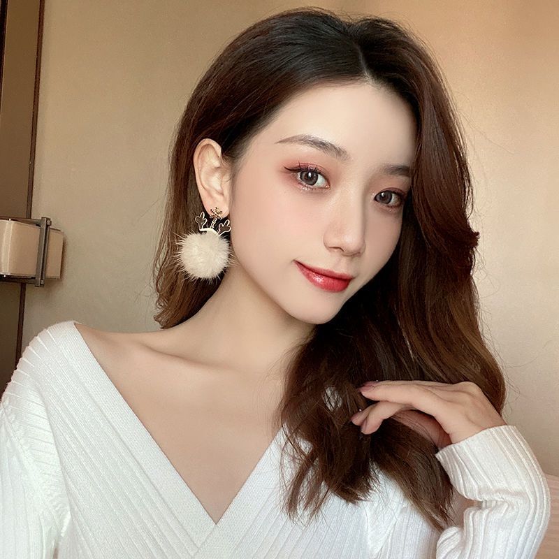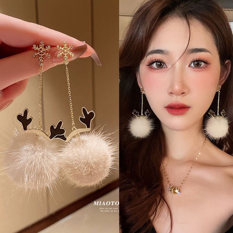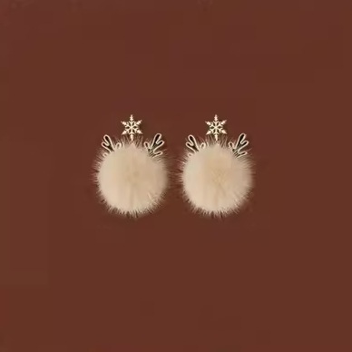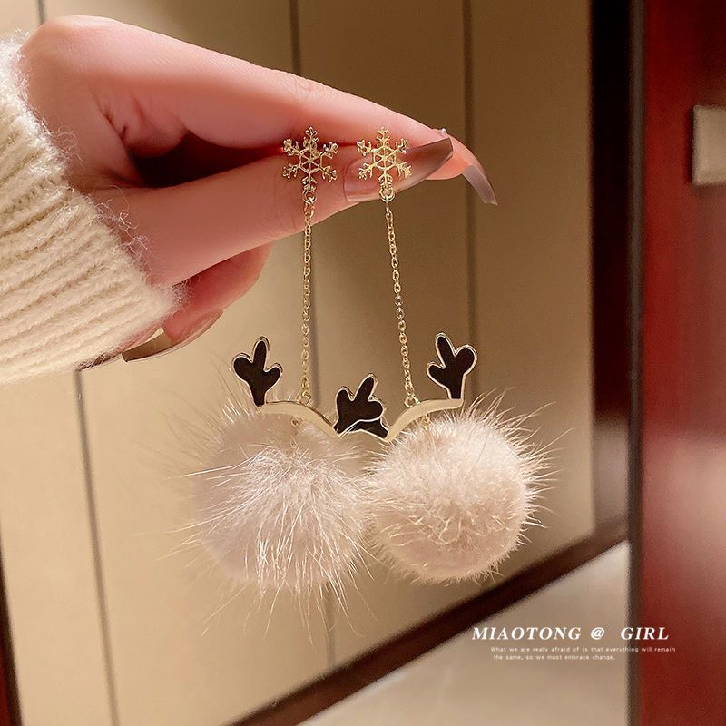 秋冬毛绒耳饰雪花麋鹿毛球耳环女显瘦耳坠个性设计感耳钉