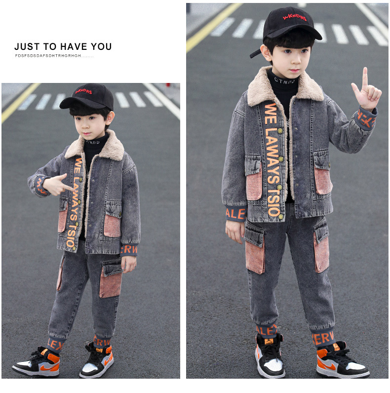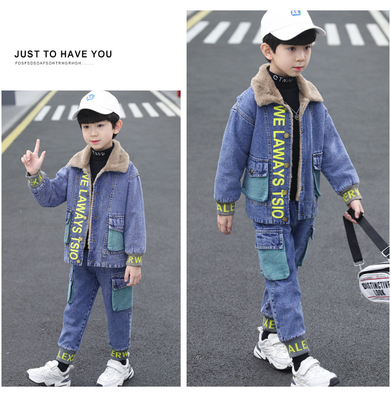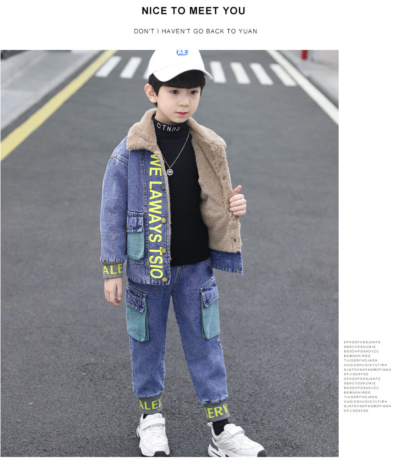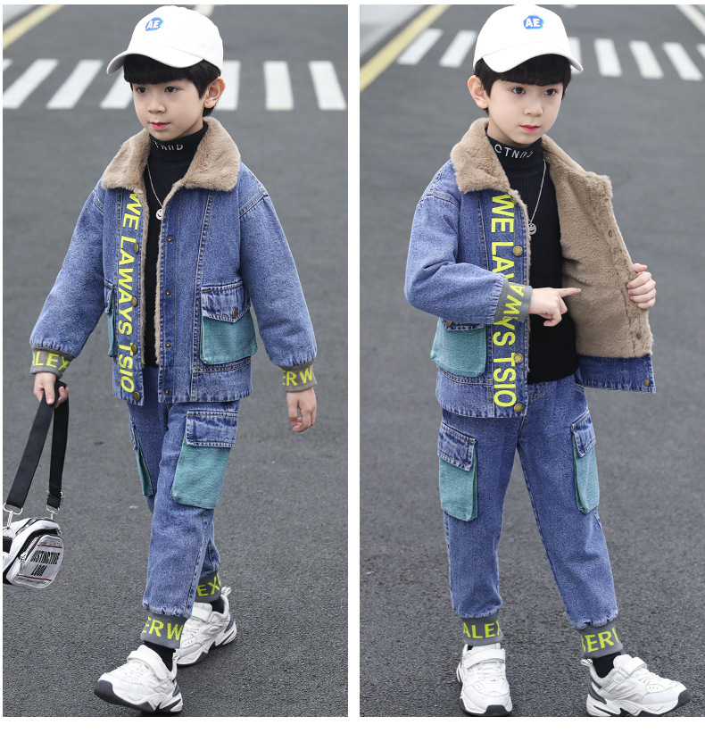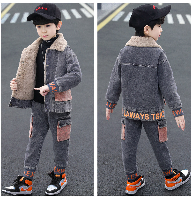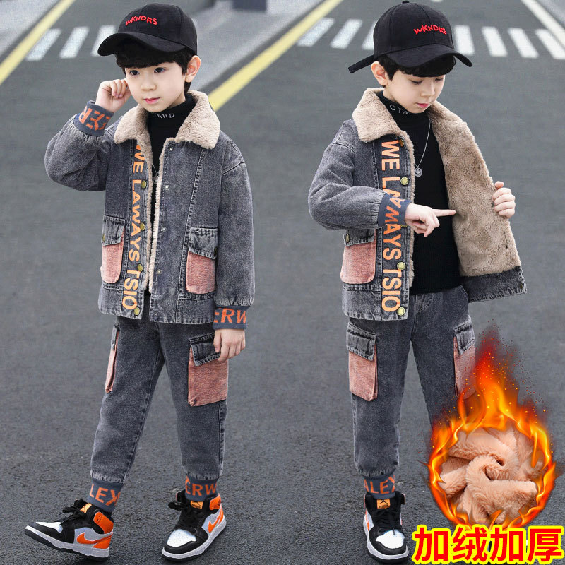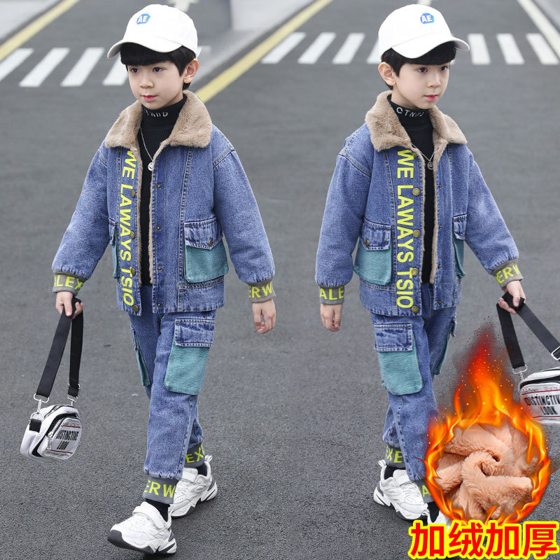 男童冬季加绒牛仔套装2023新款中大儿童加厚保暖牛仔裤外套两件套