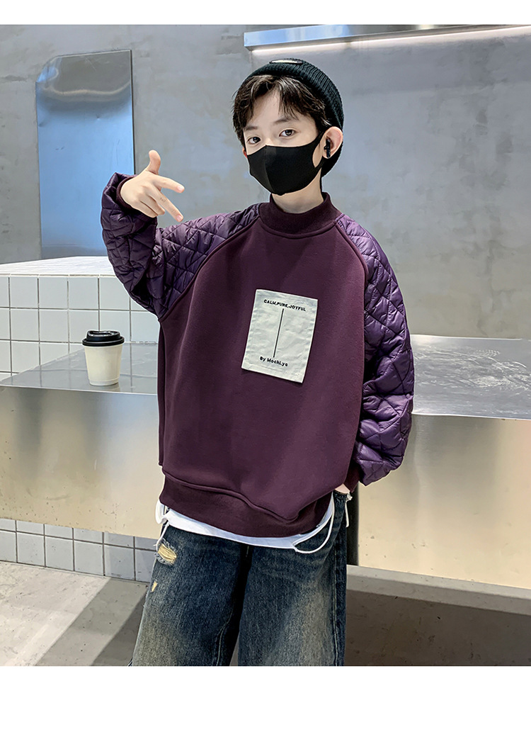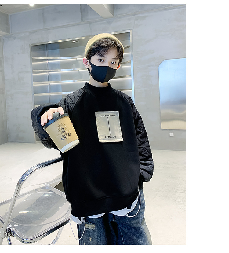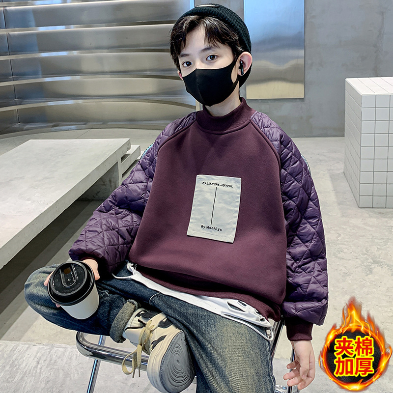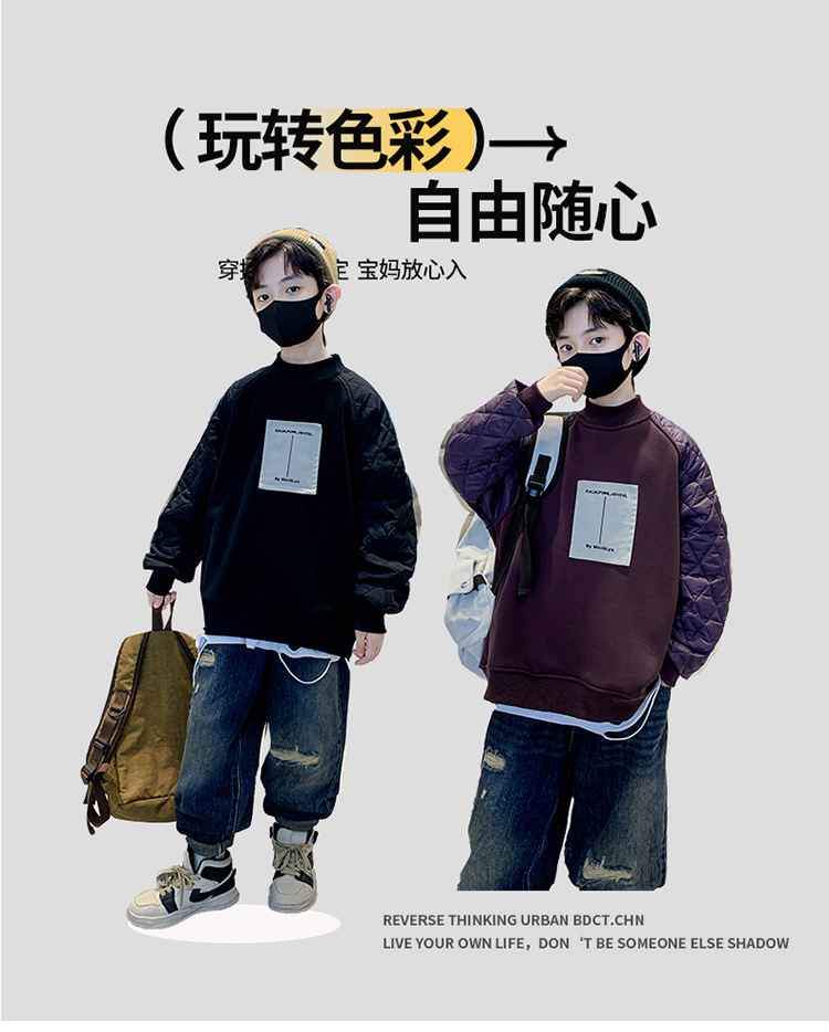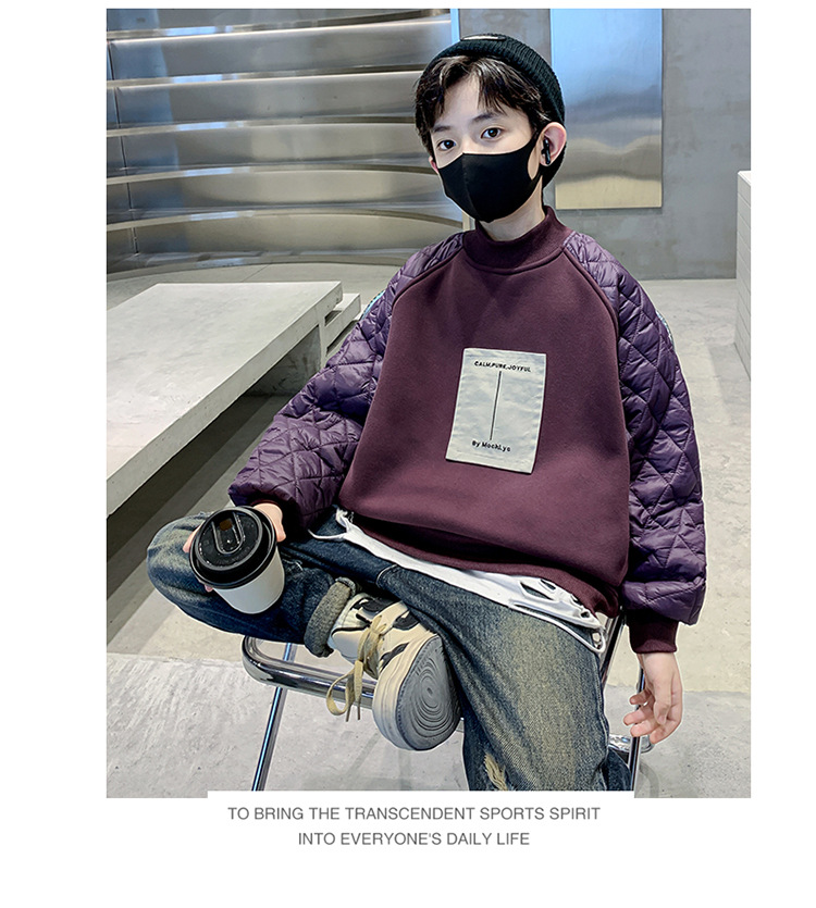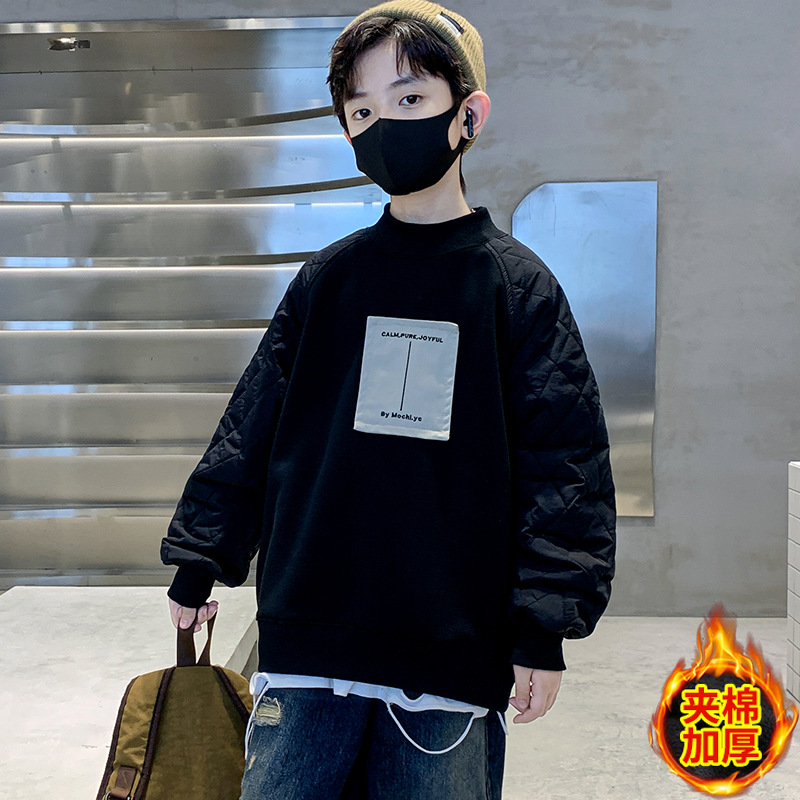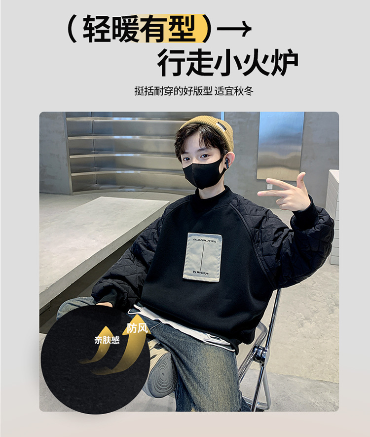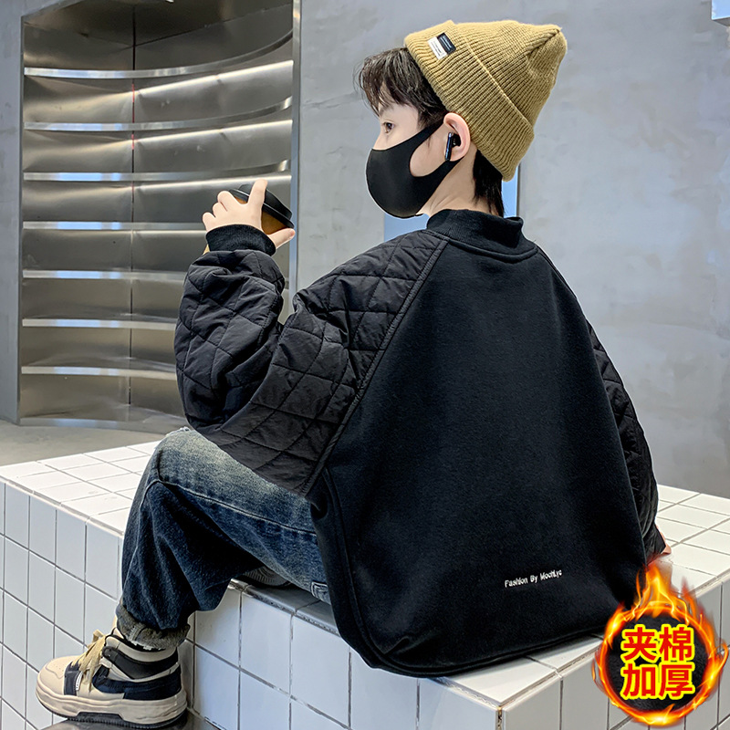 男童冬季拼接夹棉加绒卫衣2023新款中大儿童休闲加厚保暖卫衣冬装