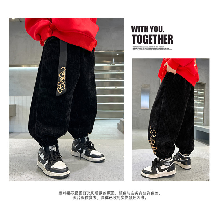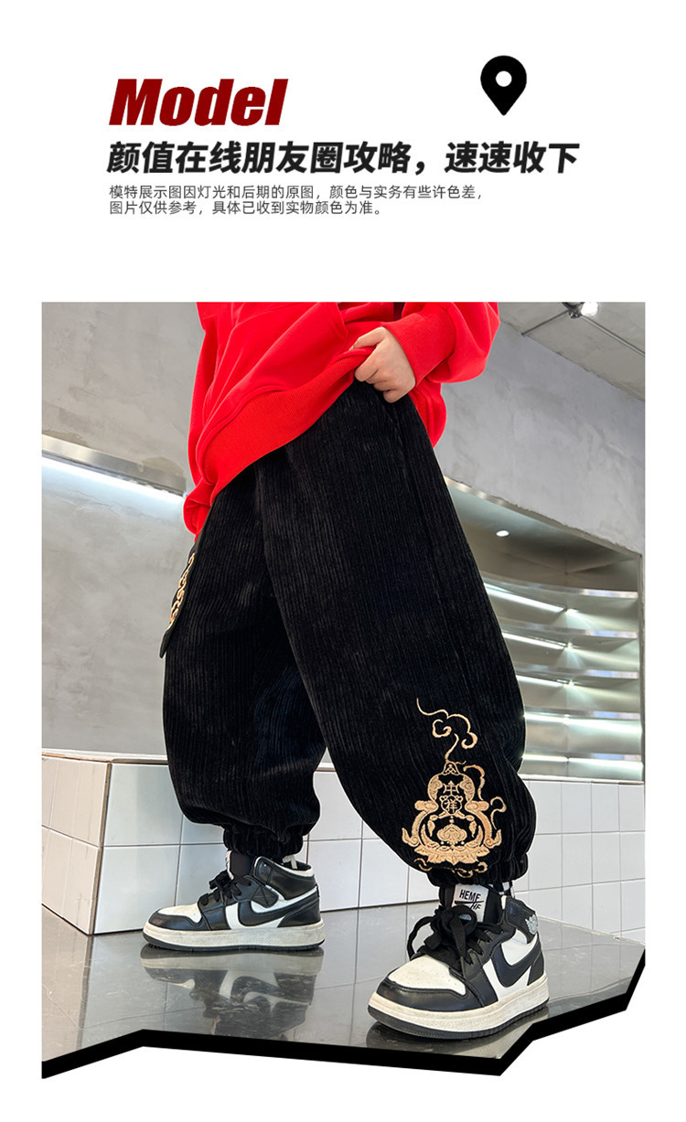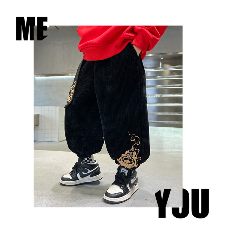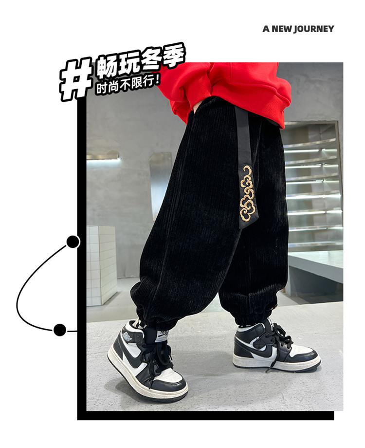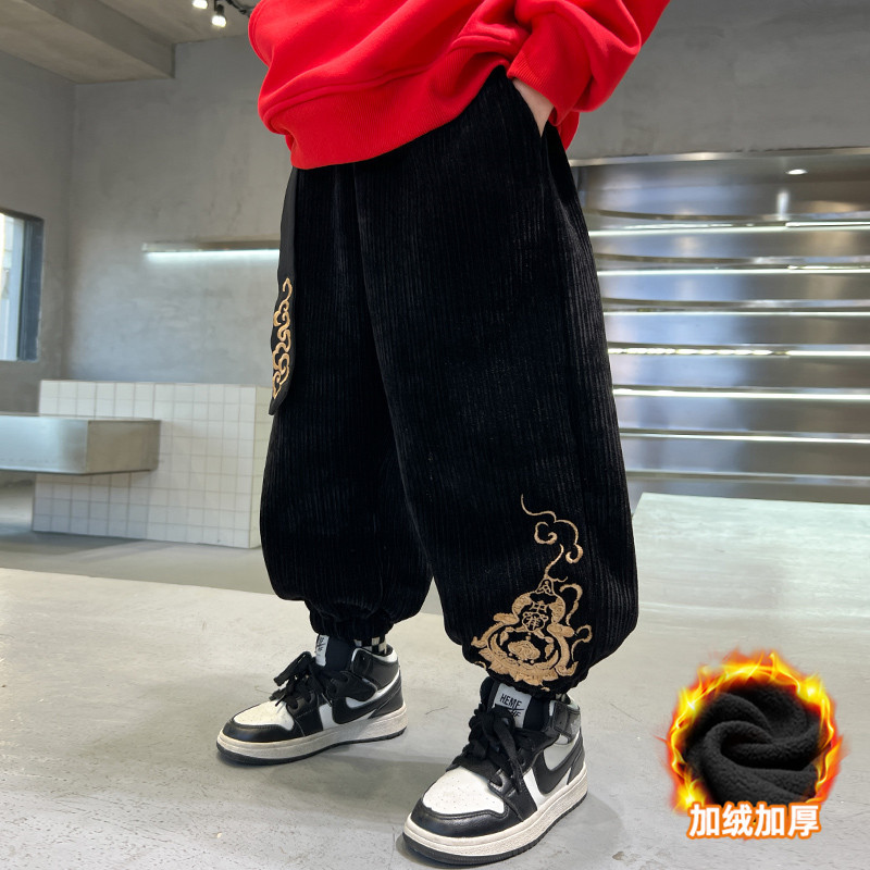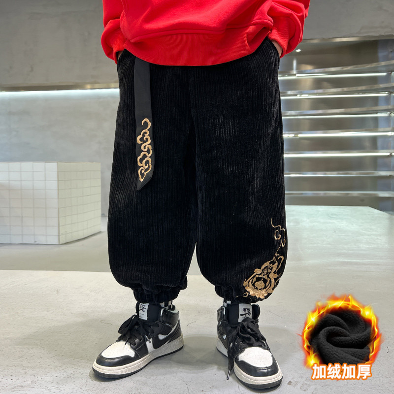 男童冬季条绒刺绣束脚裤2023新款大儿童加绒加厚保暖休闲裤长裤子