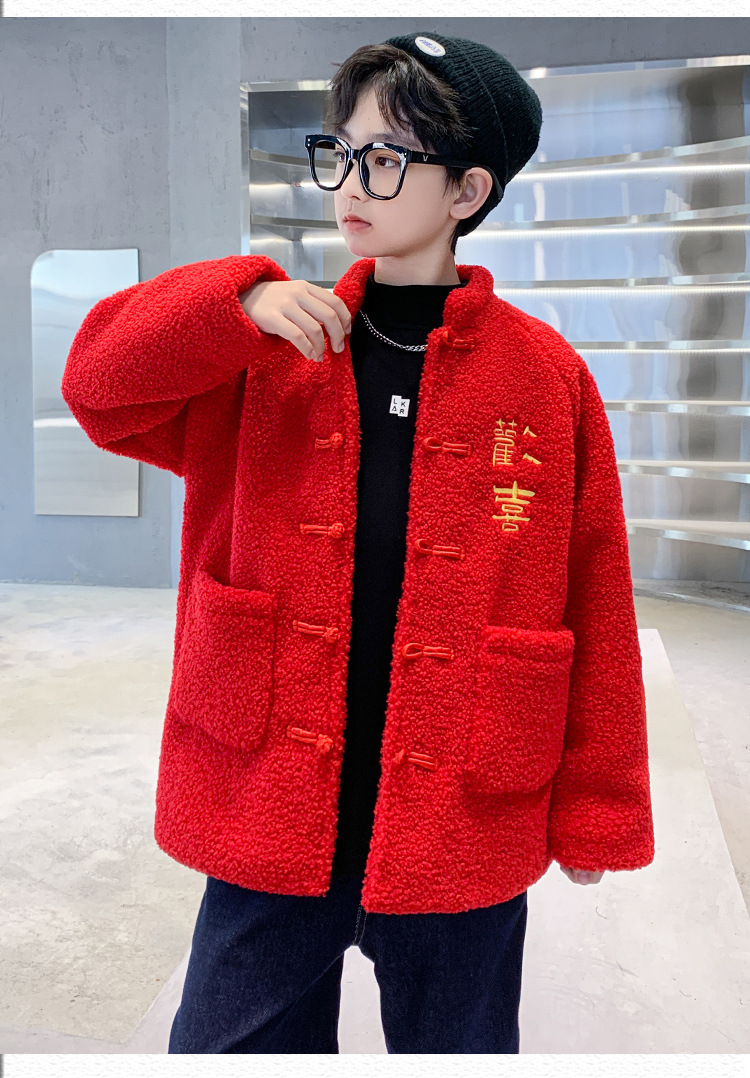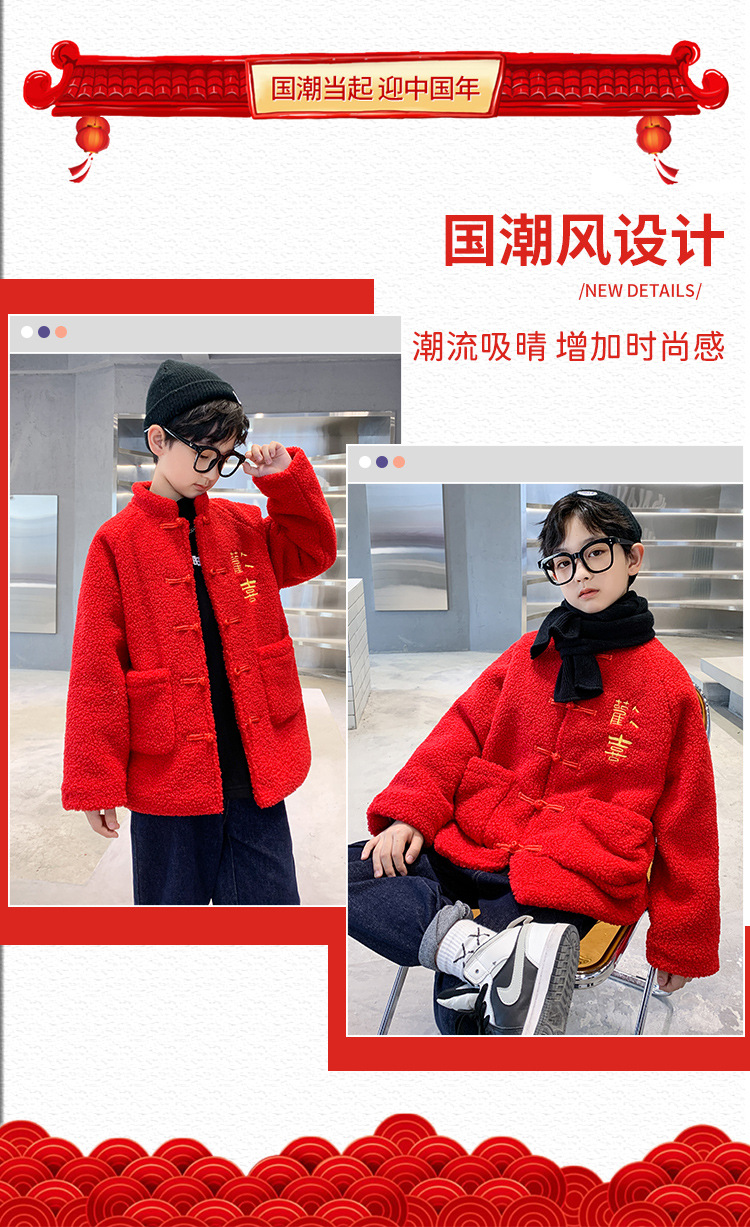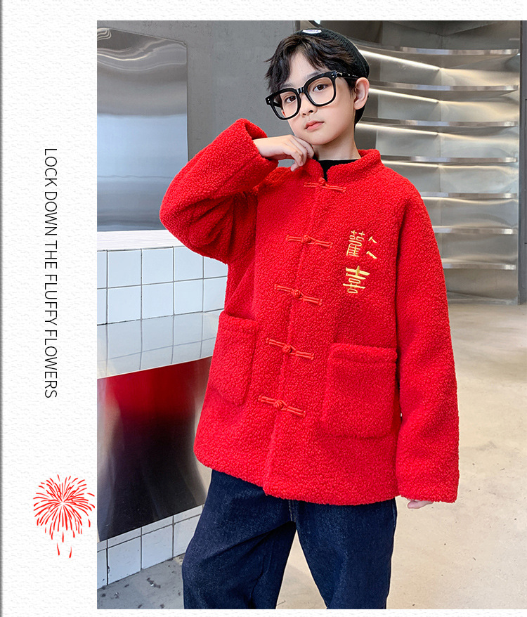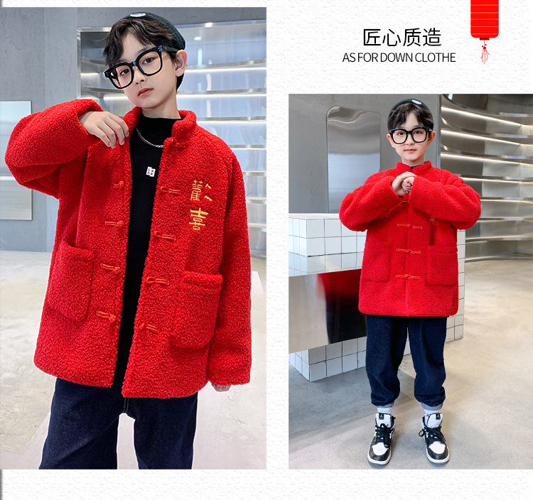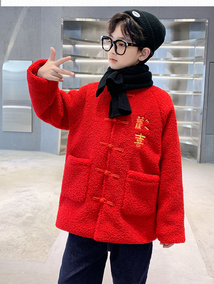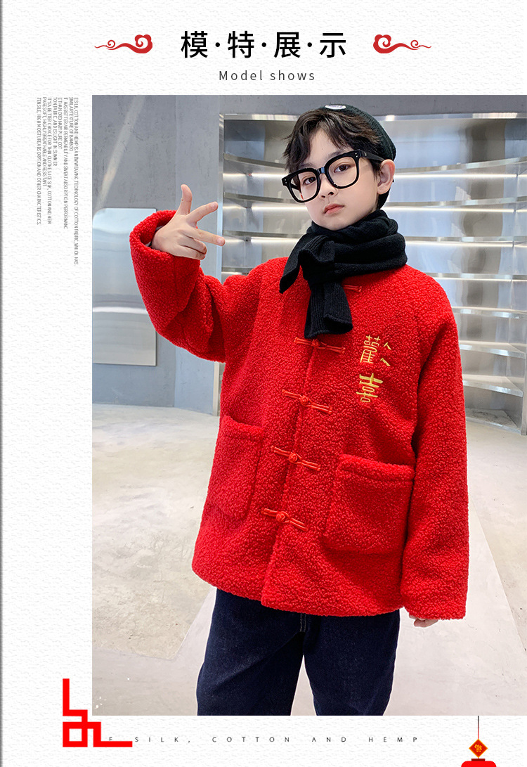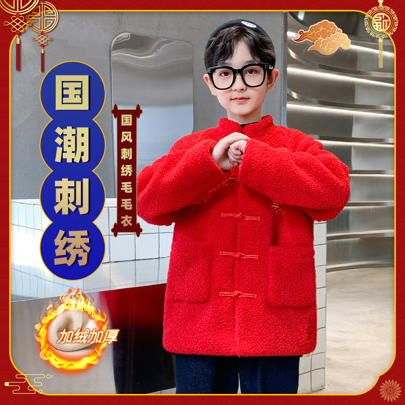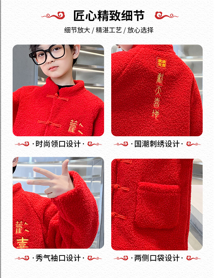 男童冬季国风欢喜刺绣毛毛衣拜年服2023新款儿童加绒加厚保暖外套