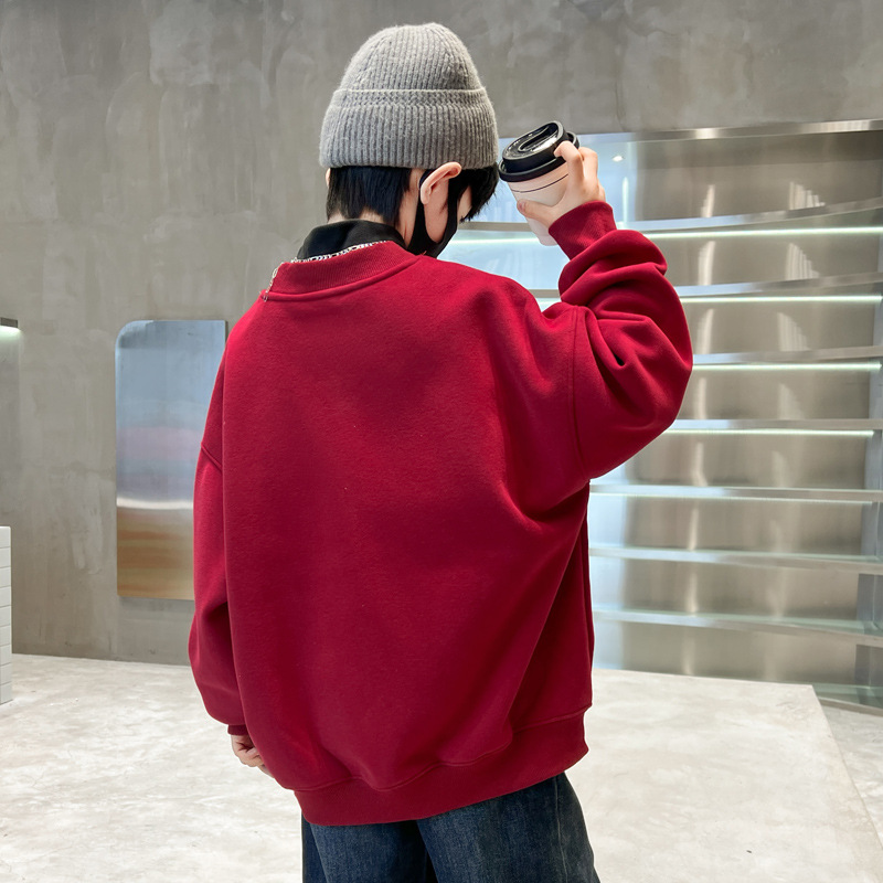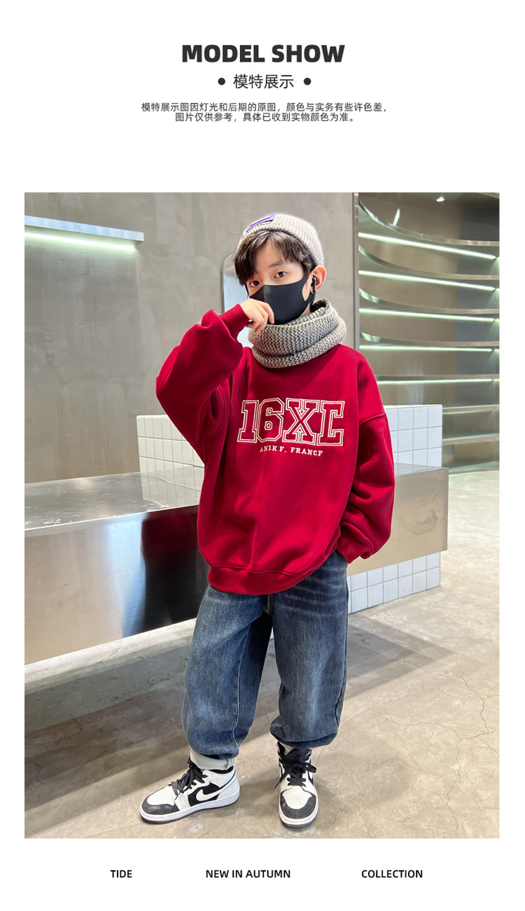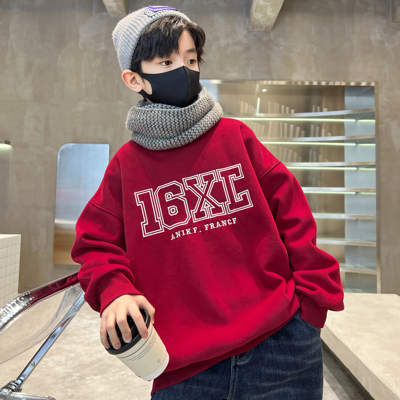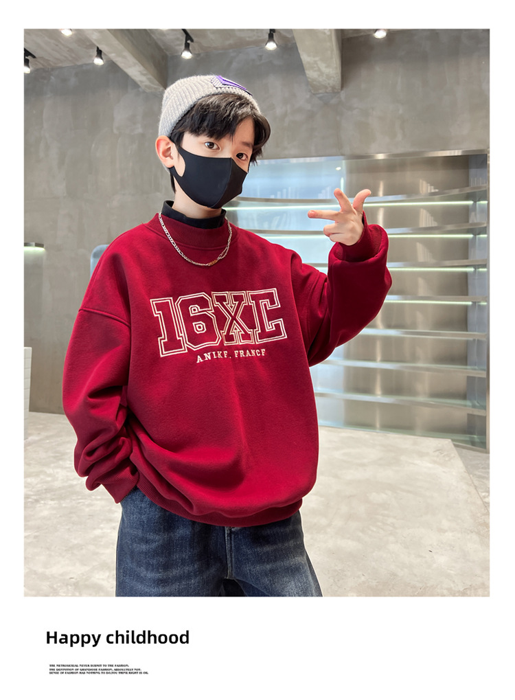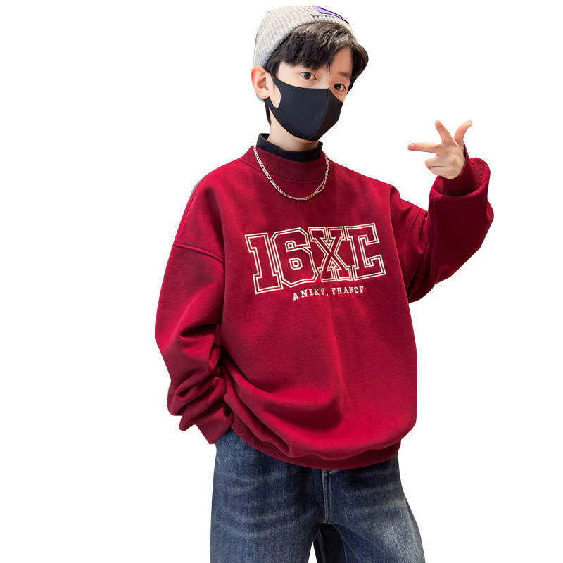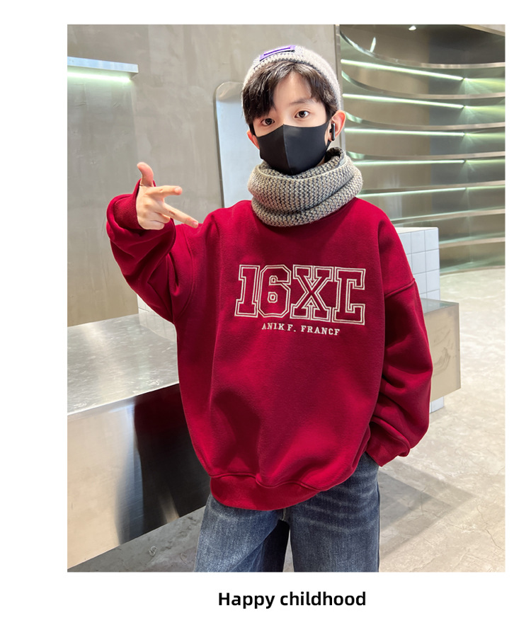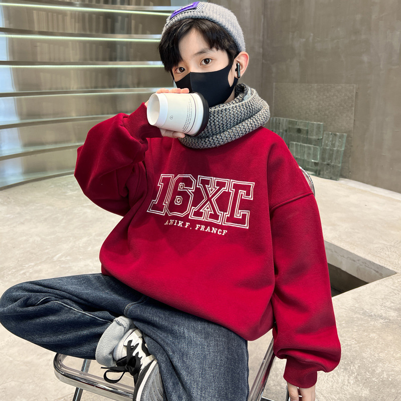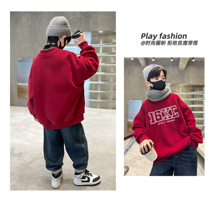 男童冬季假两件加绒卫衣2023新款大儿童休闲加厚保暖字母卫衣冬装