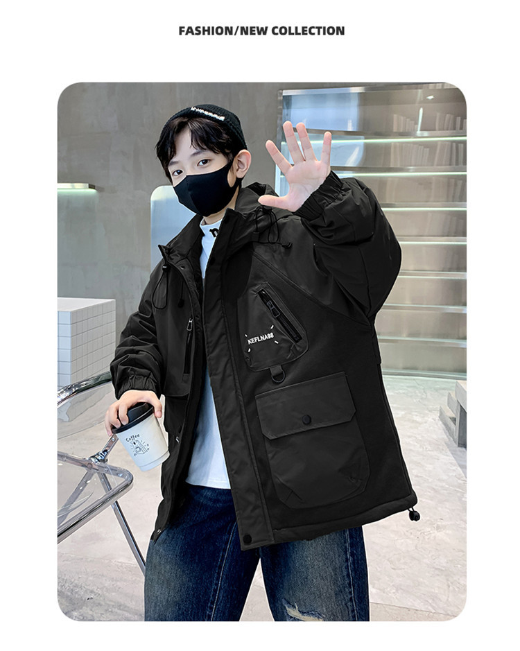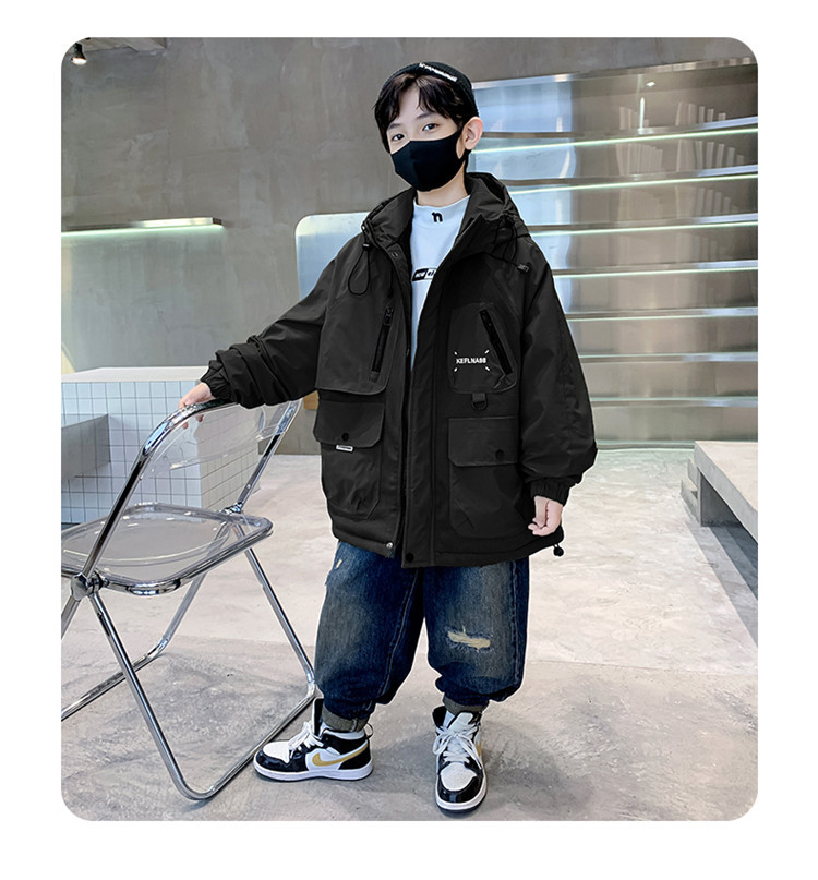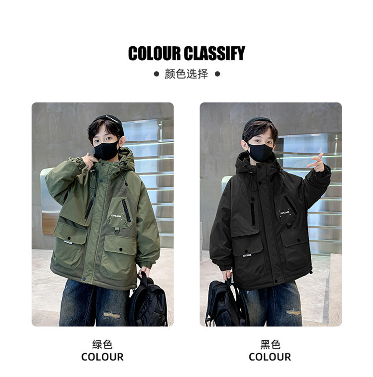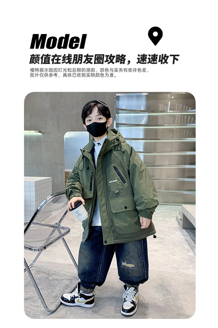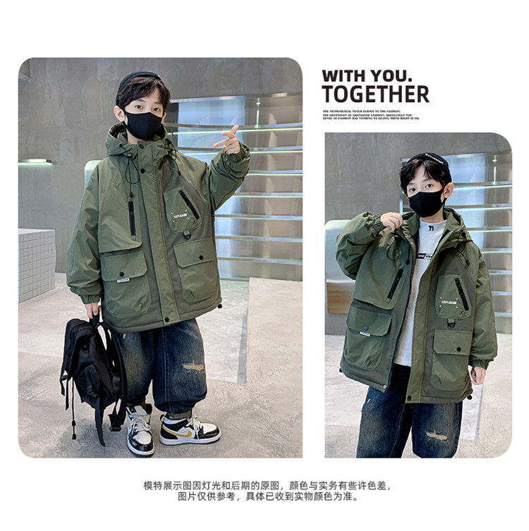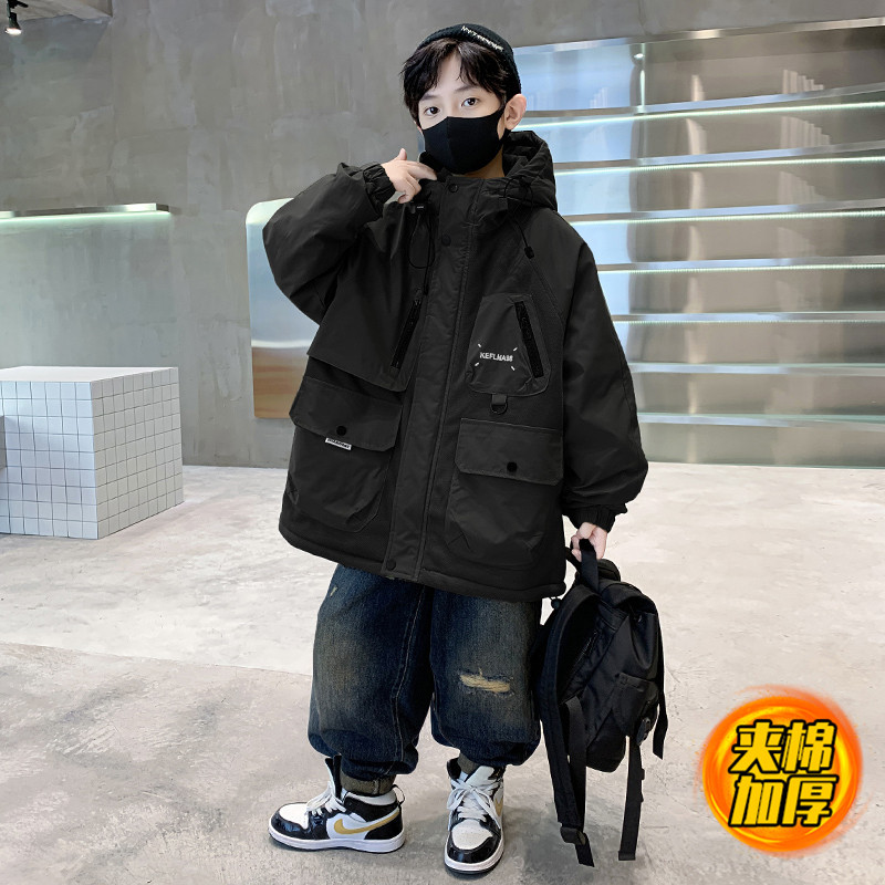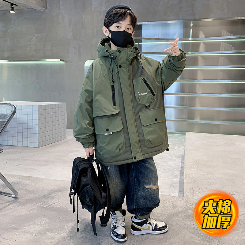 男童冬季夹棉工装派克服2023新款中大儿童装加厚保暖连帽风衣外套