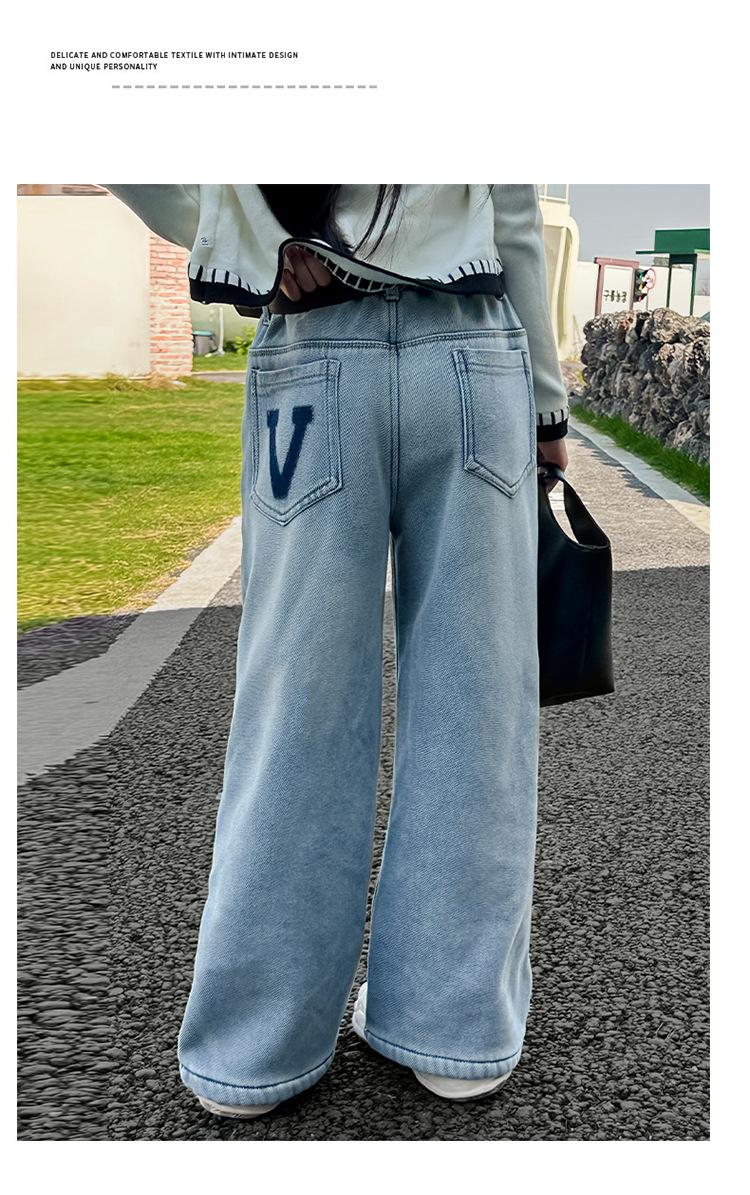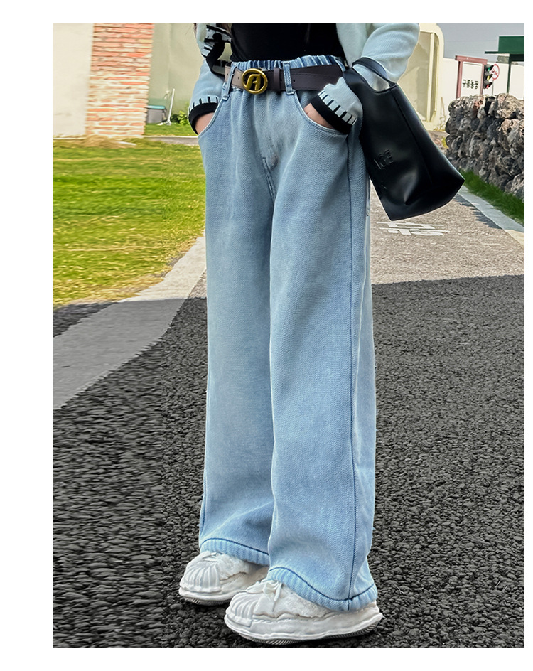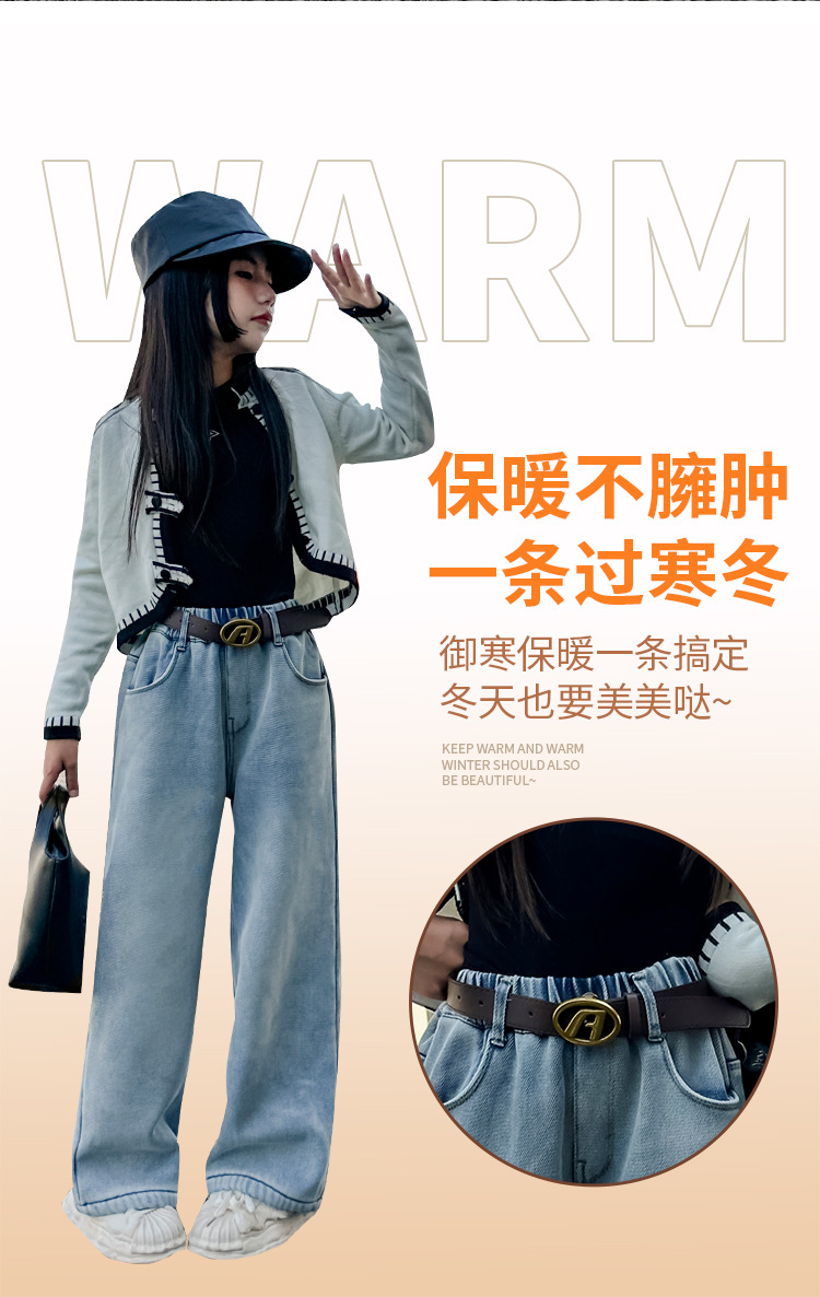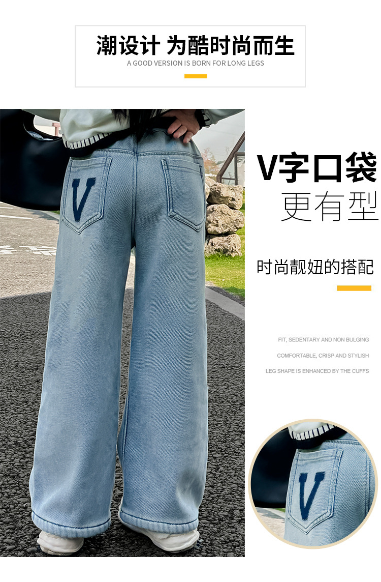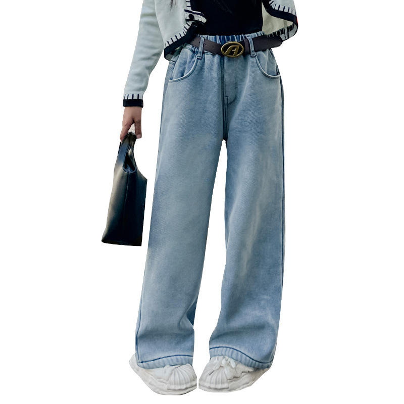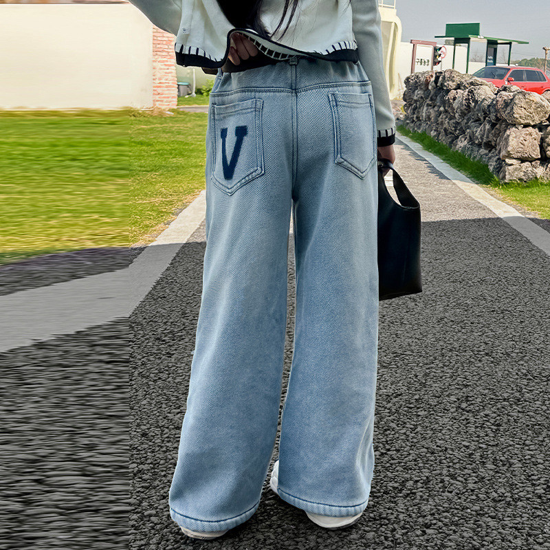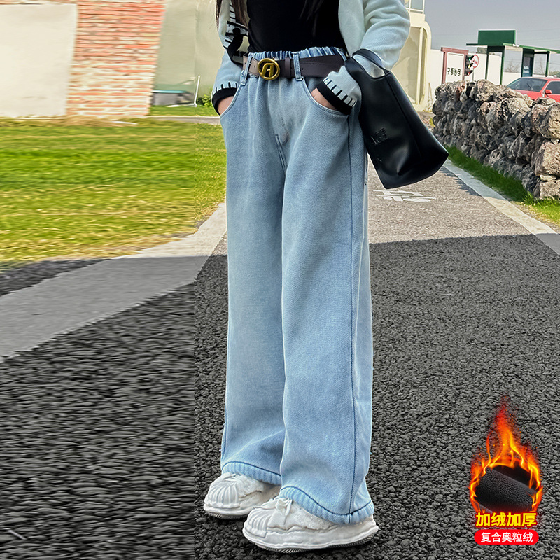 女童冬季加绒牛仔拖地裤2023新款中大儿童加厚保暖休闲裤长裤子潮