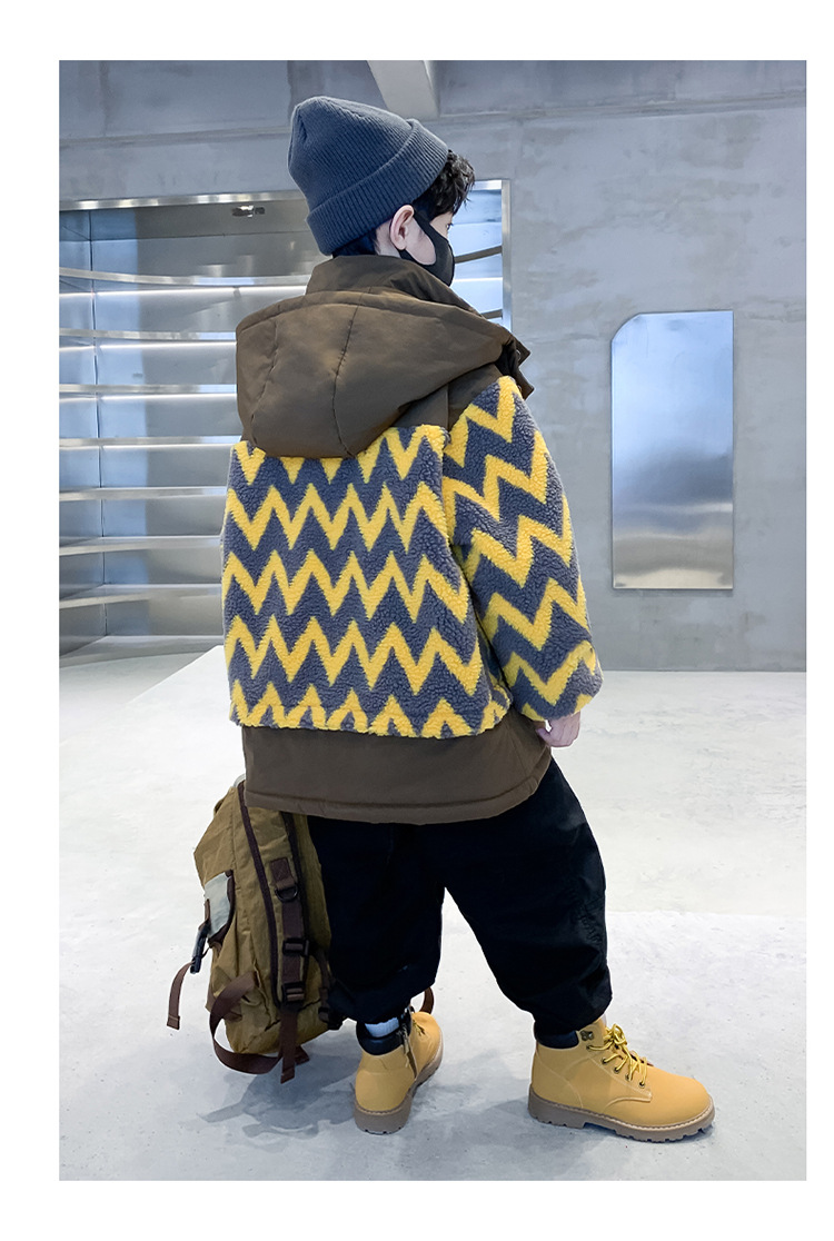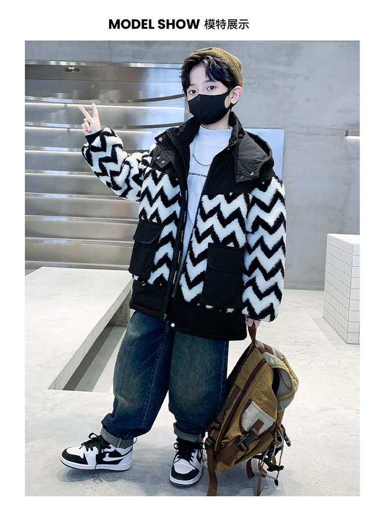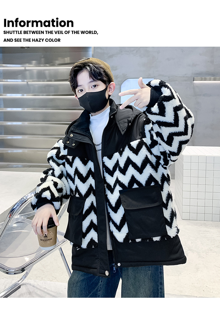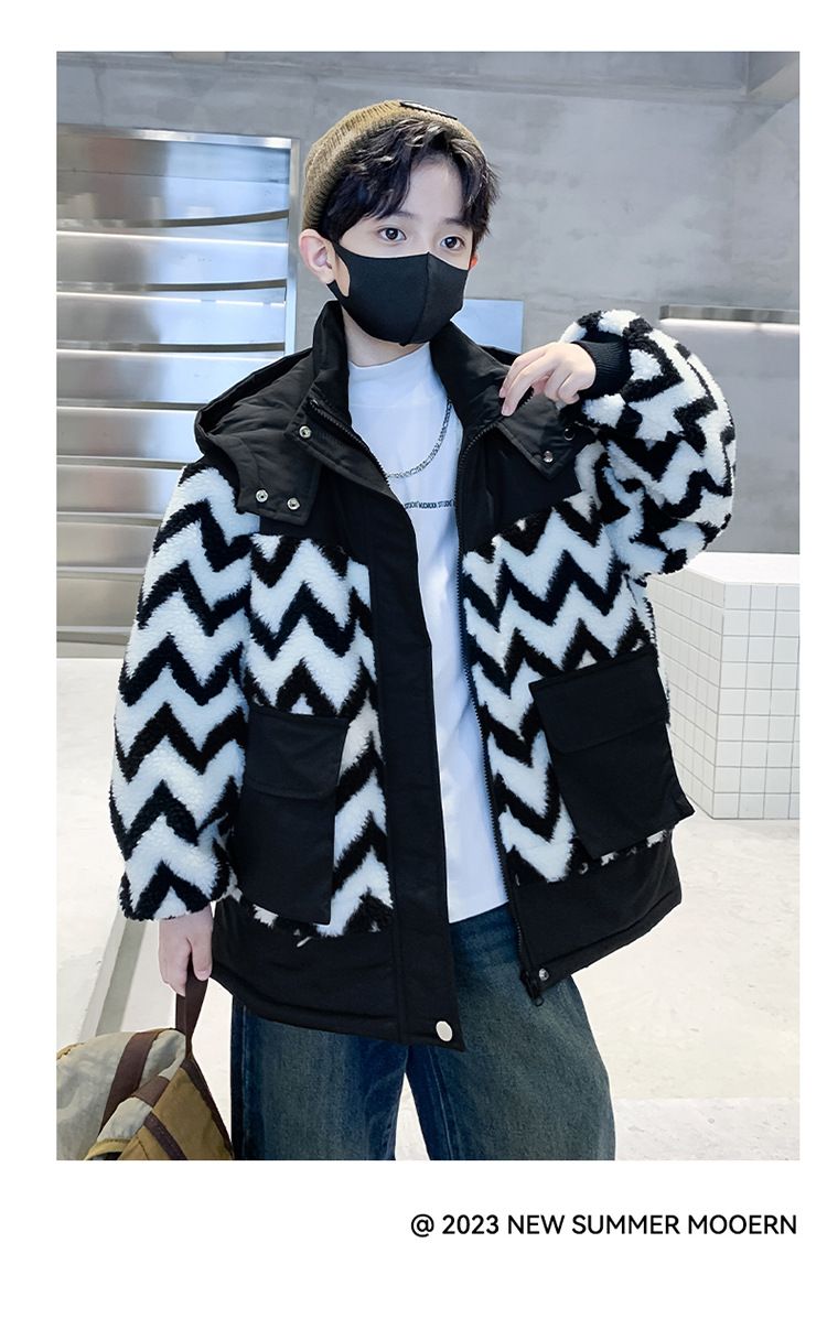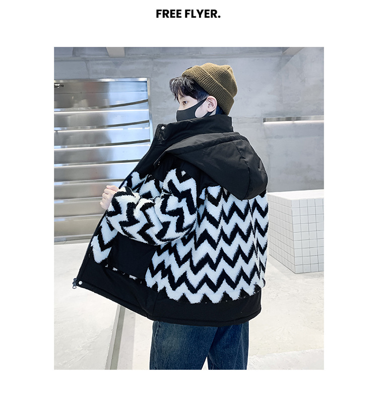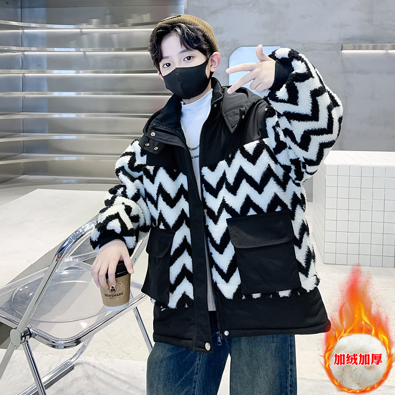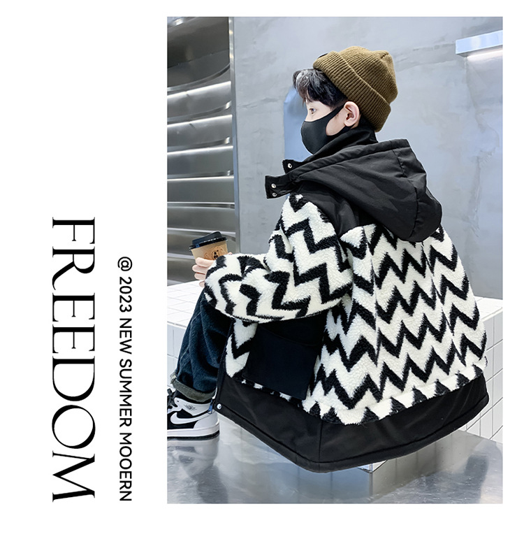 男童冬季波浪连帽毛毛衣2023新款大儿童加绒加厚保暖风衣外套冬装