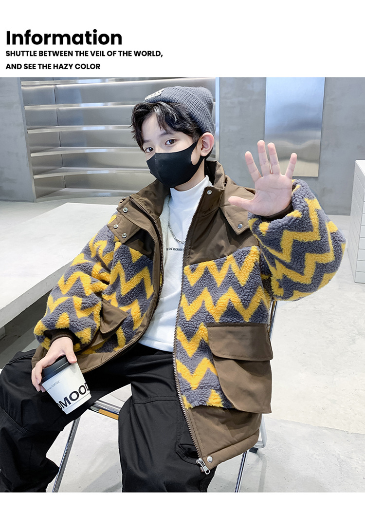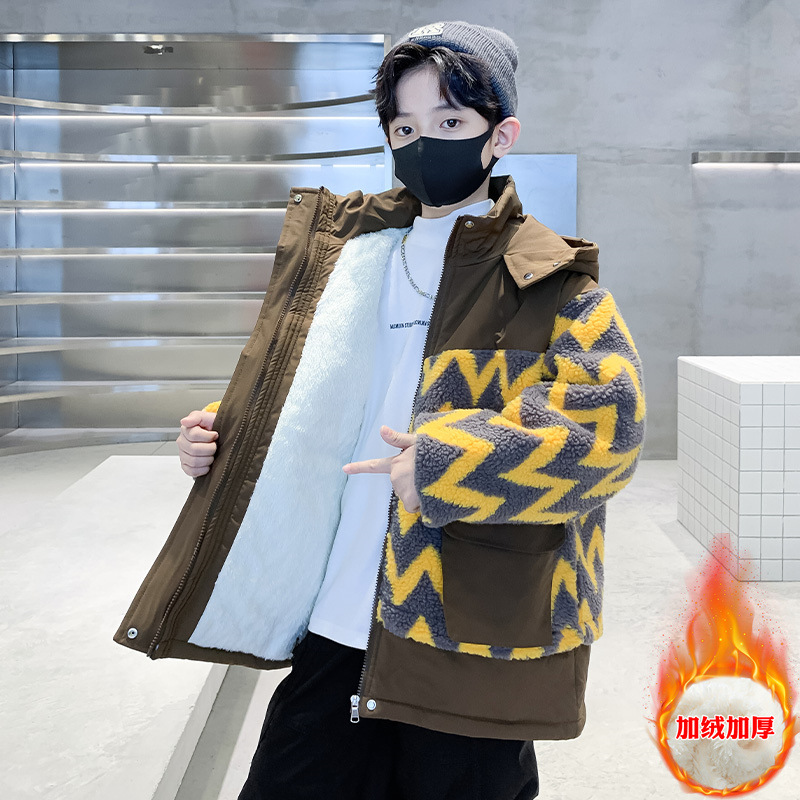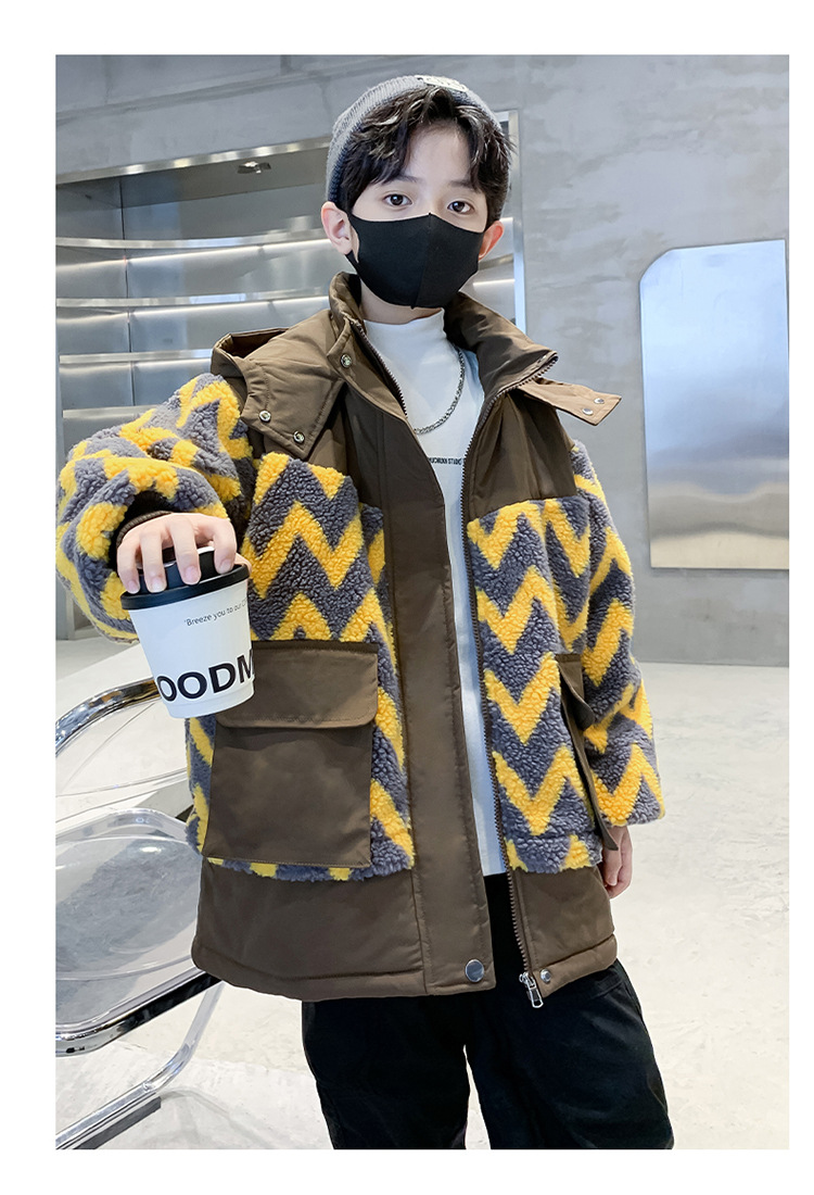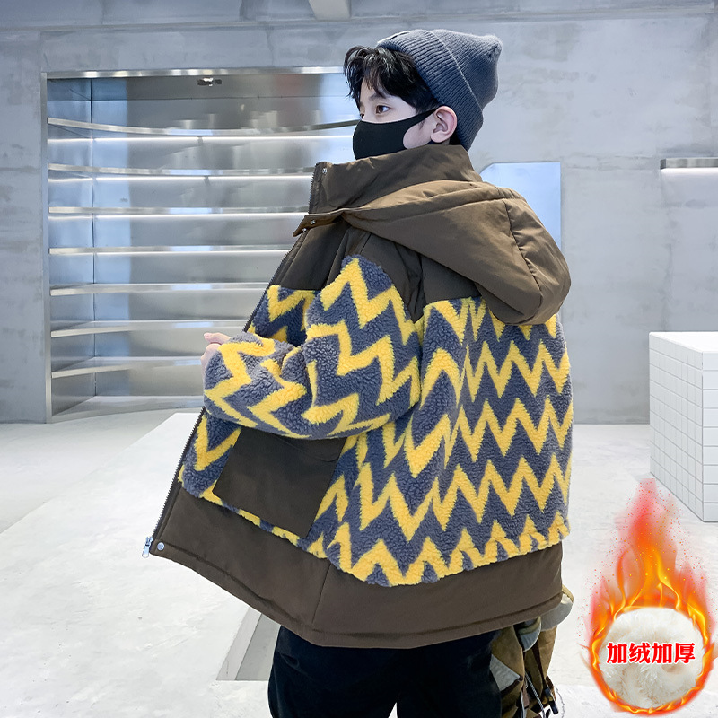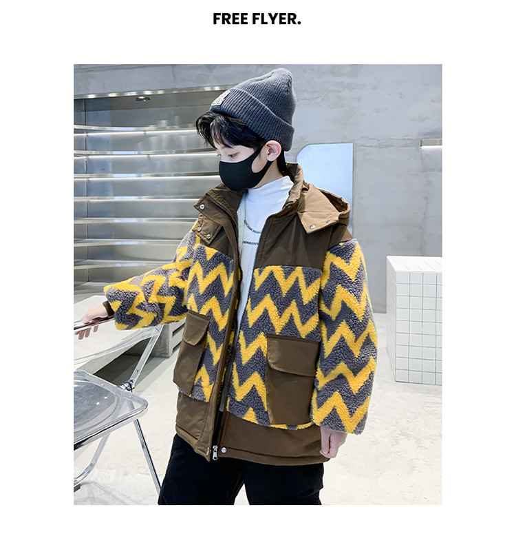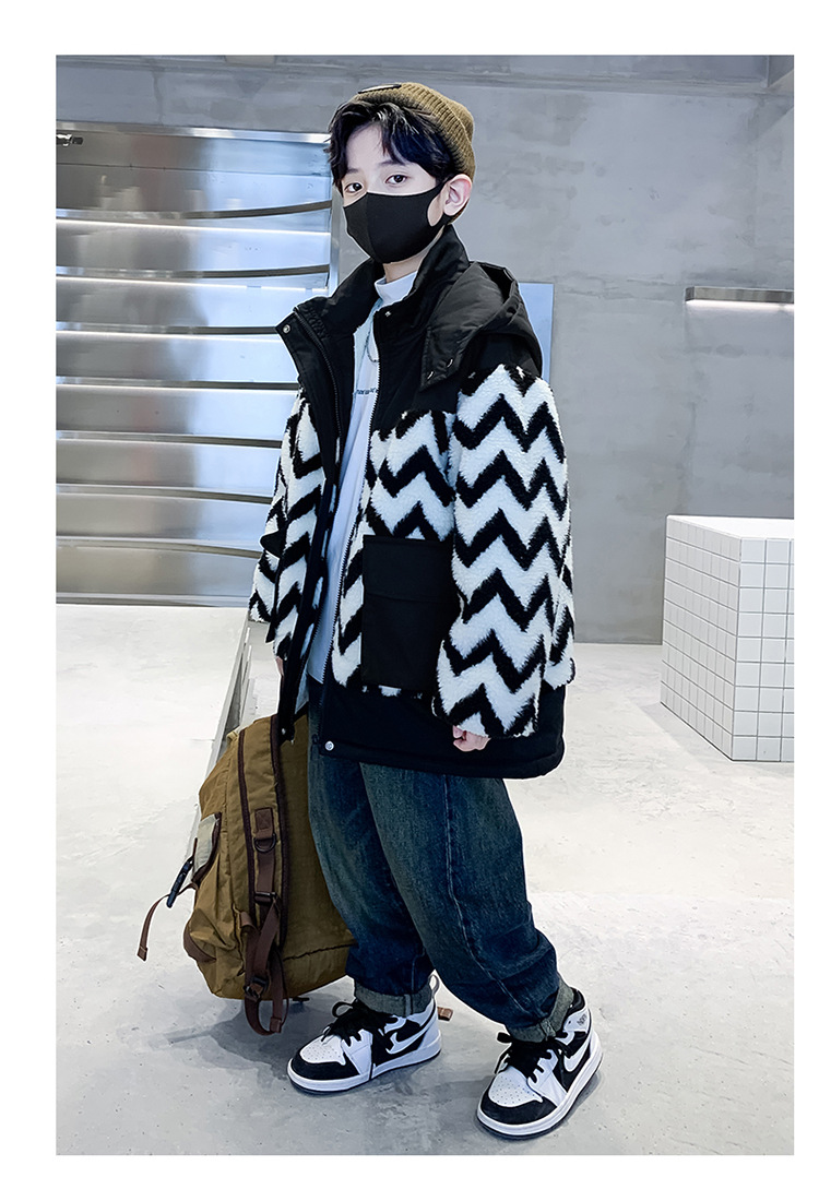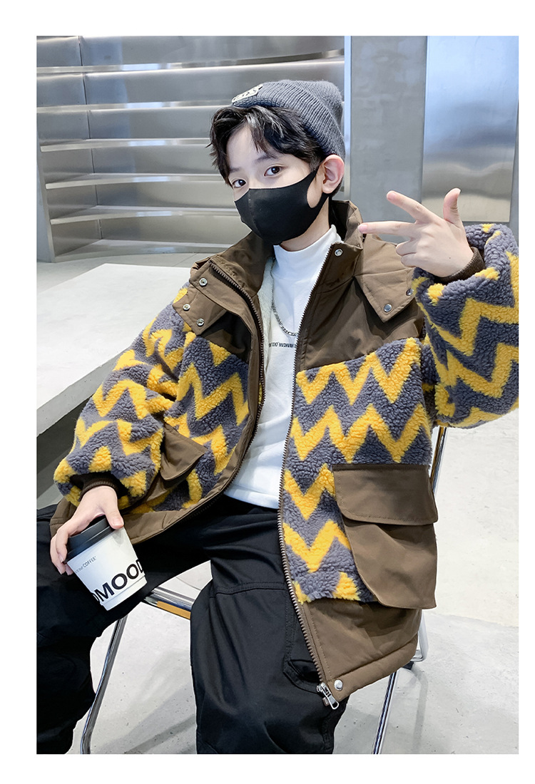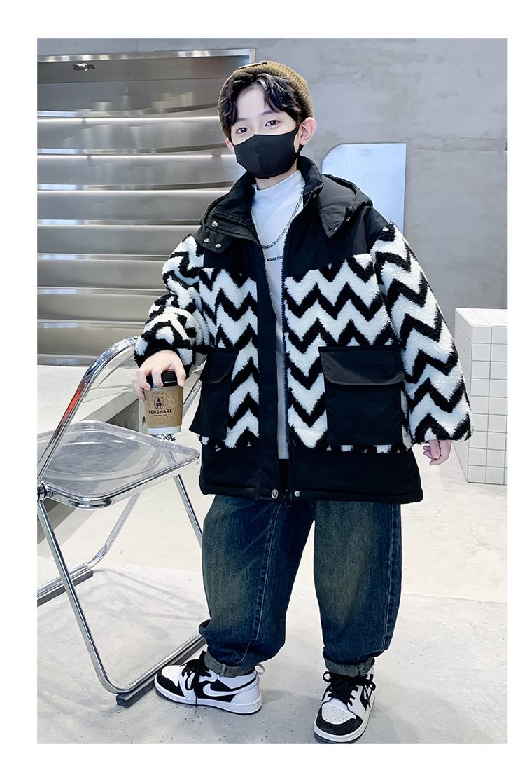 男童冬季波浪连帽毛毛衣2023新款大儿童加绒加厚保暖风衣外套冬装