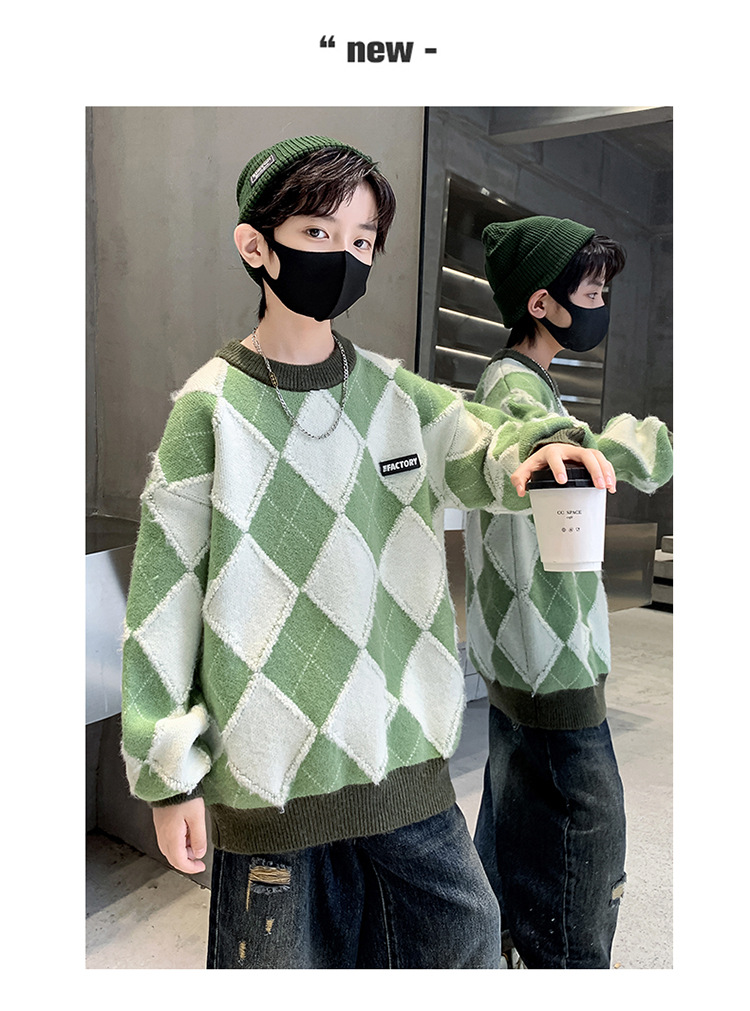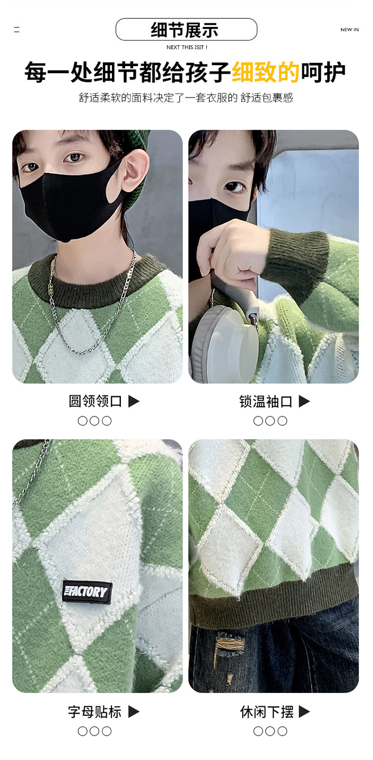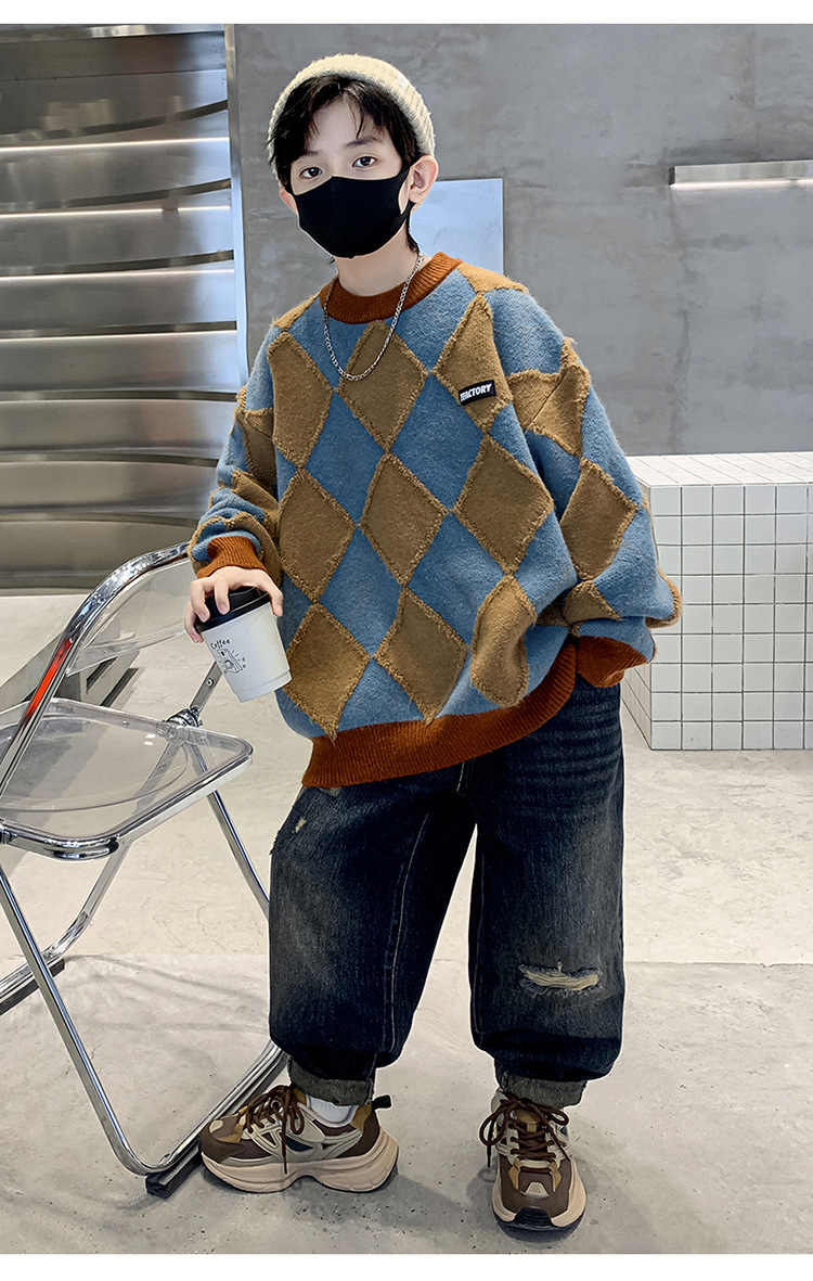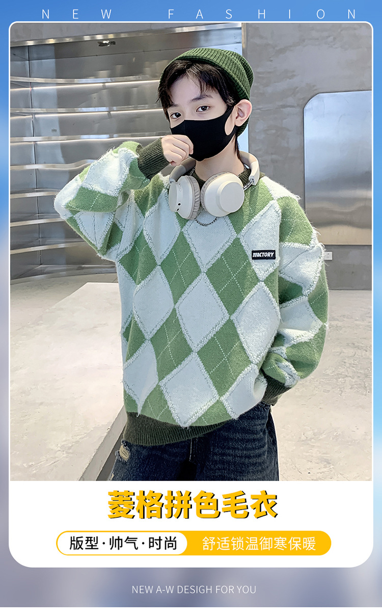 男童冬季菱形套头毛衣2023新款中大儿童洋气休闲加厚保暖针织线衫