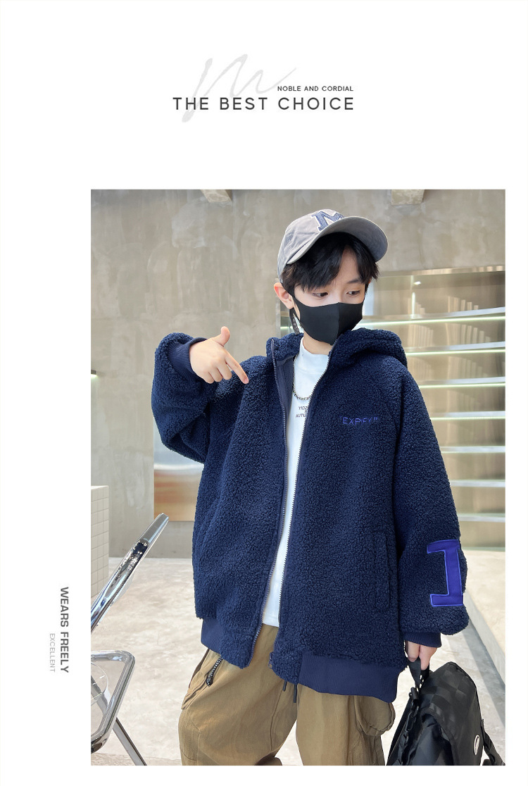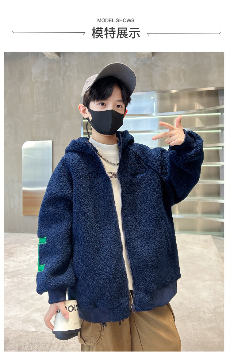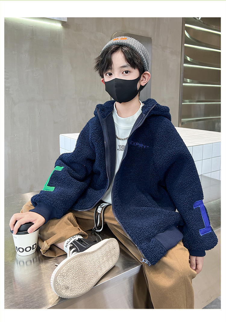 男童秋冬季加绒字母毛毛衣外套2023新款儿童洋气加厚保暖连帽风衣