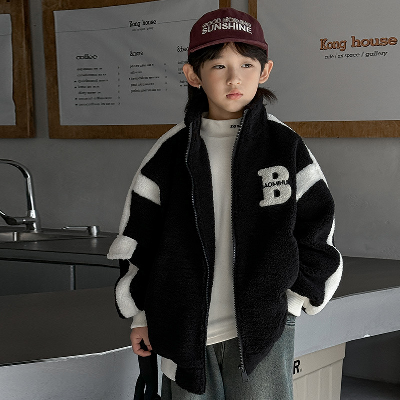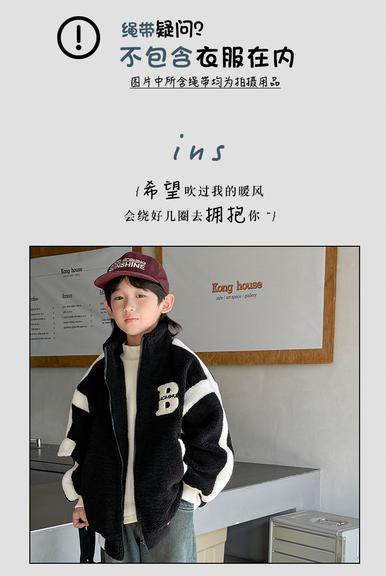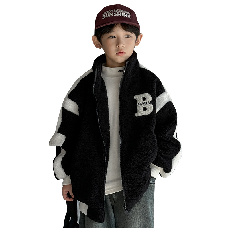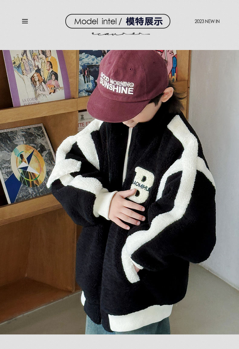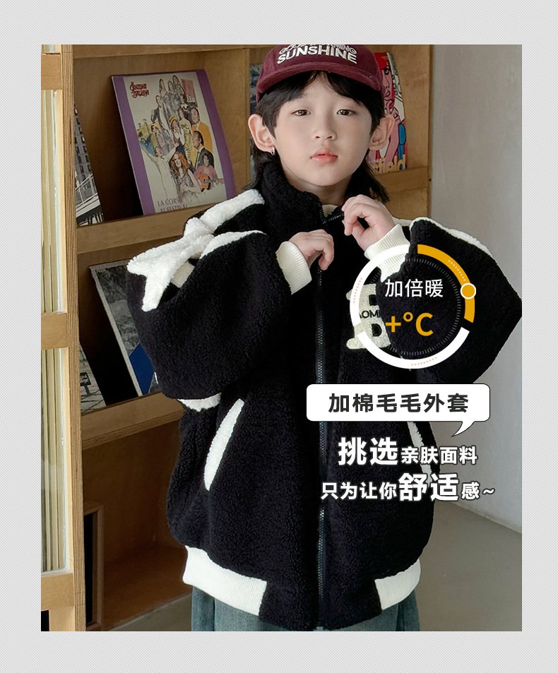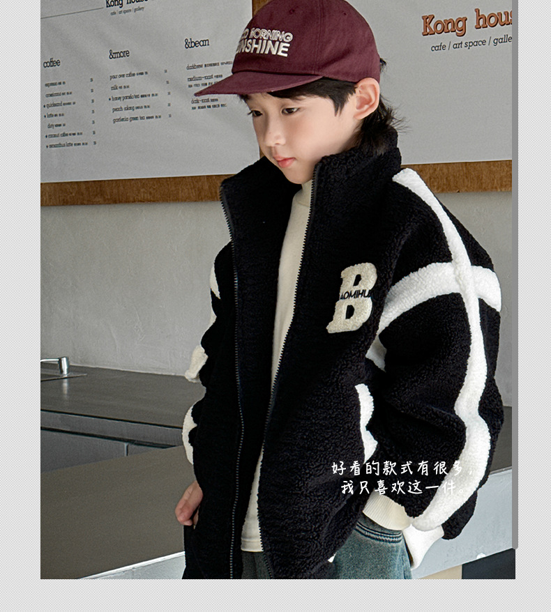 男童冬季波浪连帽毛毛衣2023新款大儿童加绒加厚保暖风衣外套冬装