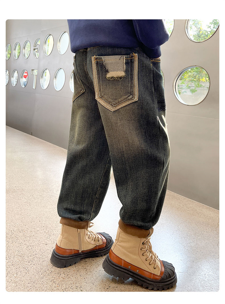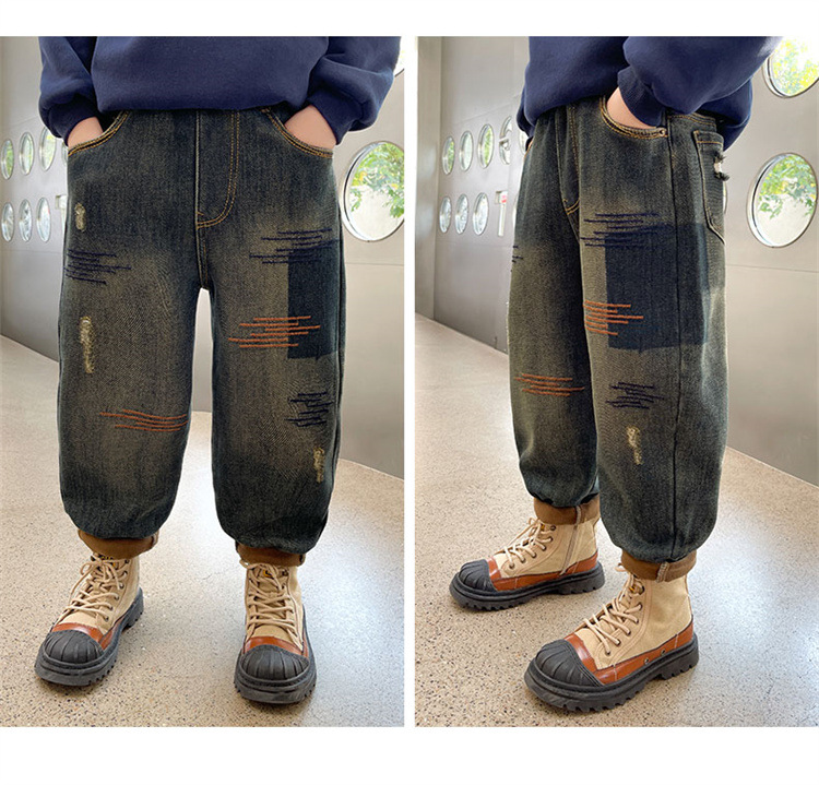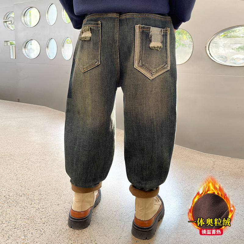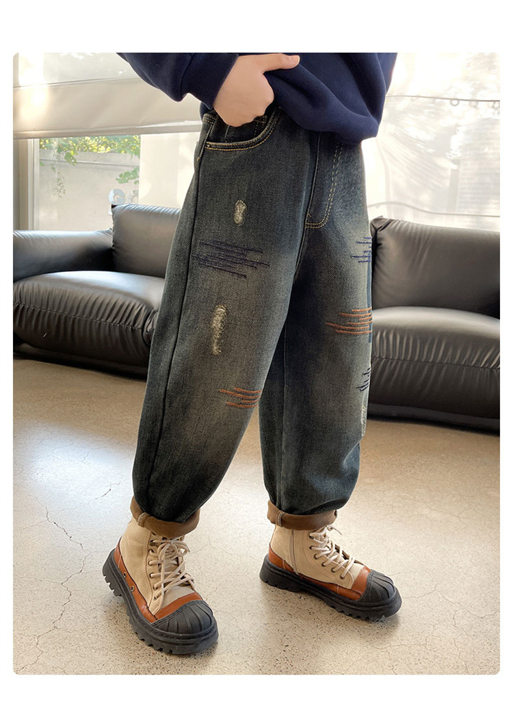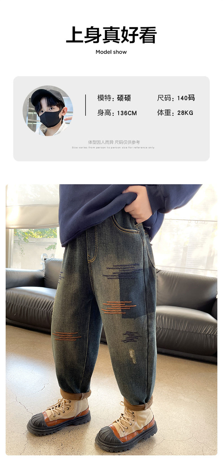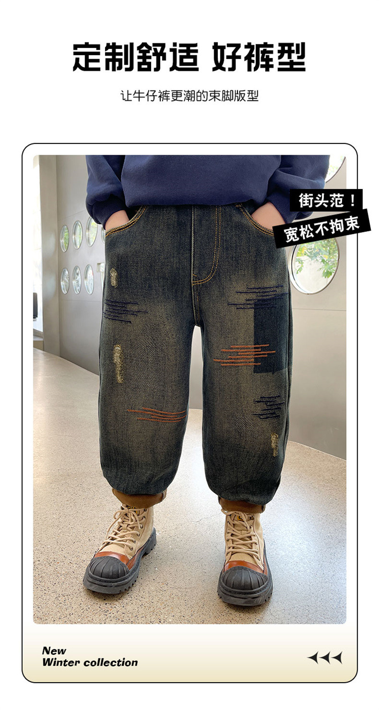 男童冬季条纹刺绣加绒牛仔裤2023新款大儿童装加厚保暖休闲长裤子