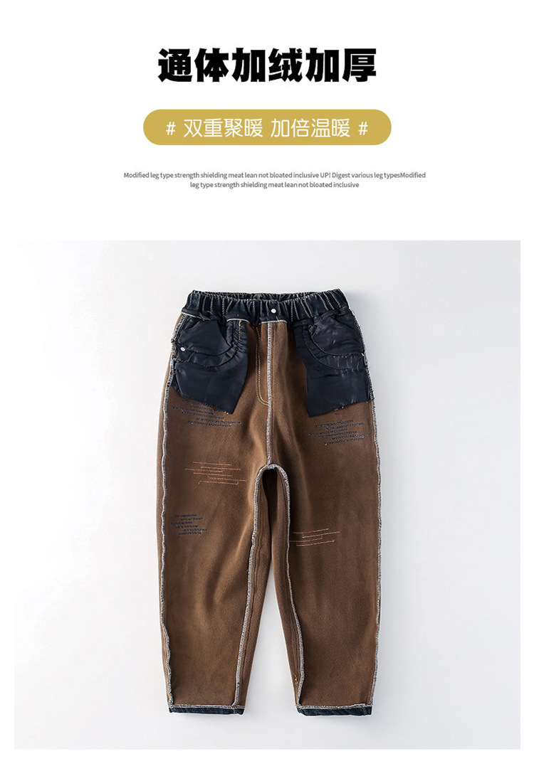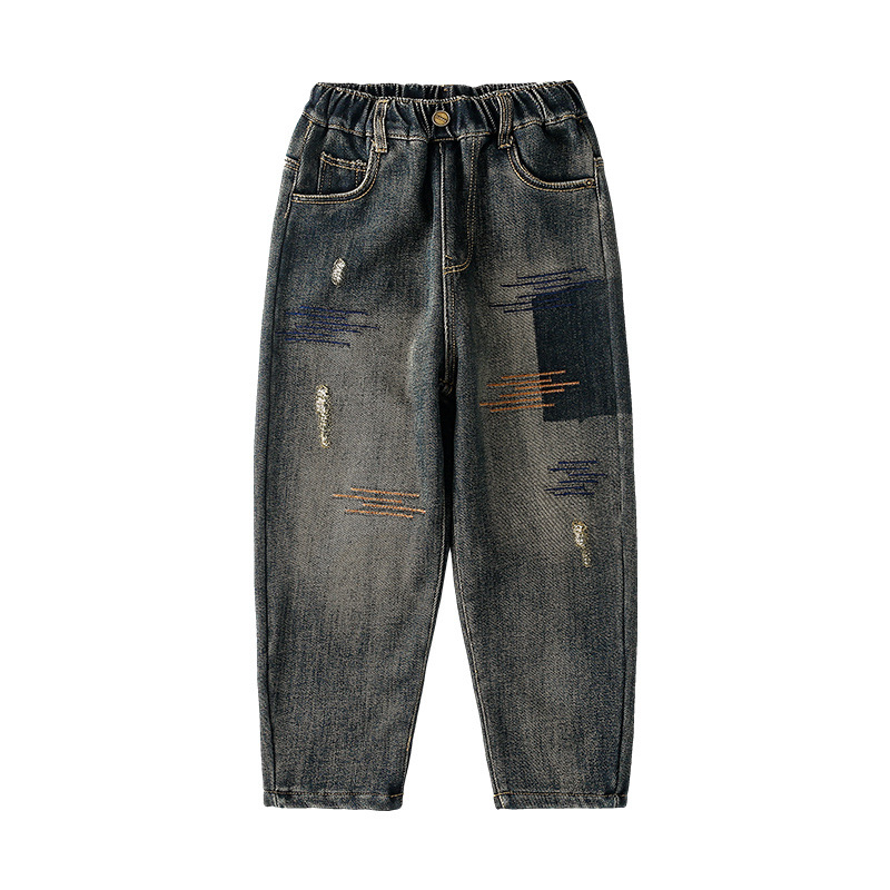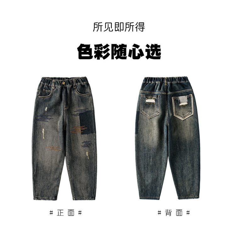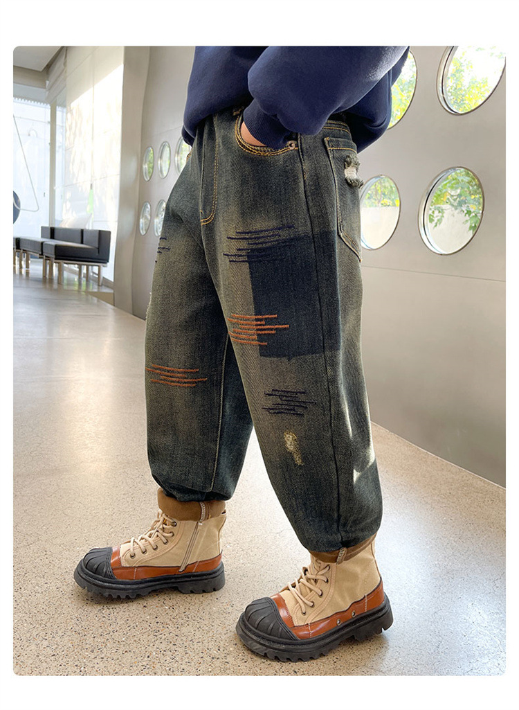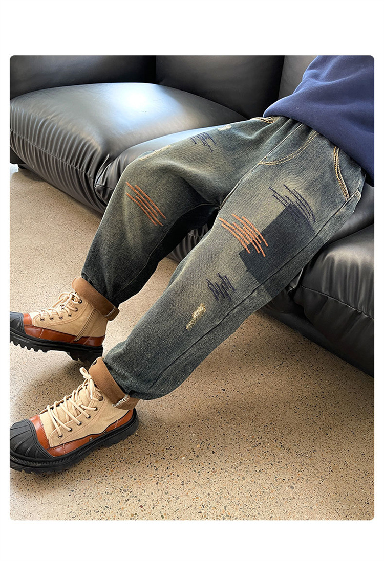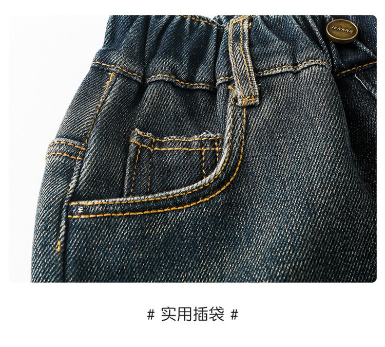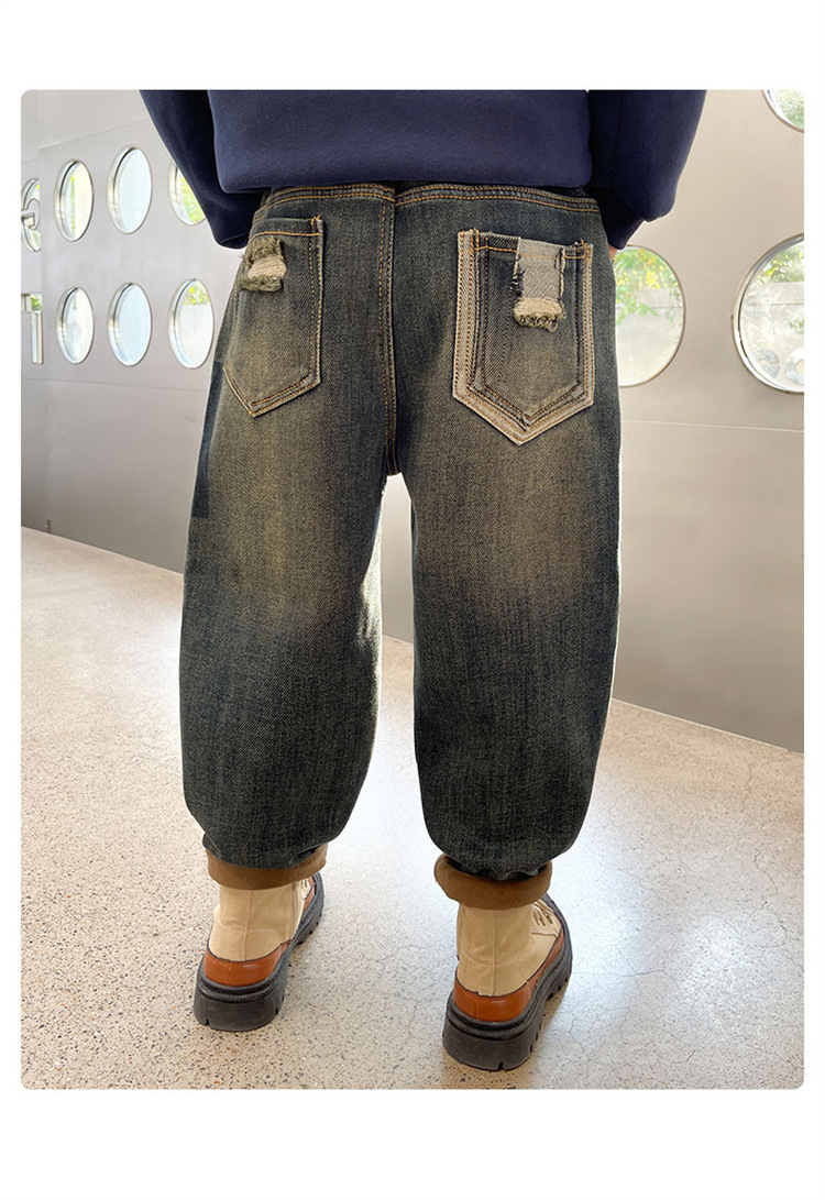 男童冬季条纹刺绣加绒牛仔裤2023新款大儿童装加厚保暖休闲长裤子